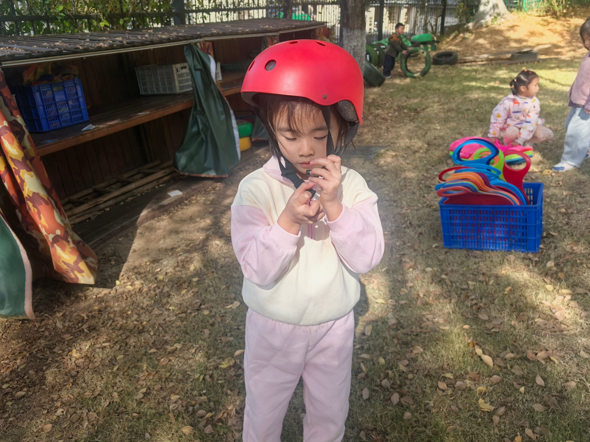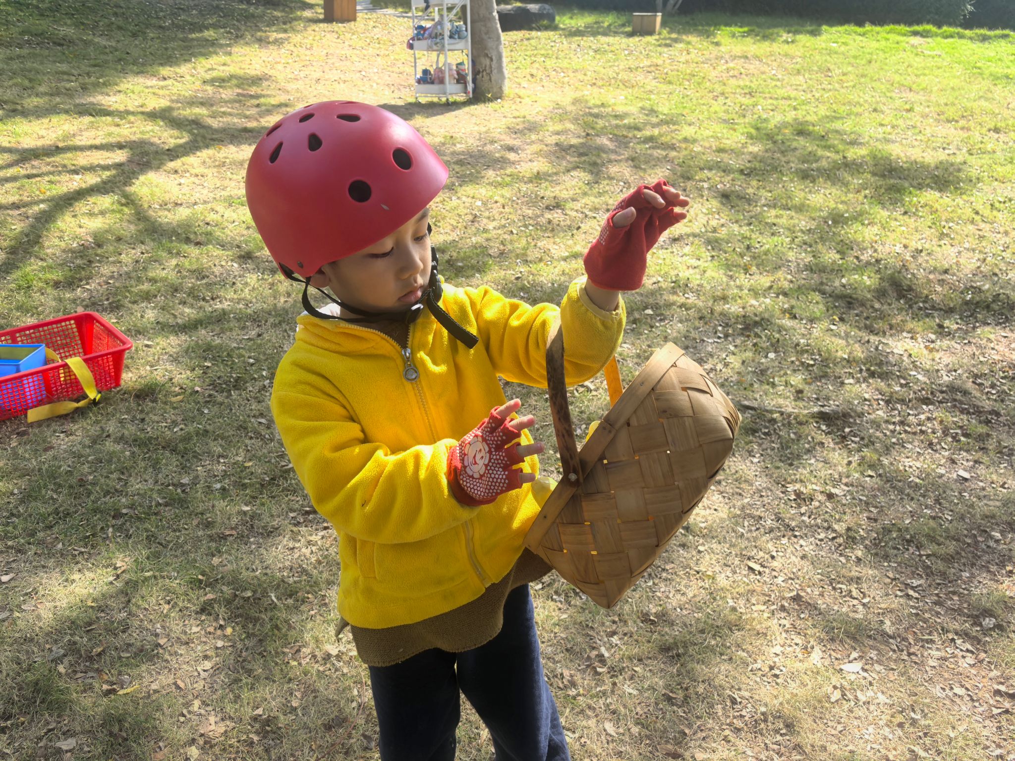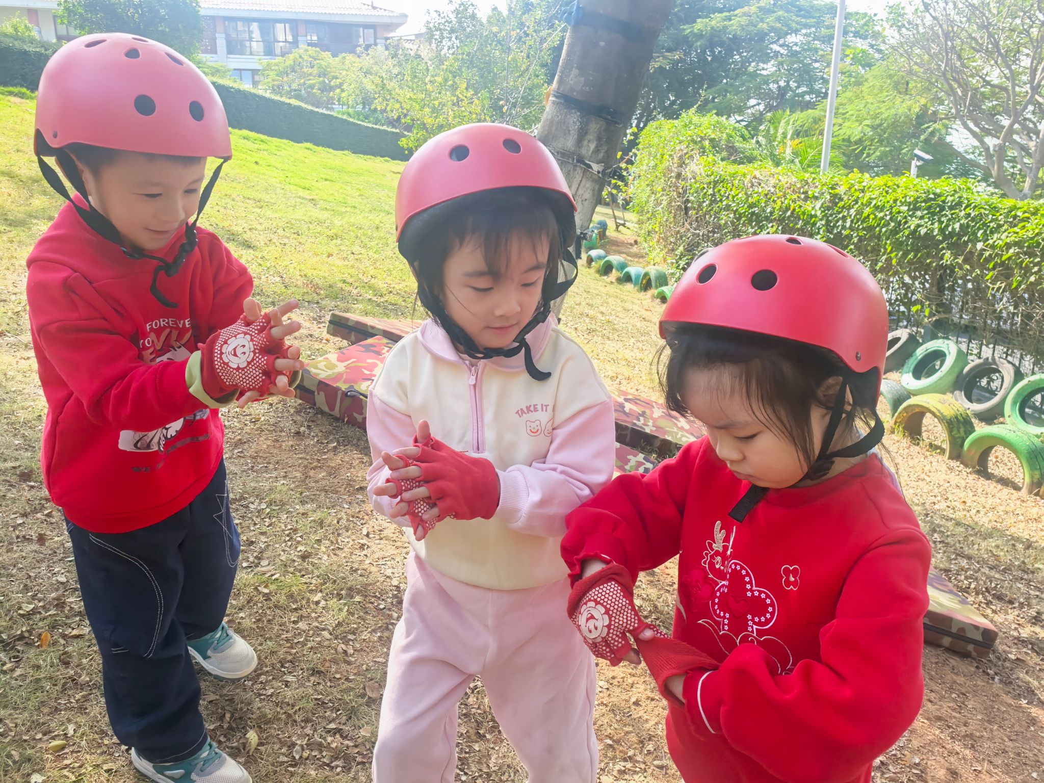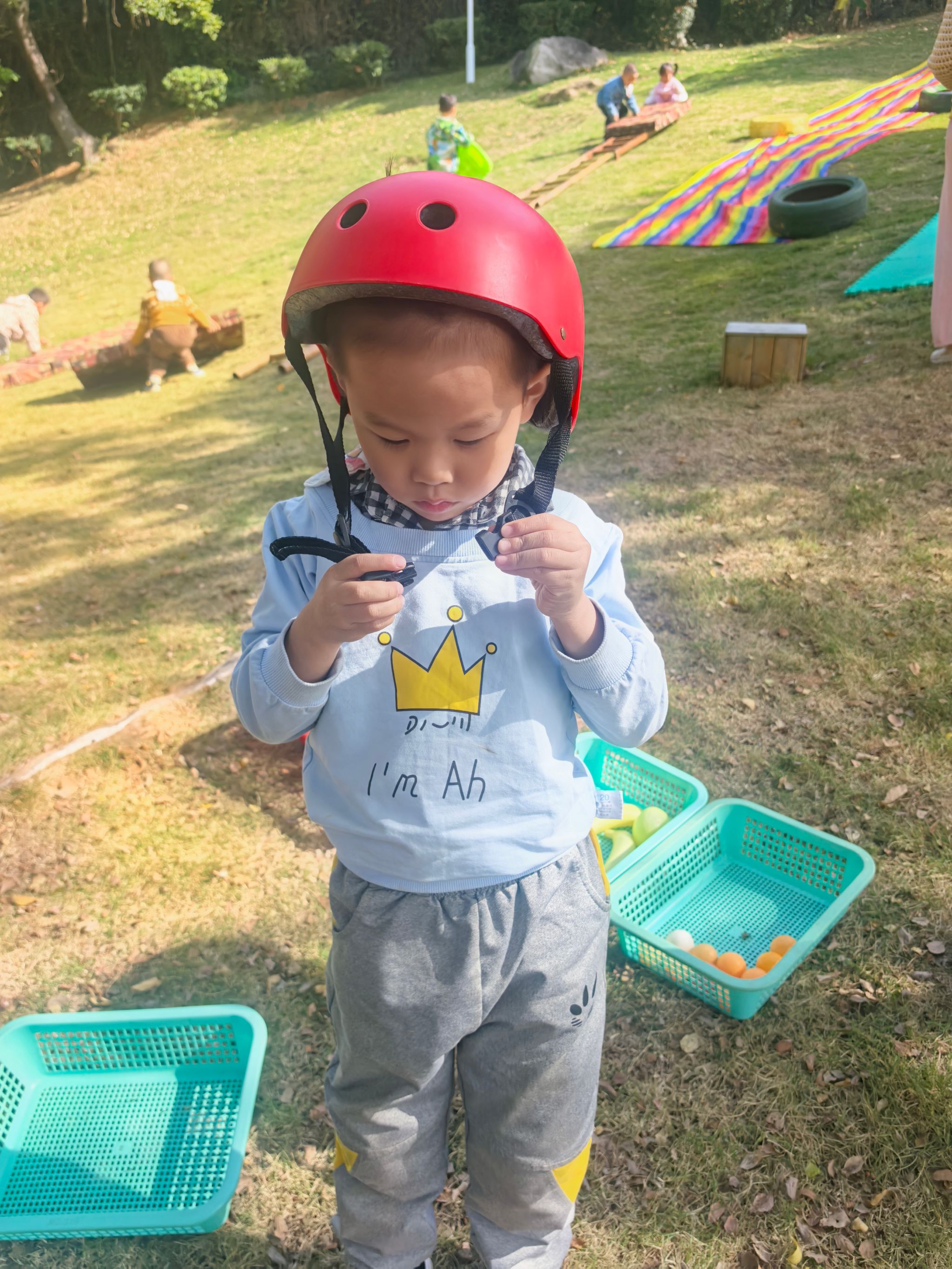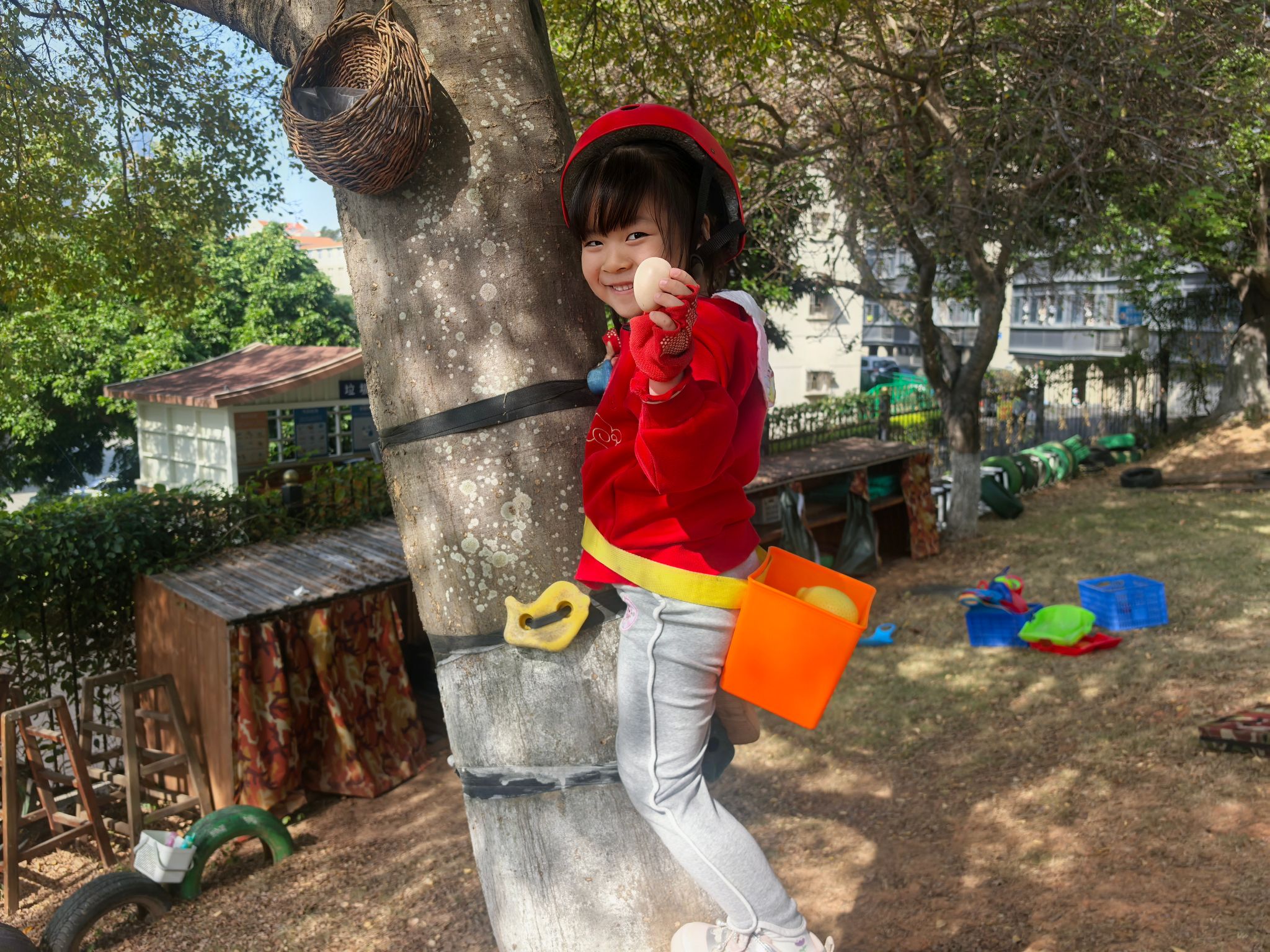 一切准备就绪,安全防护不能少!孩子们有序戴上头盔、穿好手套,背上可爱的小背篓,眼神里满是期待与兴奋。在老师的安全监护和鼓励下,大家勇敢地踏上“攀爬之旅”:有的紧紧抓住树干稳步向上,有的借助轮胎和梯子寻找支点,遇到困难时互相加油打气。爬到心仪的高度后,孩子们脸上绽放出自豪的笑容,有的还会小心翼翼地捡拾一片落叶、一颗小果子放进背篓,感受自然的馈赠。