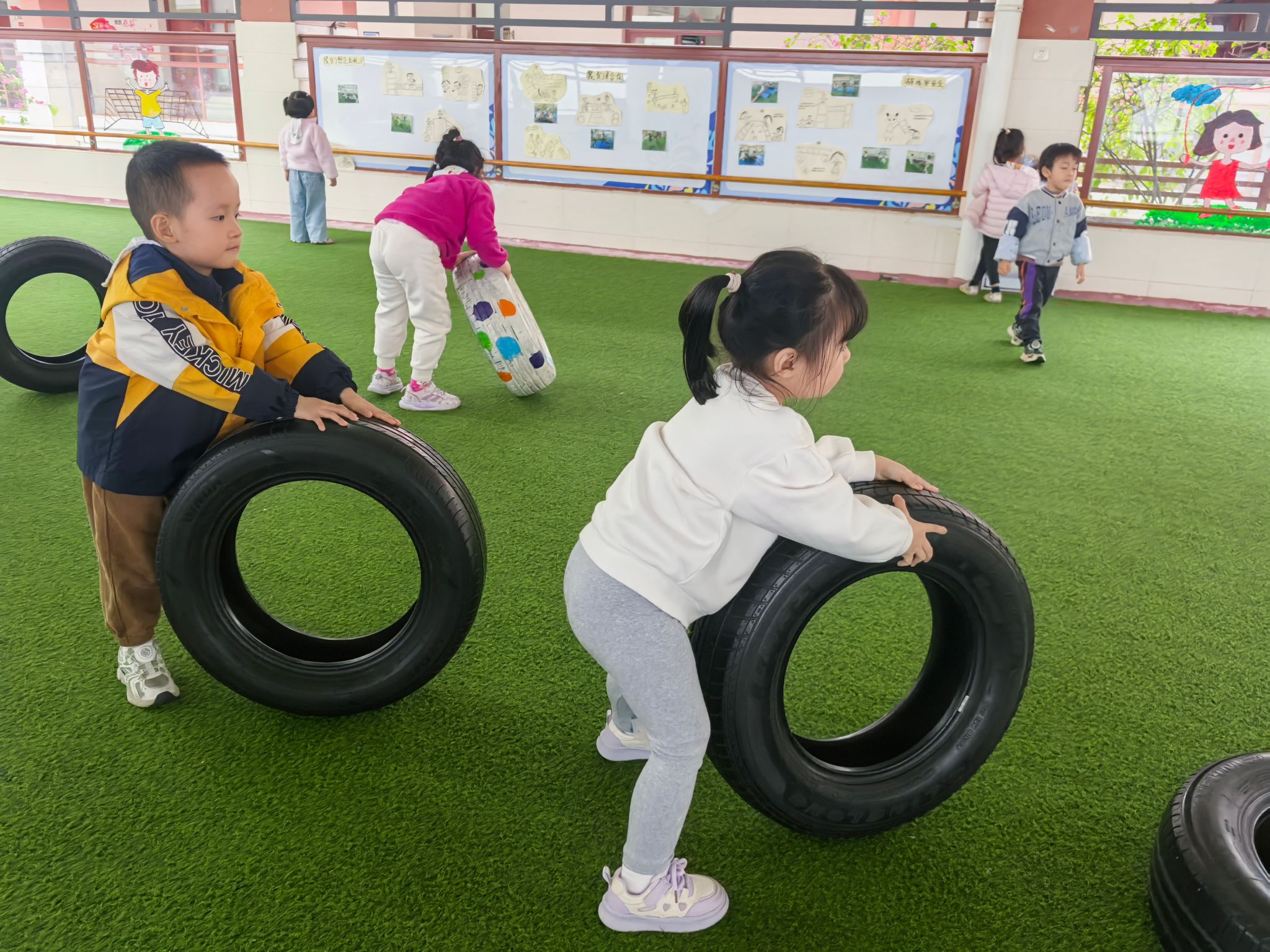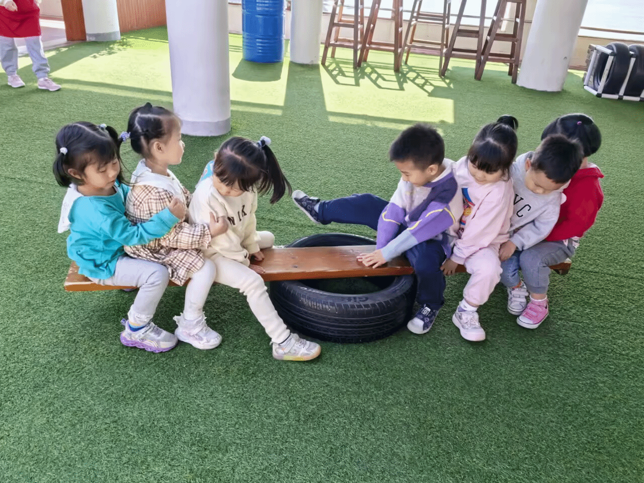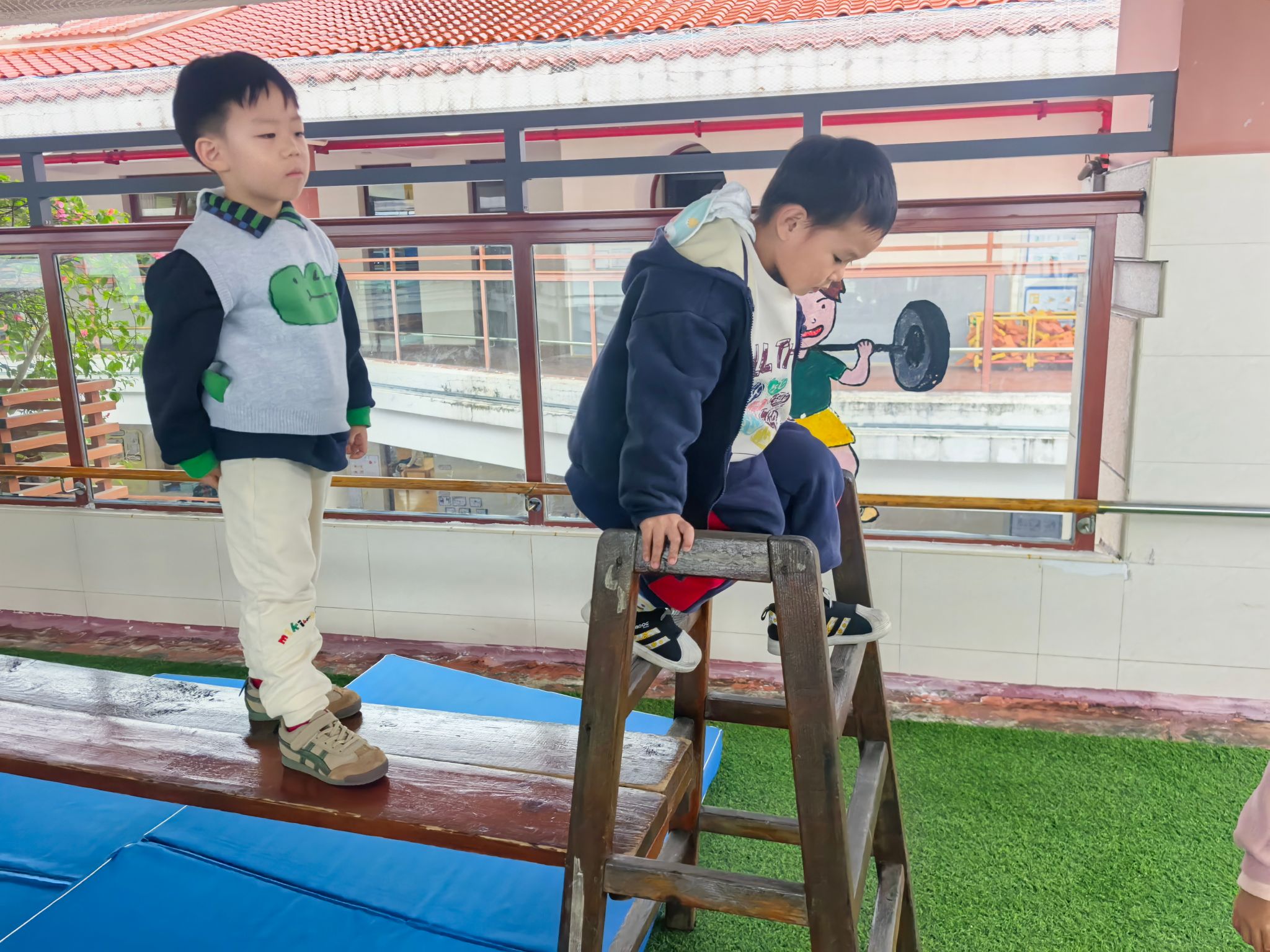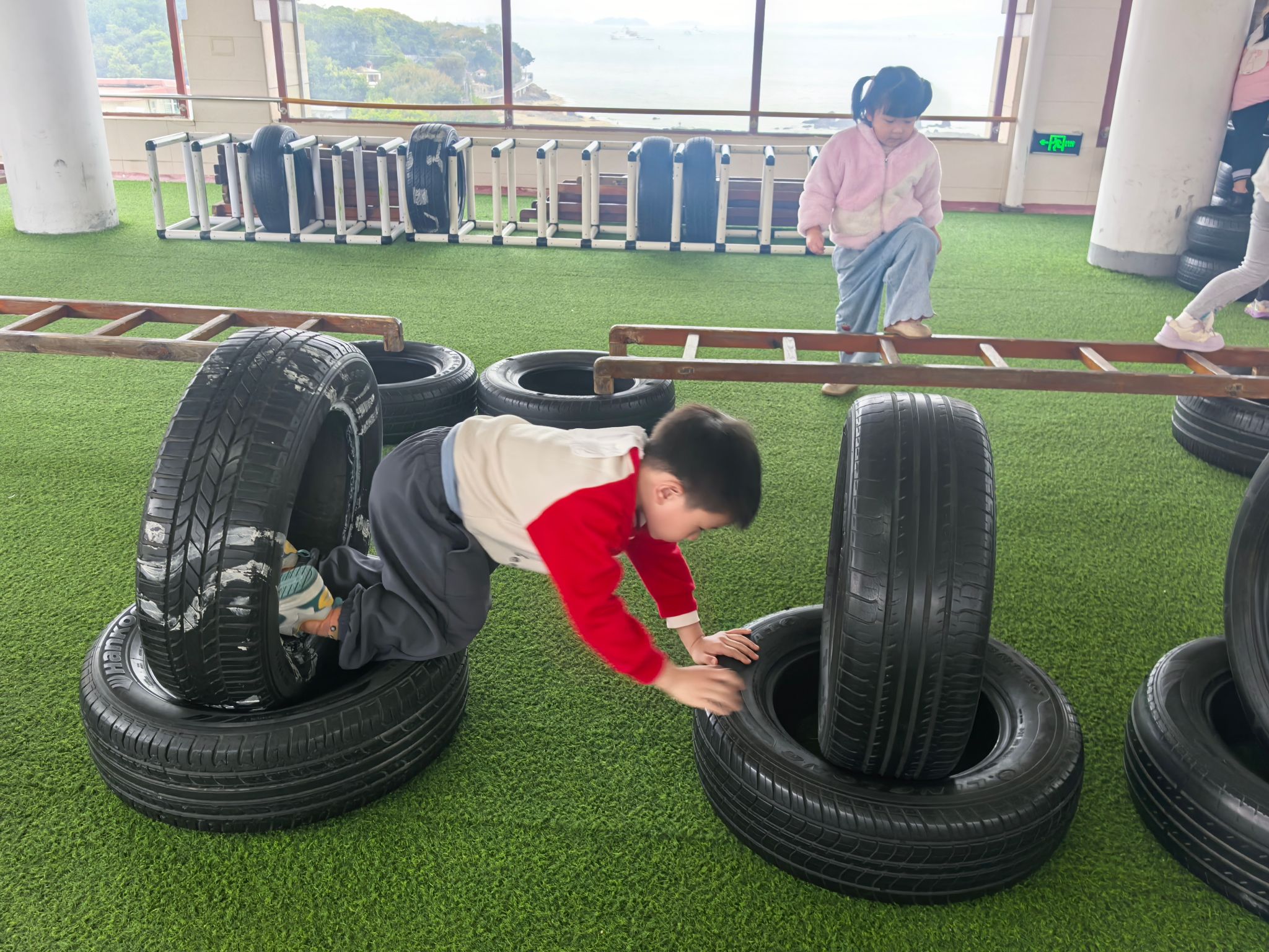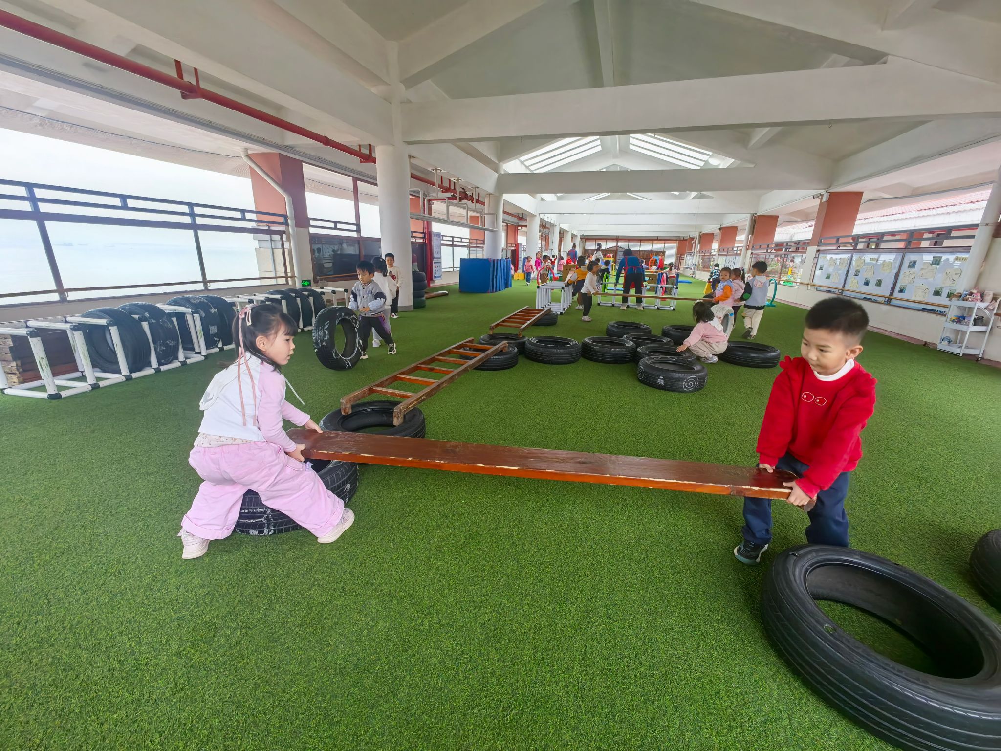 最惊喜的是孩子们的奇思妙想!他们将轮胎与梯子巧妙组合,拼出创意十足的“小山坡”造型,还设计出翘翘板,玩出了新花样。这场天台冒险,不仅锻炼了孩子们的身体协调性,更让合作与创新的种子在欢声笑语中生根发芽。