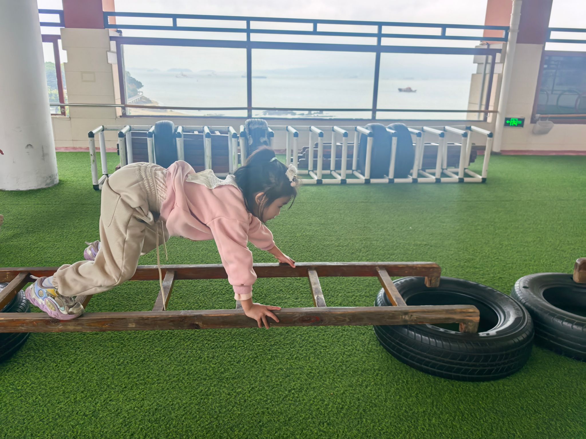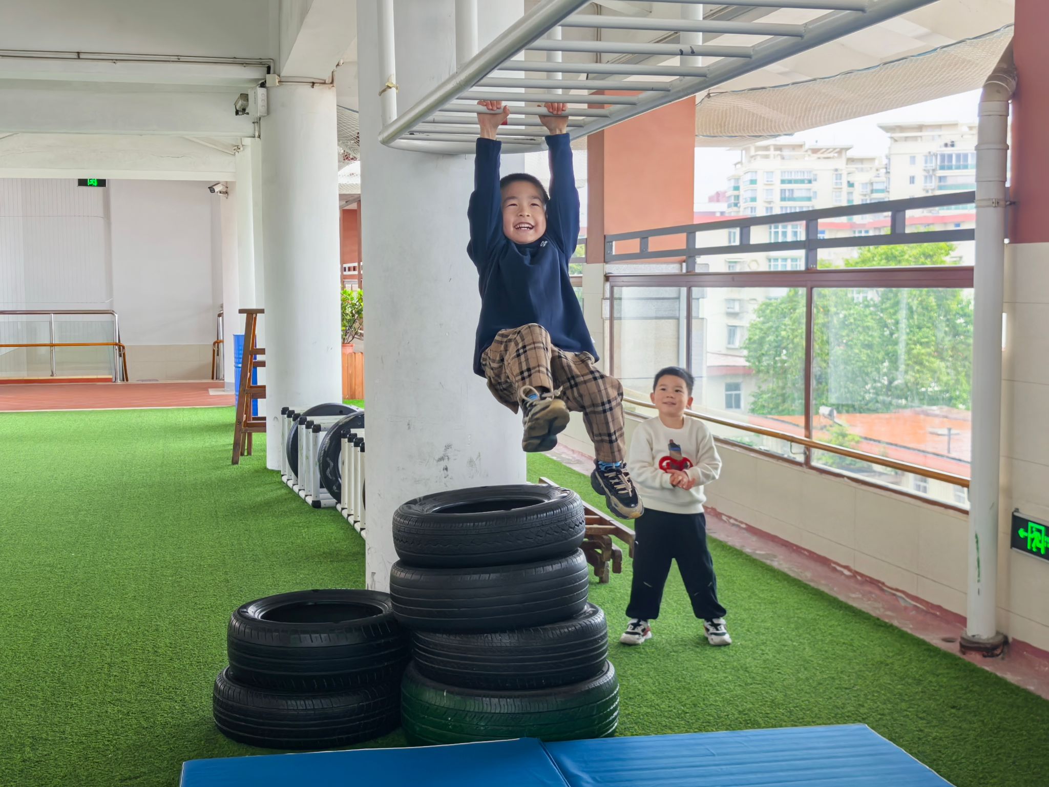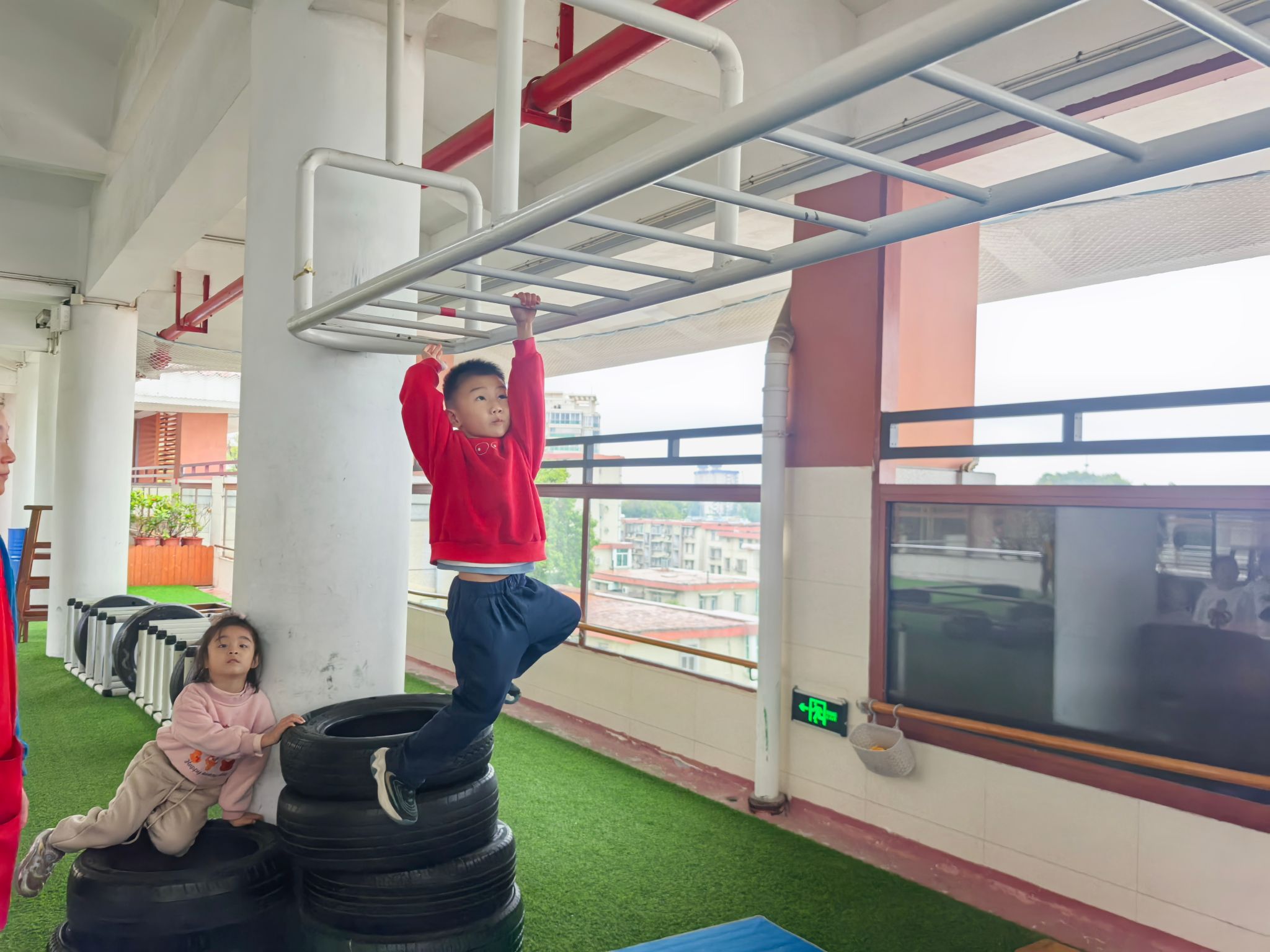梯子搭成攀爬通道,孩子们手脚并用向上爬;轮胎连成独木桥,大家小心翼翼稳步走;钻过轮胎山洞时,阵阵笑声洒满天台。单杠上的引体向上、攀爬架上的登高望远,更是让孩子们的力量与勇气尽情迸发。