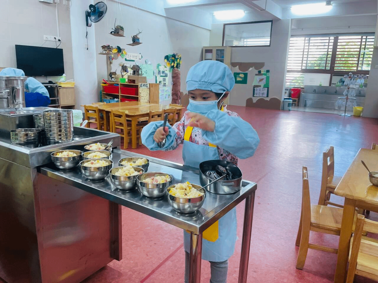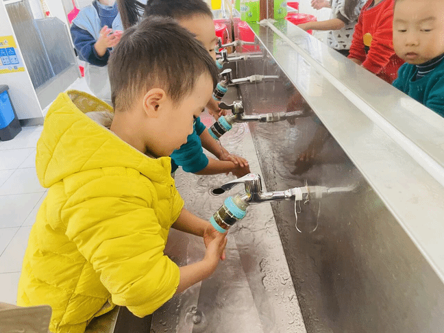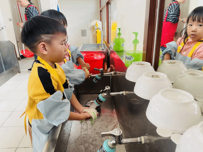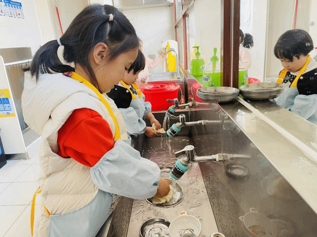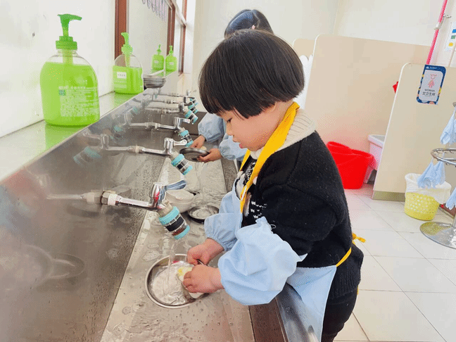 午餐时,小小值日生忙碌的身影最亮眼,他们数着人数摆盘子、放擦嘴毛巾,动作有模有样。餐后,还会主动整理桌面、清洗骨头碗,每一个动作都充满责任感。宝贝们都以当值日生、帮助同伴为荣,教室里到处都是“我来帮你”的温暖话语。