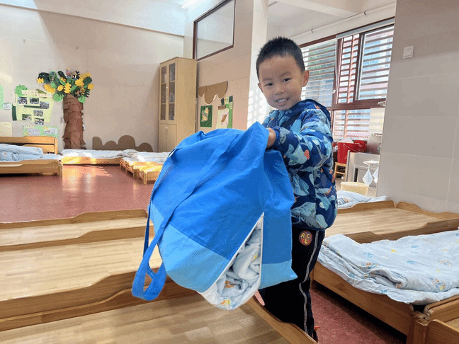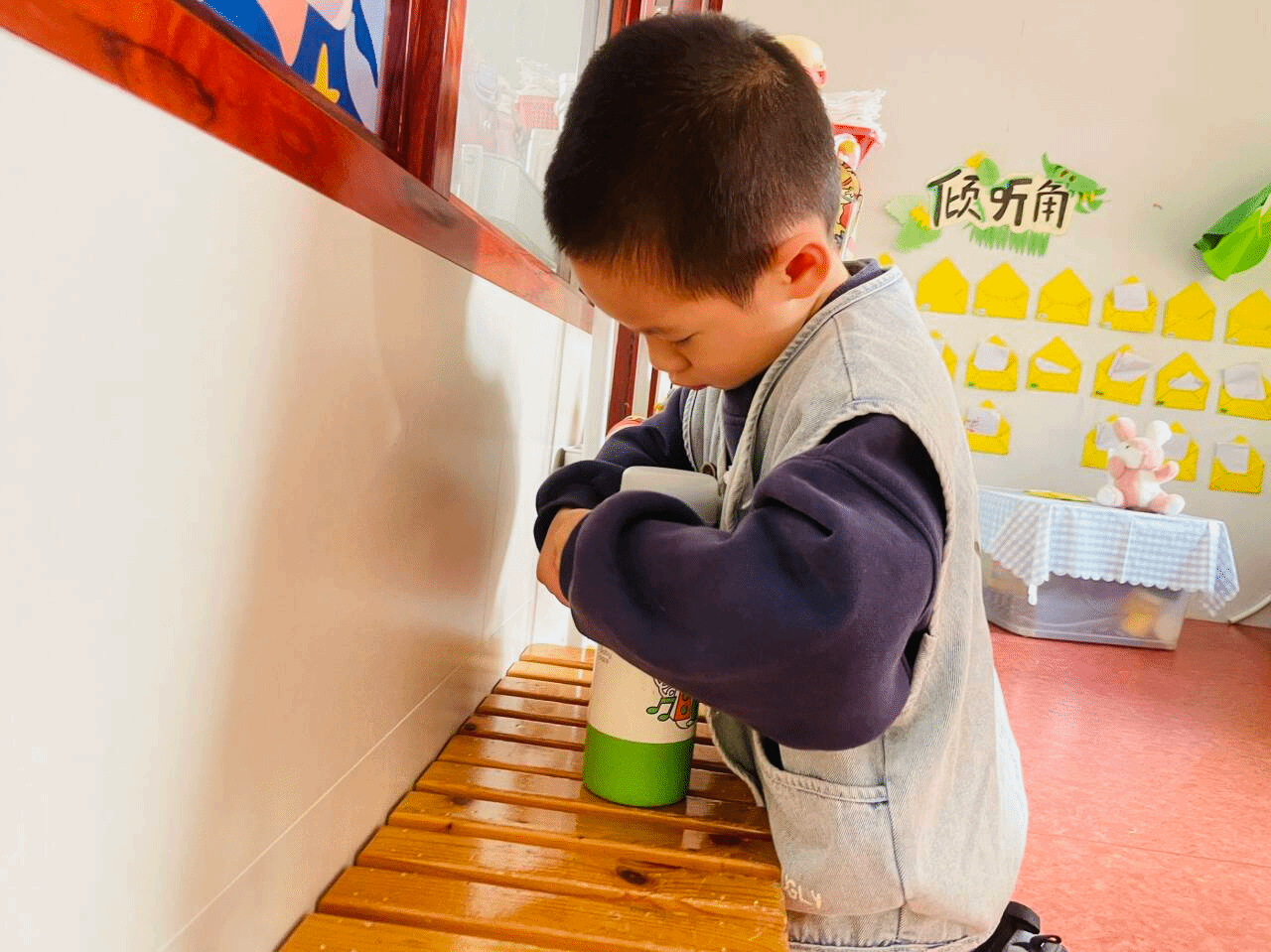 清晨入园,小宝贝们第一件事就是和自己的保温壶“互动”——小手稳稳握住壶盖,轻轻一拧就能打开,接好温水后,还会认真地把水杯绳一圈圈绕在瓶身上,摆得整整齐齐像列队的小士兵。放下书包,大家又变身“整理小达人”,自己铺开软软的小被子,把小拖鞋摆进专属小格子,动作麻利又认真。
