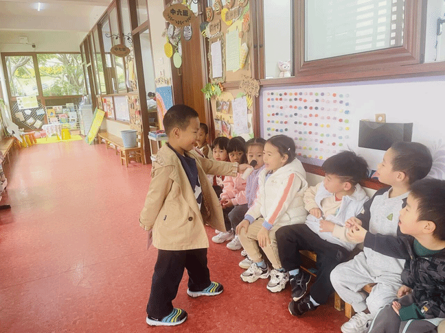 户外时间快到啦!孩子们自动排成小火车,你帮我垫汗巾,我帮你拉衣角,还主动跟着老师把户外玩具一一摆好,等待小伙伴们一起玩耍。谈话活动时,小值日生登场啦!他们拿着餐点图片大声播报:“今天有香香的米饭和甜甜的胡萝卜哦!”瞬间勾起大家的食欲。进餐前,值日生还会当“小老师”,检查小伙伴的袖子有没有拉上去,手把手教大家用七步洗手法把小手洗干净。