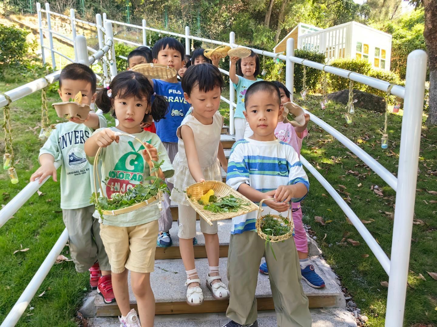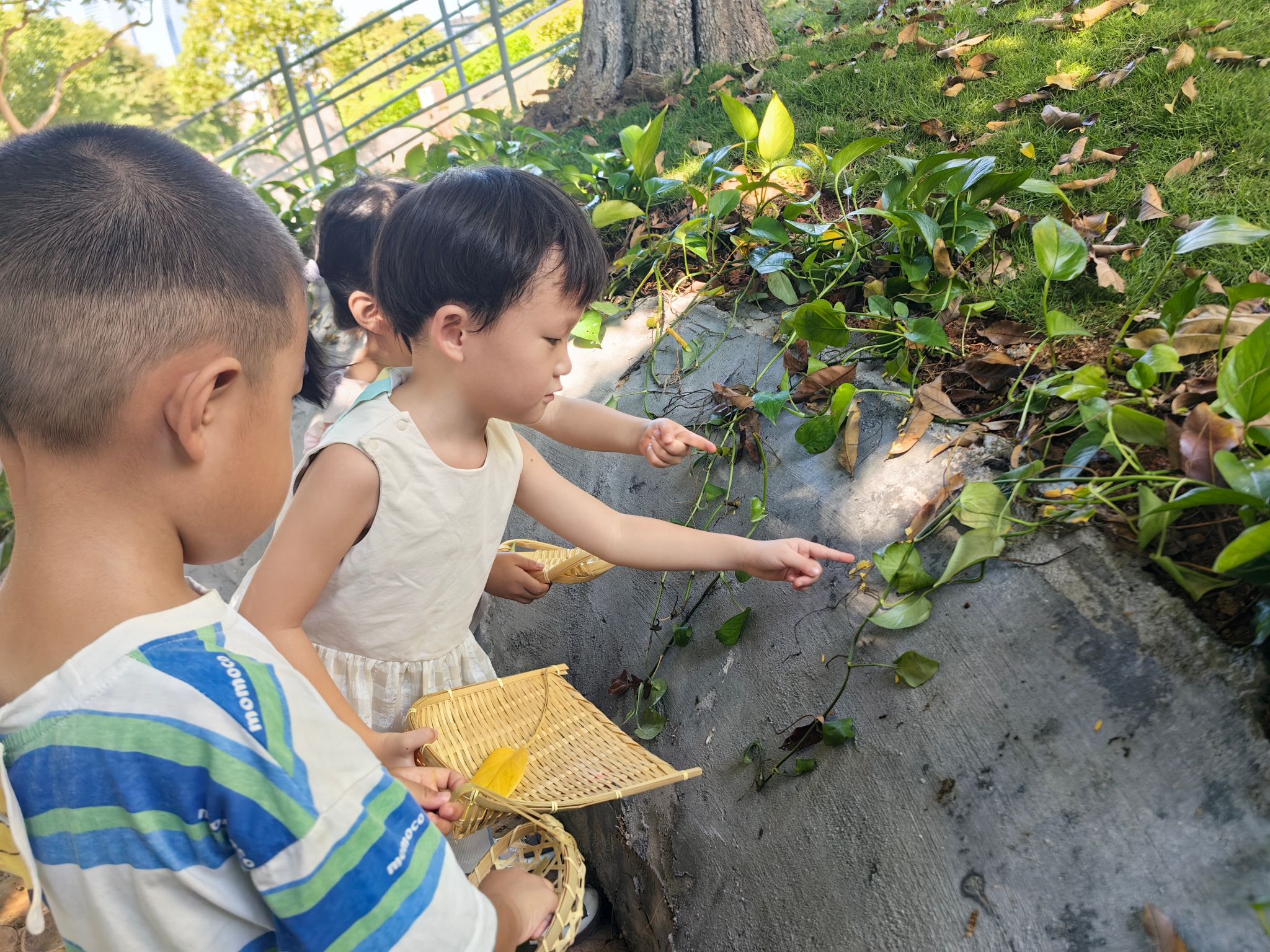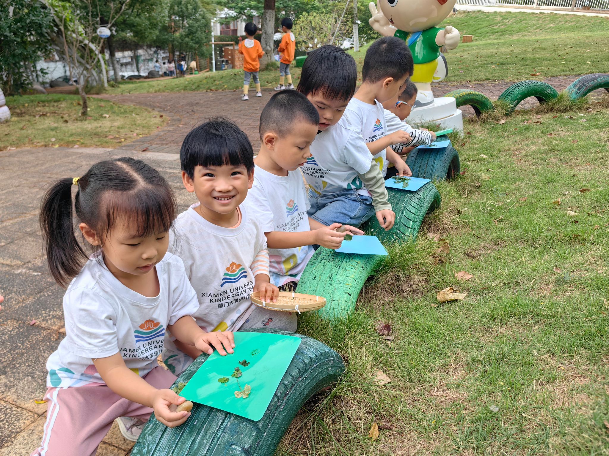 “山坡上有好多的果树,它们有没有颜色,我们去找答案吧!”孩子们走进幼儿园小山坡和厦大校园,小心翼翼收集杨桃树叶子、石榴叶子、三叶草、车前草、麦冬草、小野菊等“战利品”。