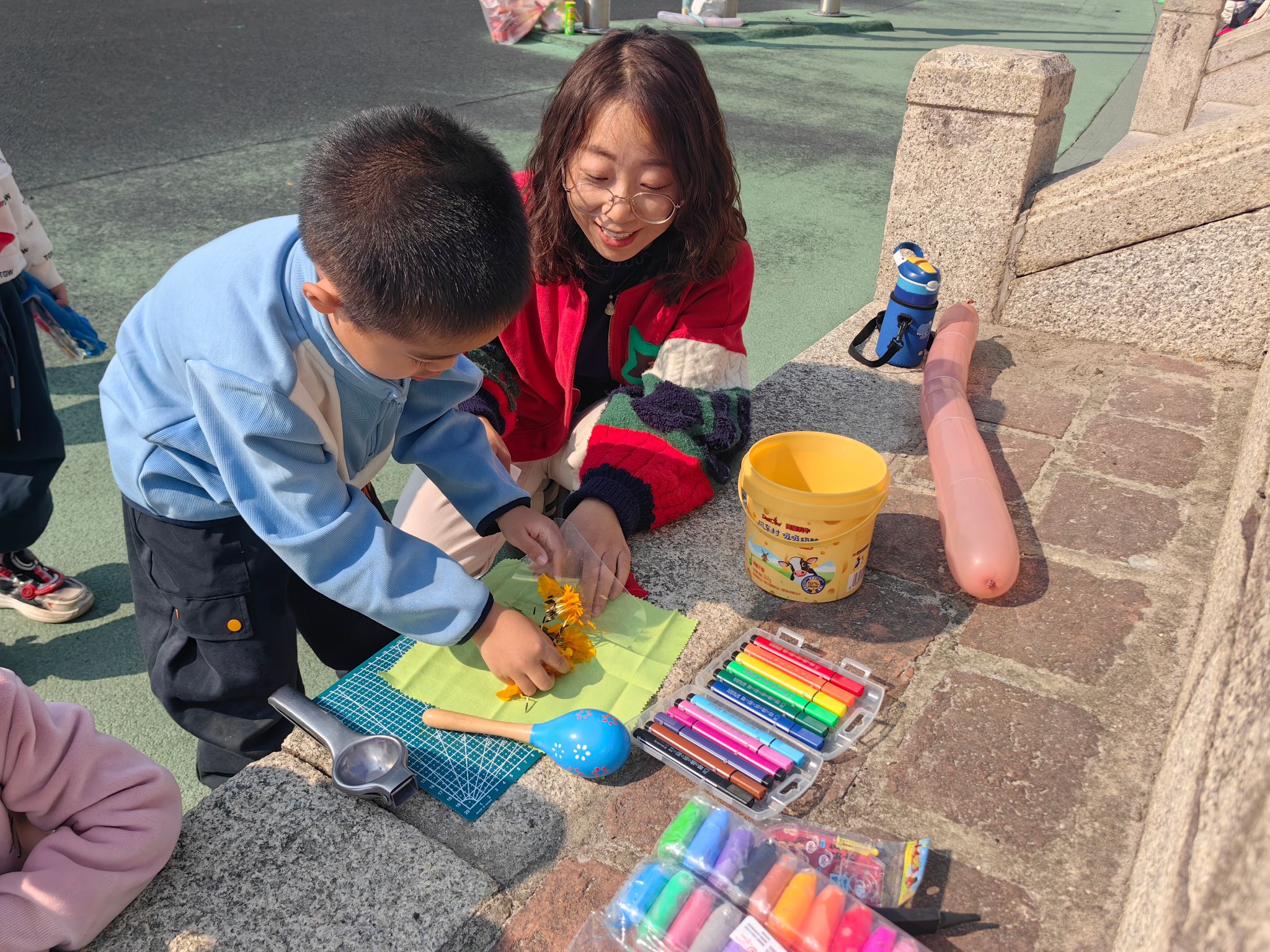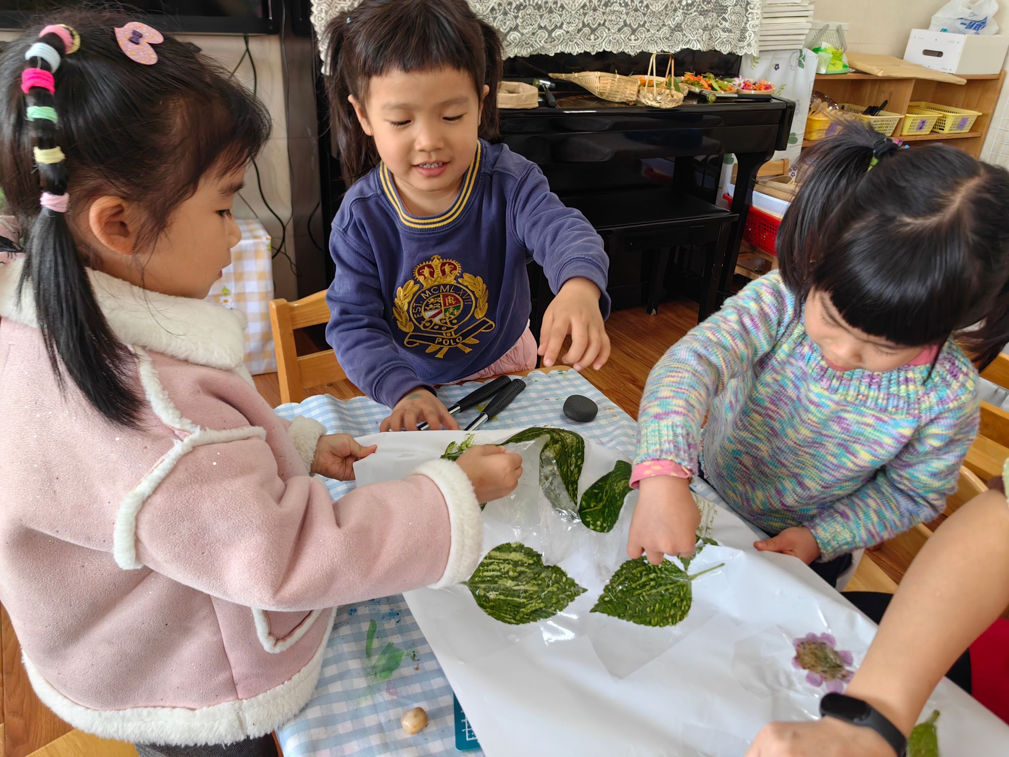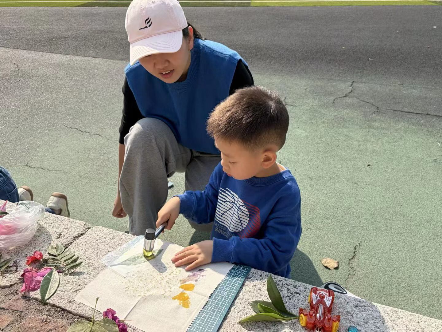我们还把这份乐趣延伸到周末,邀请家长和孩子一起走进自然收集草木,开展亲子敲染,让班级活动与家庭温情紧紧联结。