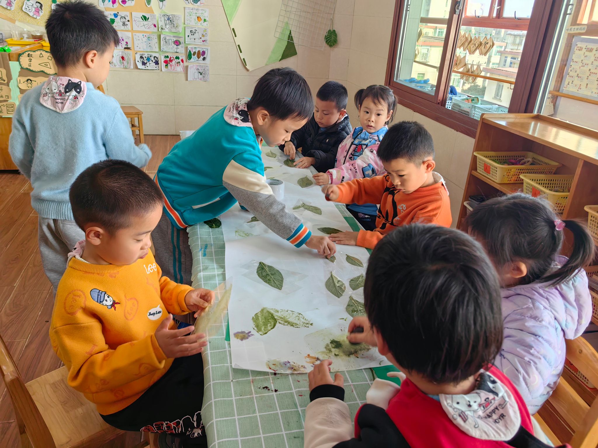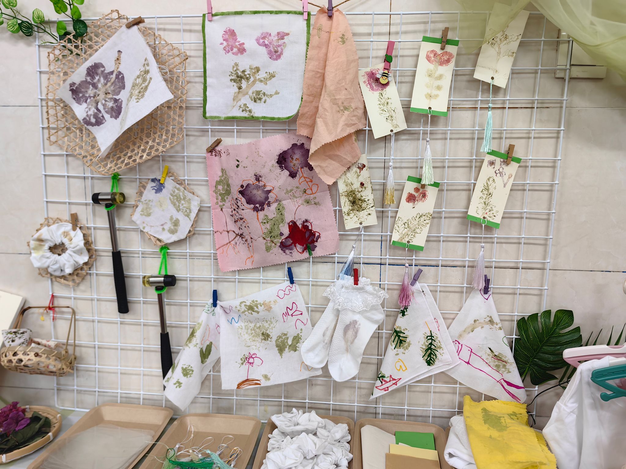 “能把颜色和形状留在布上吗?”乐兮的提问开启了“草木敲染”。孩子们铺草木、尝试敲锤,发现干叶、厚叶不出色,最终摸索出用新鲜薄叶均匀敲击的窍门,独一无二的作品陆续诞生……