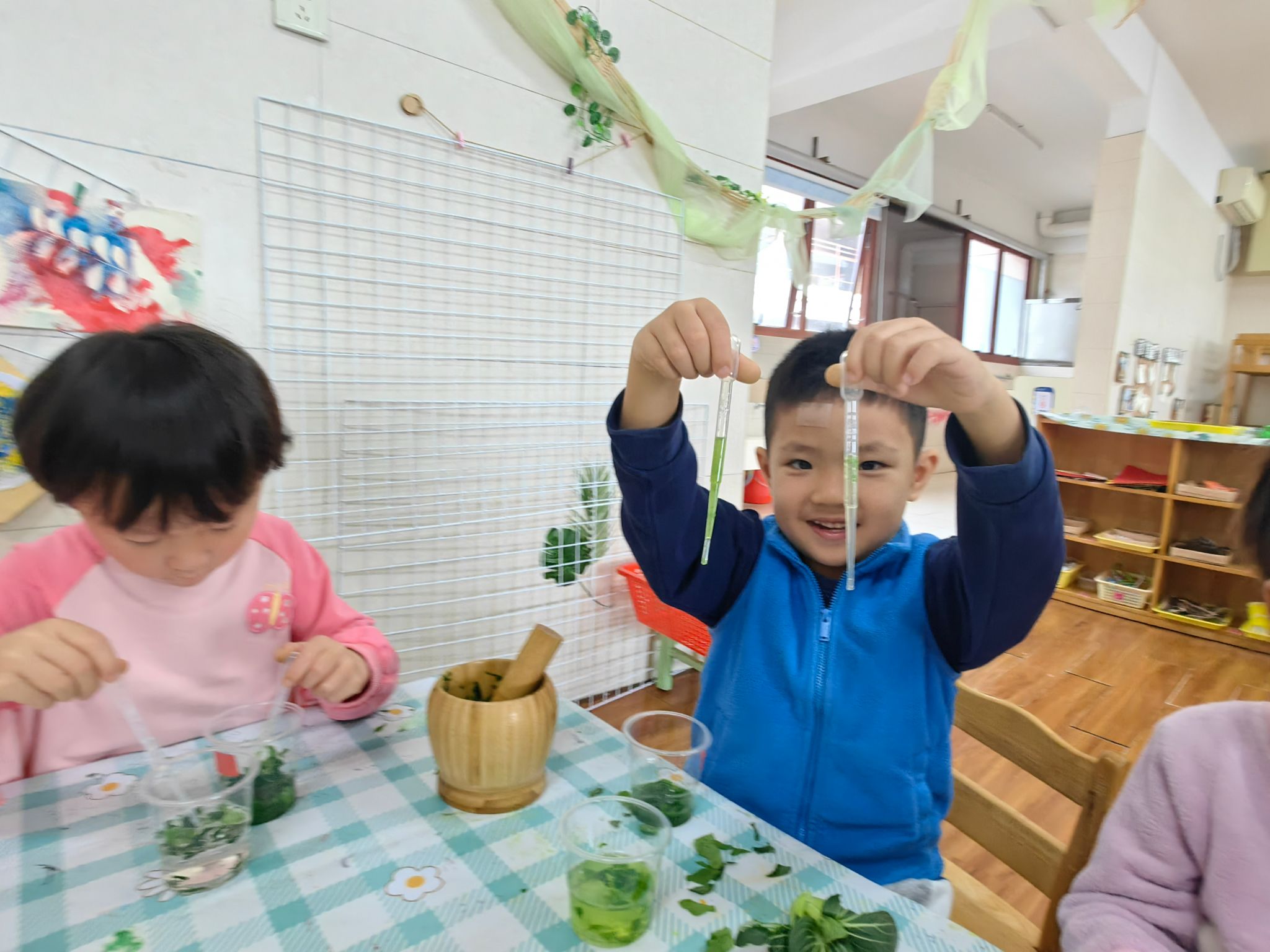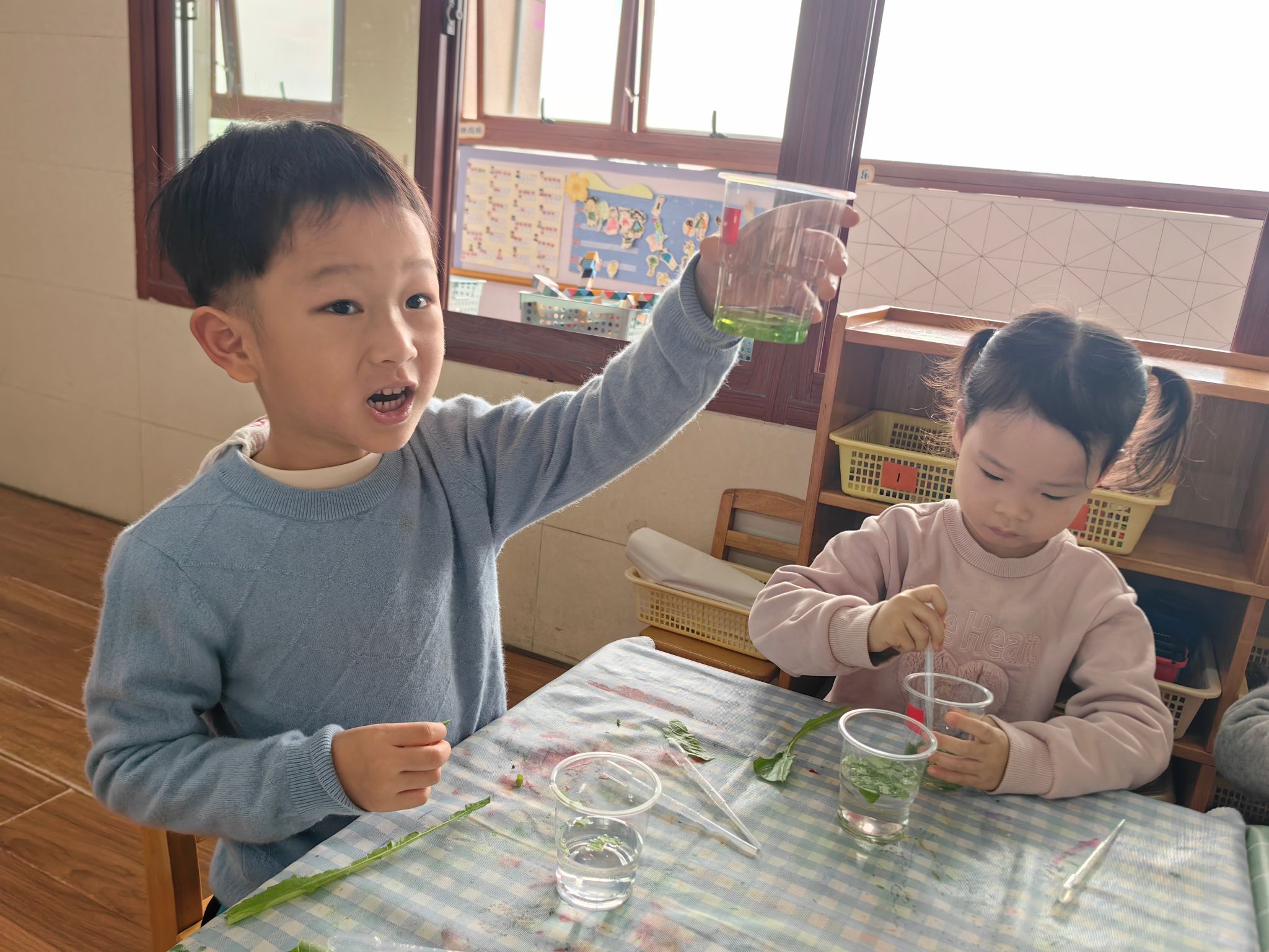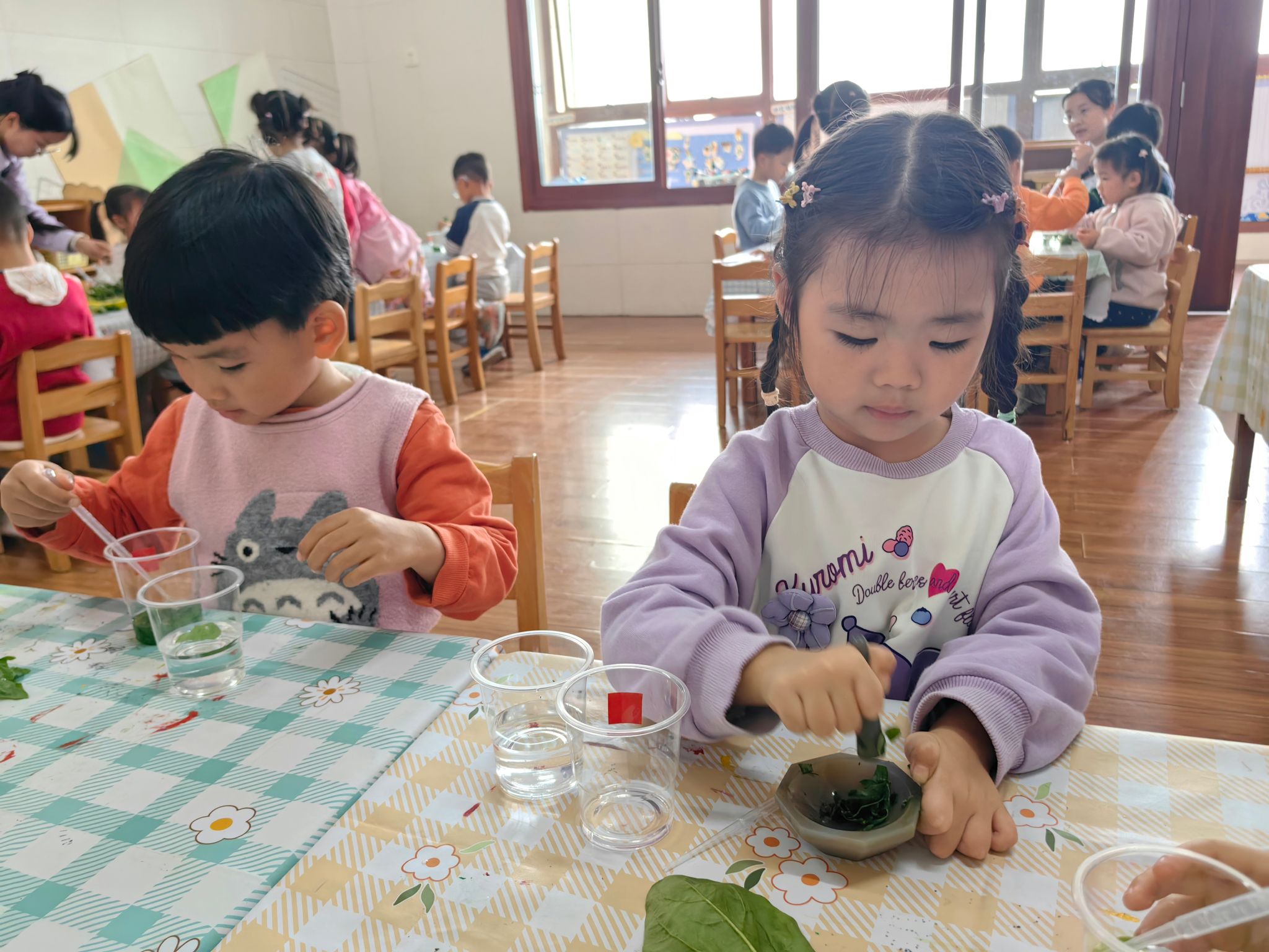 在亦宝妈妈指导下,孩子们剪碎菠菜叶泡进酒精,看着清澈酒精变成翠绿色,纷纷瞪大好奇的眼睛。“这是叶绿素小精灵,是叶子变绿的秘密法宝!”亦宝妈妈通俗易懂的讲解,揭开了植物颜色的奥秘。