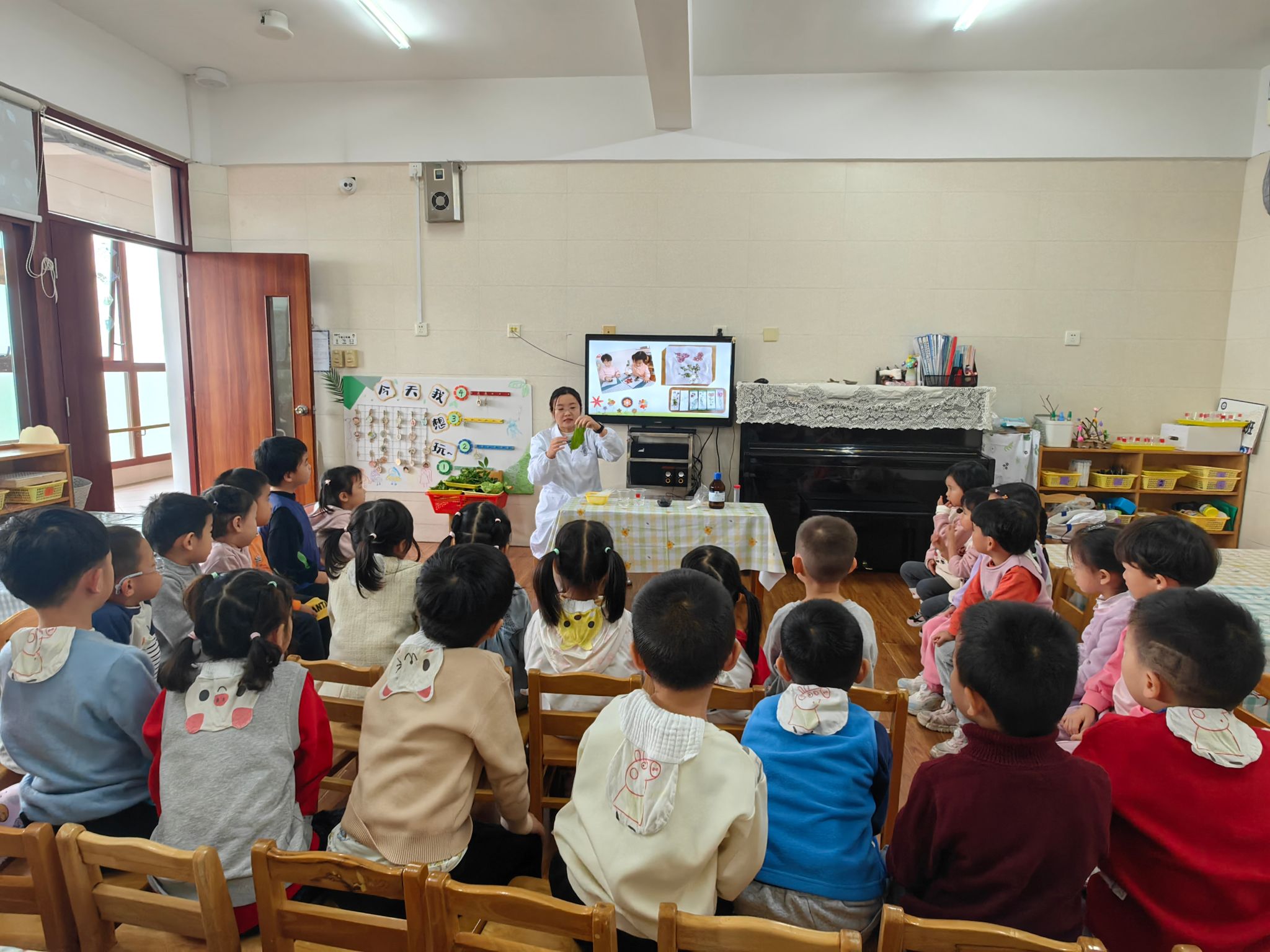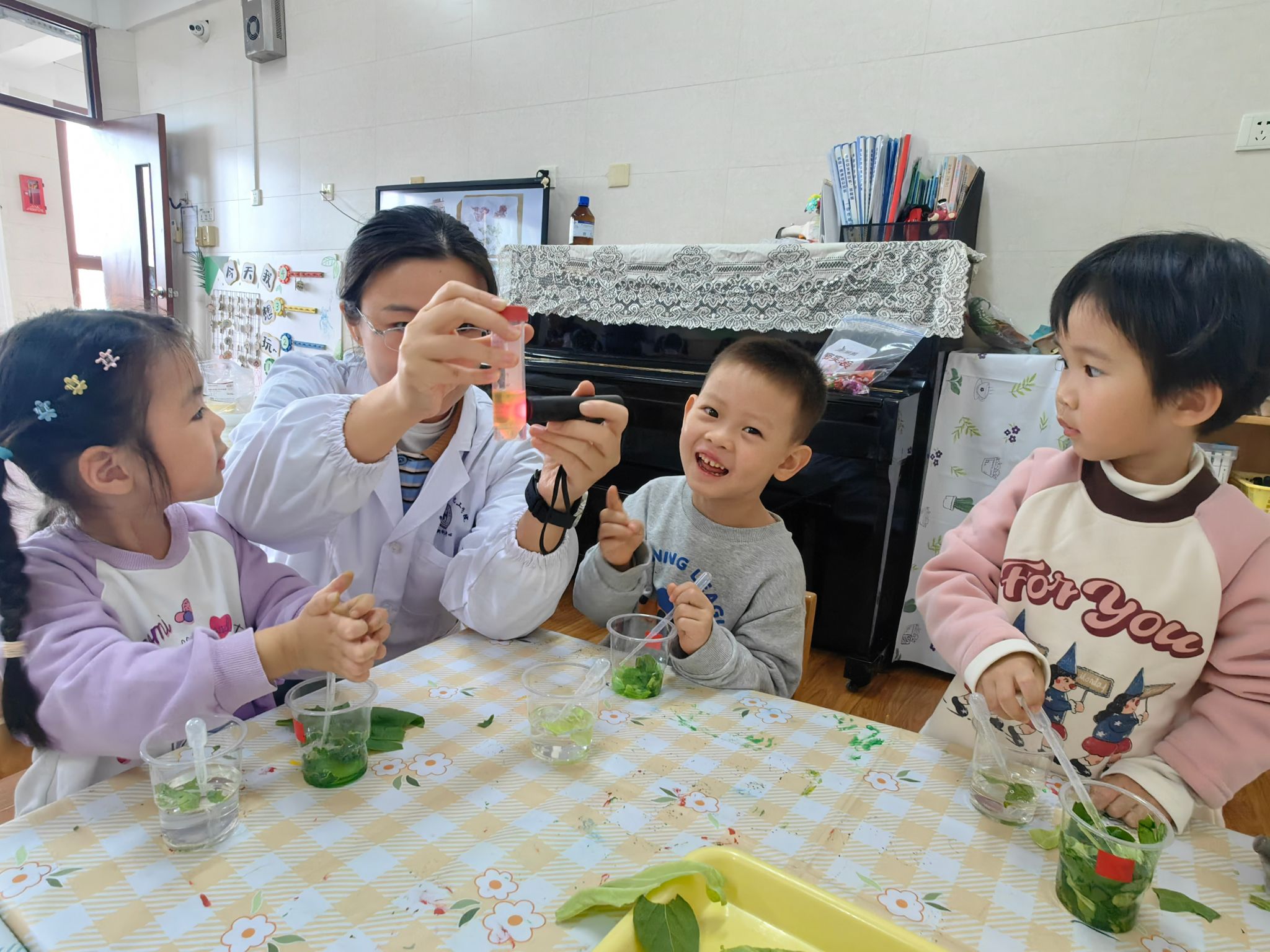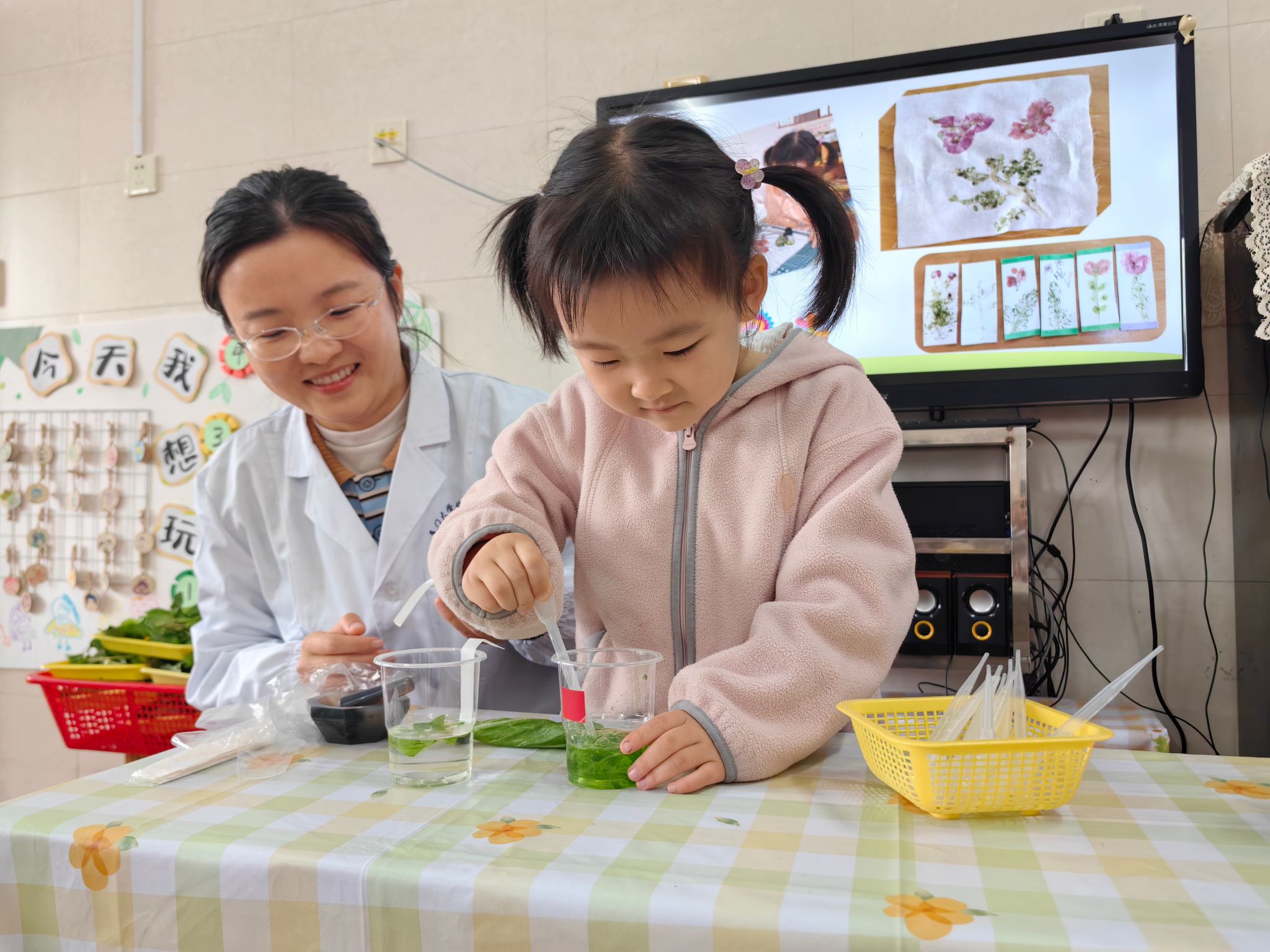 回到班级,孩子们刚展示“收获”就惊呼:“我的小手变绿啦!”“颜色会一直留着吗?”一连串疑问接踵而至,我们邀请厦大化工学院的亦宝妈妈,带来一场有趣的科学探秘课。
