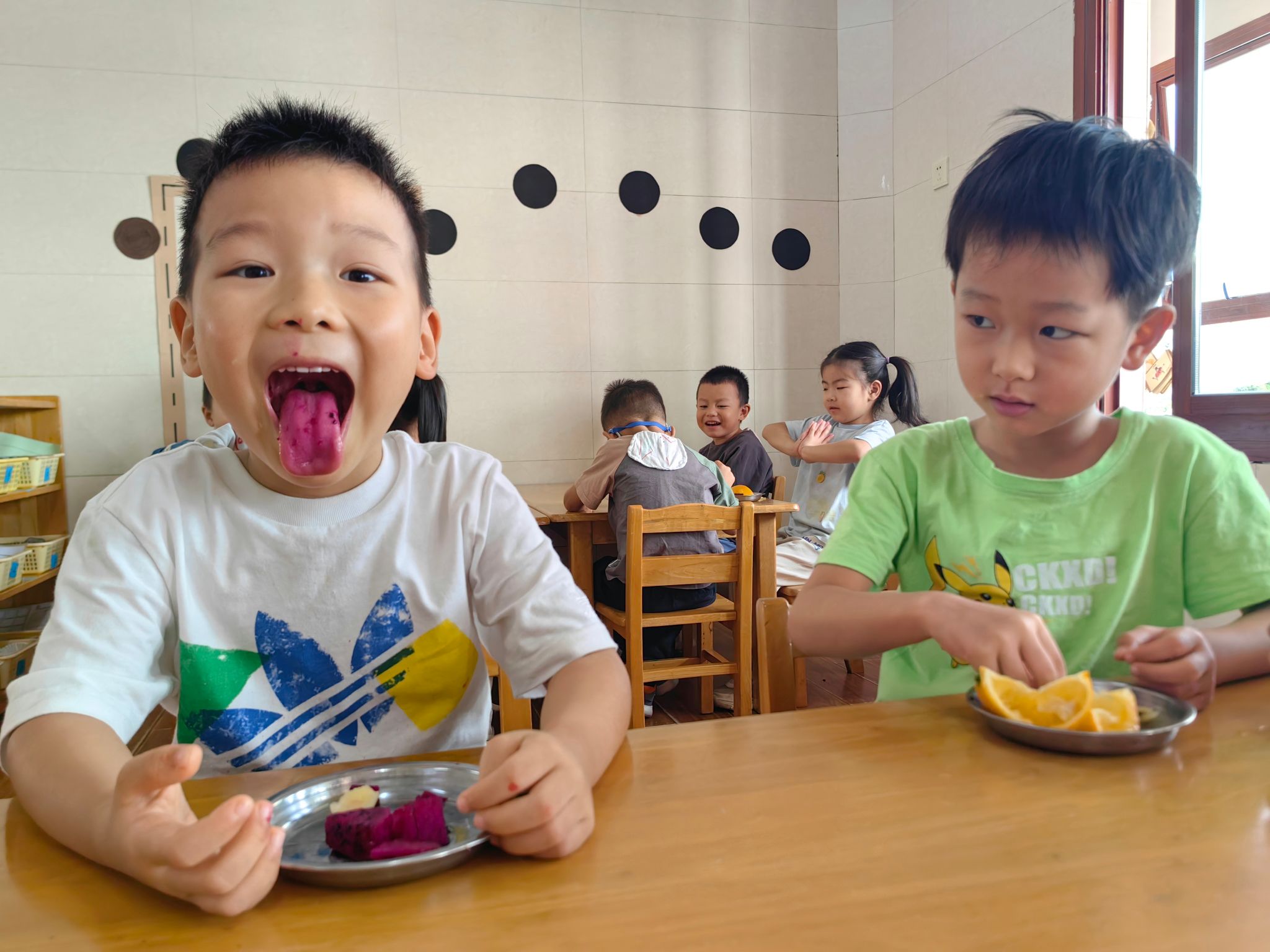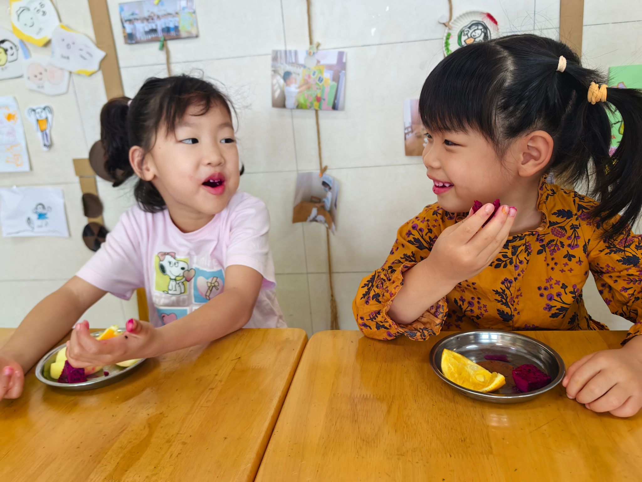 午后点心时光,中二班孩子们开心地吃着火龙果。花花指着小伙伴的红嘴巴哈哈大笑,大家纷纷发现手指、衣服都沾了红色,叽叽喳喳追问:“水果里的红色藏在哪里呀?”这份好奇,开启了一场自然探索之旅。