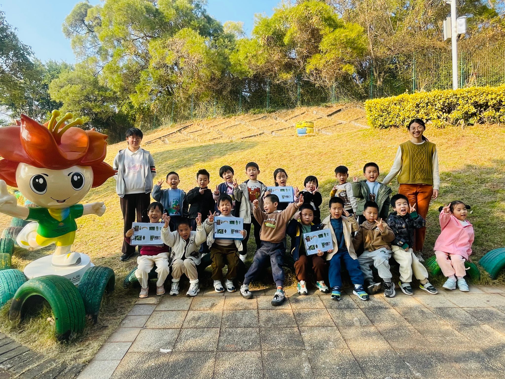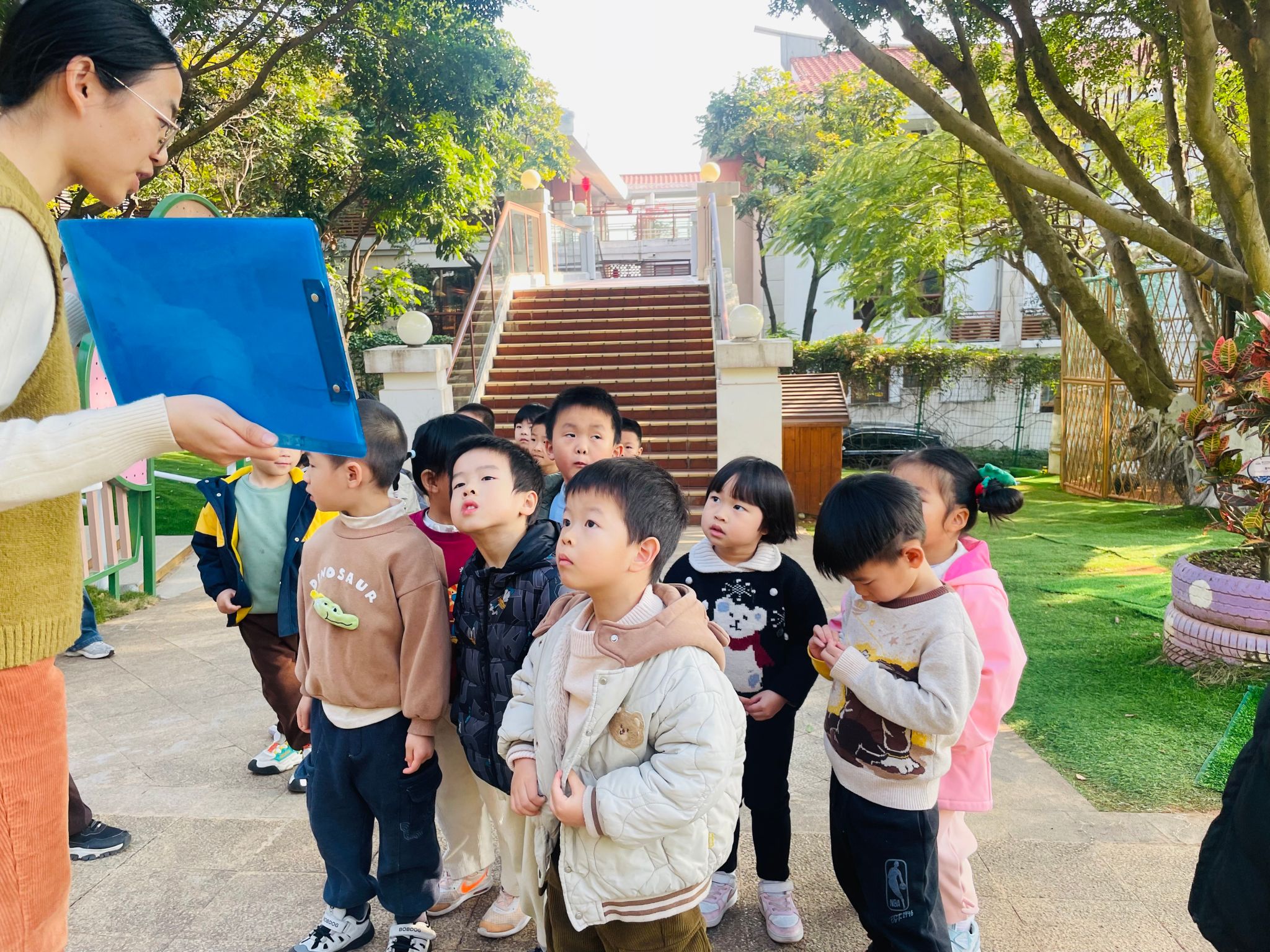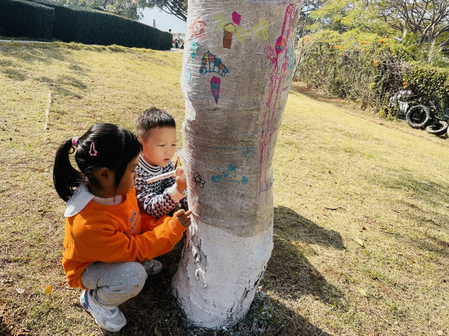 从这天起,小山坡成了中六班的 “秘密基地”。游戏时,孩子们会绕到大树下,把保鲜膜轻轻缠在树干上,用丙烯笔给大树画满彩虹色的 “花衣服”;晒太阳时,大家掏出助教姐姐留下的图册,凑在一起翻:“你看!我昨天找到的树叶和书上的一模一样!” 原来大自然的小秘密,就藏在每一片叶子里,等着小不点们踮起脚尖,去发现更多奇妙的魔法呢。