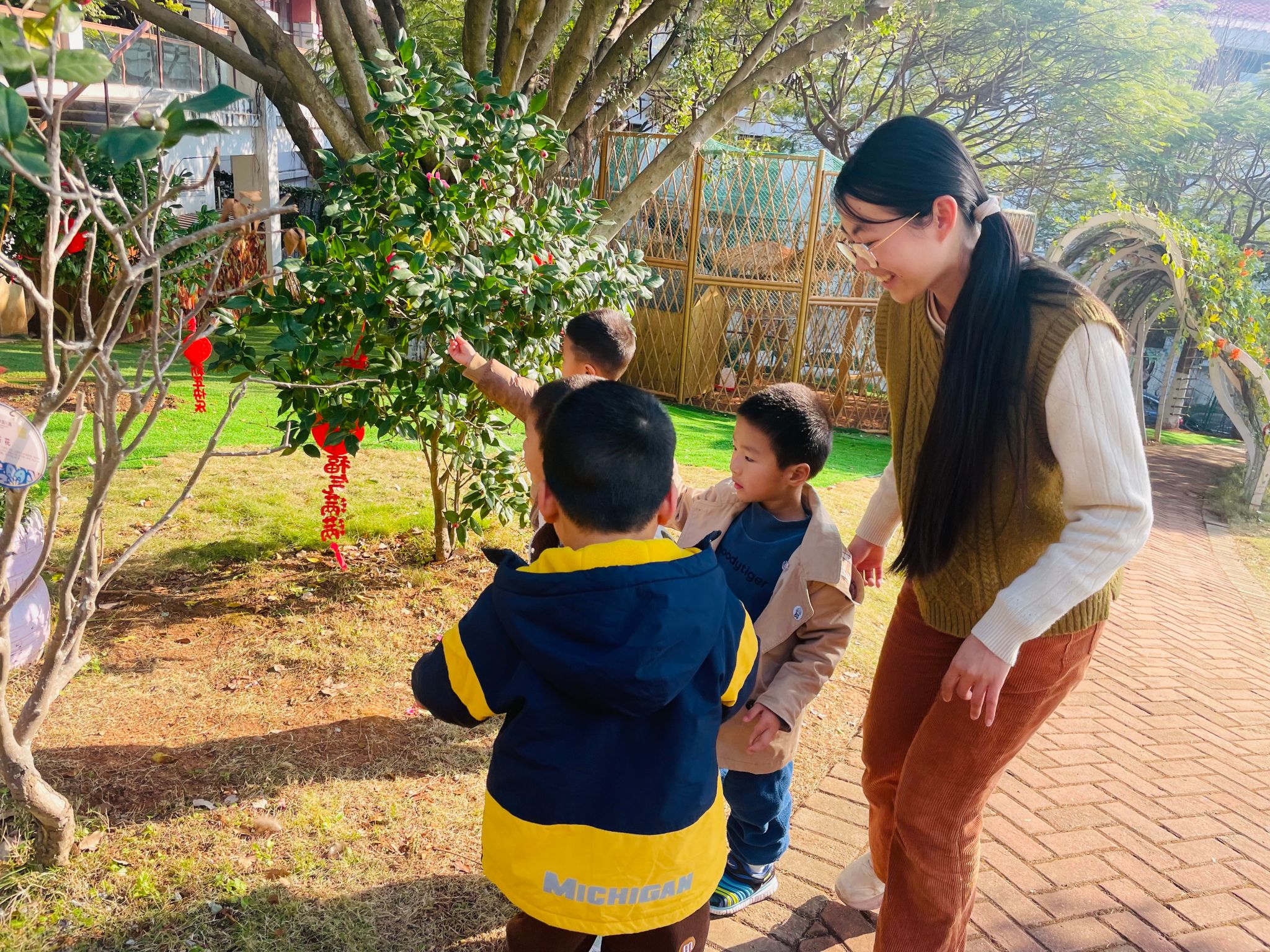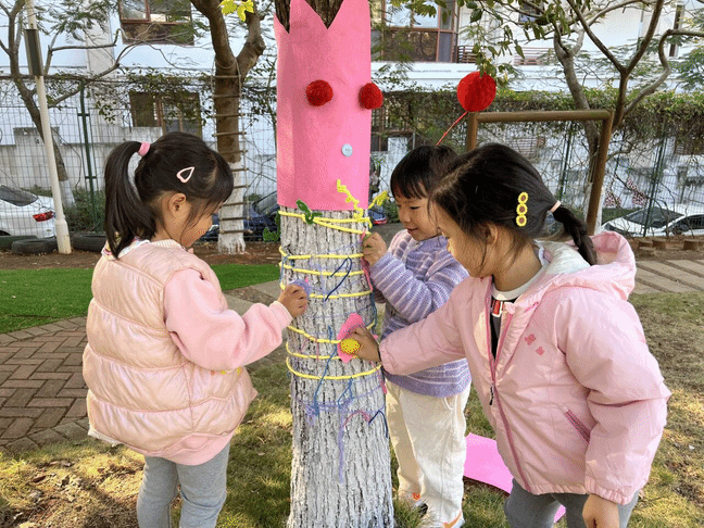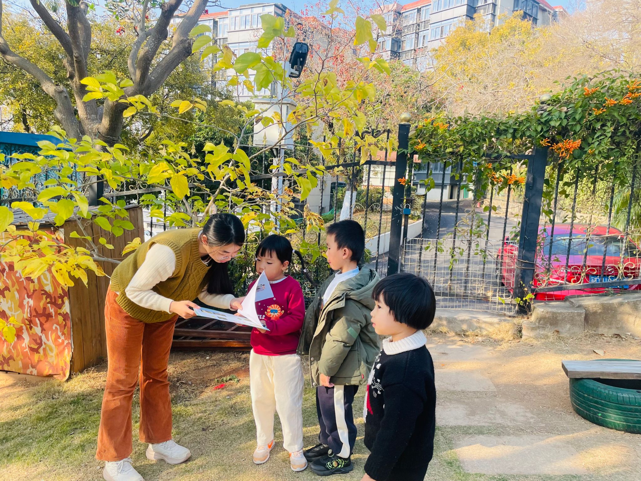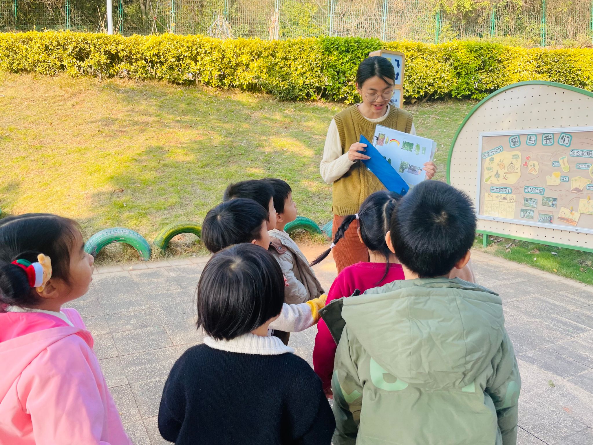 从这天起,小山坡成了中六班的 “秘密基地”。游戏时,孩子们会绕到大树下,把保鲜膜轻轻缠在树干上,用丙烯笔给大树画满彩虹色的 “花衣服”;晒太阳时,大家掏出助教姐姐留下的图册,凑在一起翻:“你看!我昨天找到的树叶和书上的一模一样!” 原来大自然的小秘密,就藏在每一片叶子里,等着小不点们踮起脚尖,去发现更多奇妙的魔法呢。