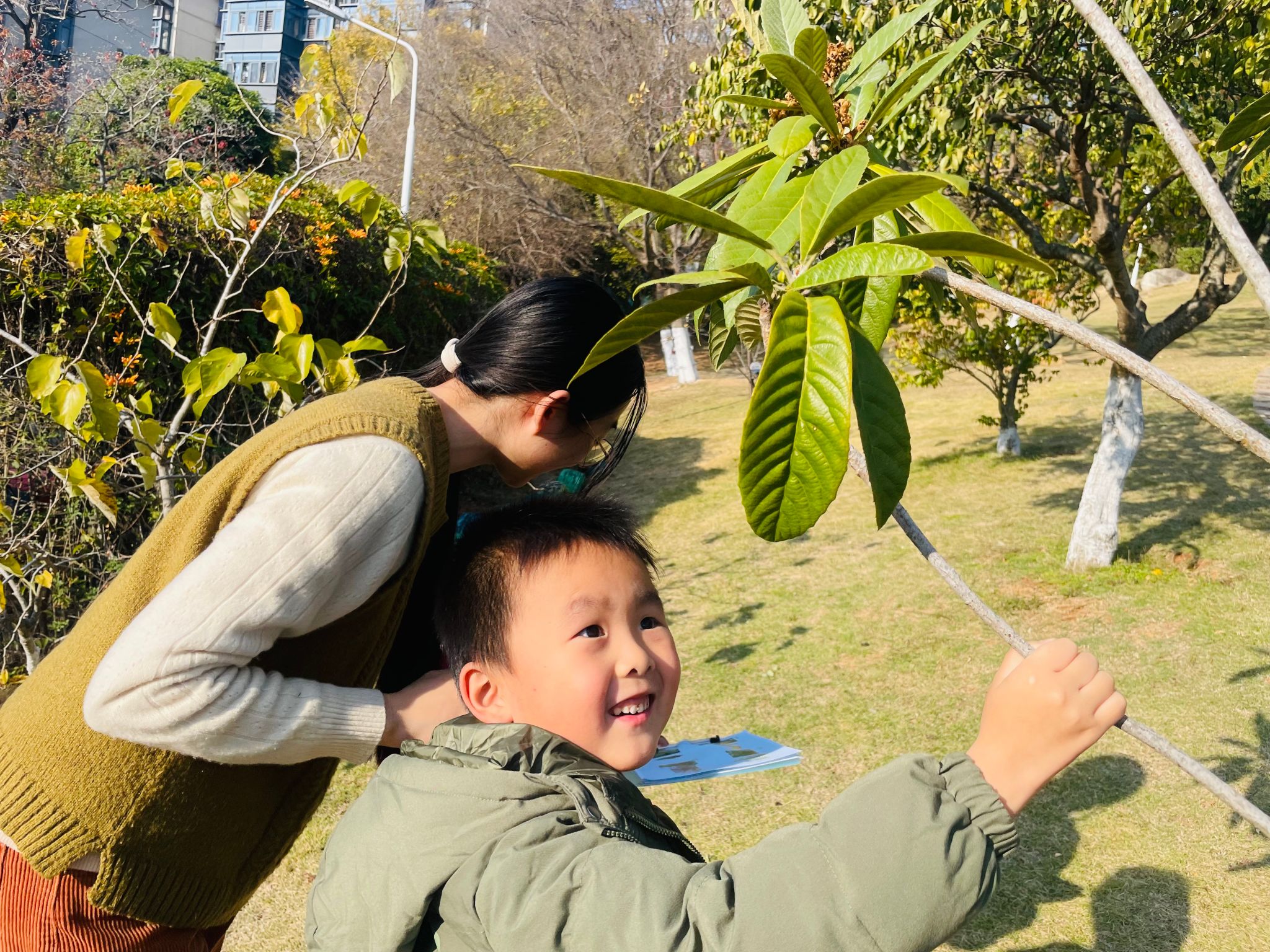 “一二一” 地爬上幼儿园的小山坡。姐姐们捧着图册先带着孩子们讲解再找树叶。有的小朋友举着凤凰木叶比对,有的对着变叶木惊呼 “和书上的一样漂亮”,还有的小心翼翼摸着山茶叶的锯齿边。风穿过树林时,树叶沙沙响,像在和小不点们说悄悄话。到围栏边看红艳艳的炮仗花……