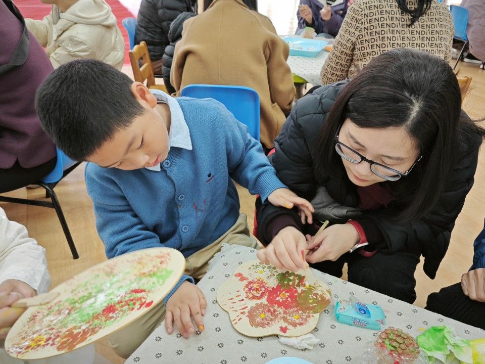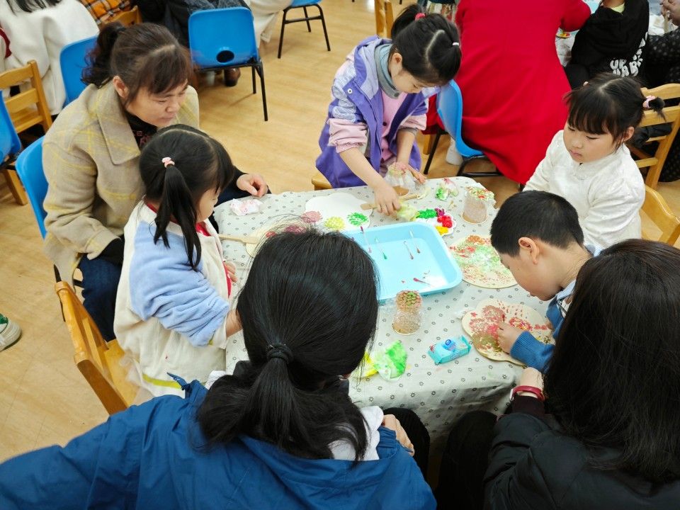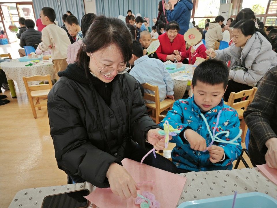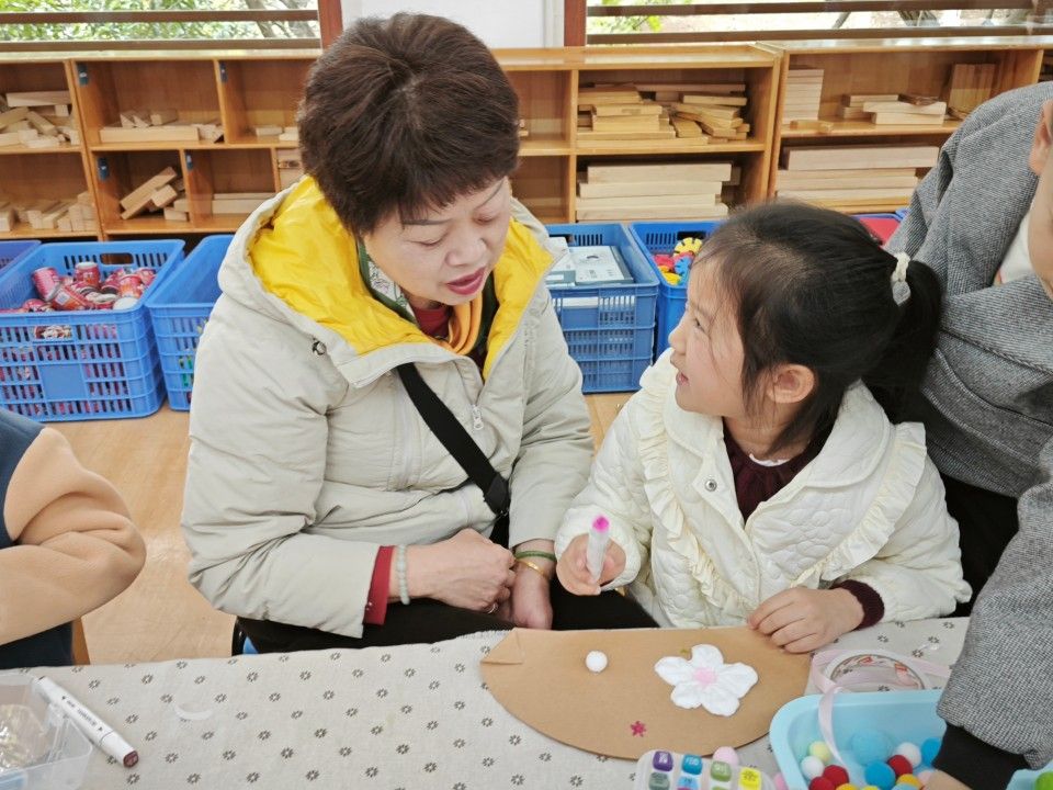 歌表演结束,就到了亲子手作环节。团扇的制作工具、簪花手工发箍、手工单肩包、扭扭棒等装饰材料已经时刻待命啦!宝贝们和妈妈、奶奶一起动手,发挥创意。有的宝贝用粘土在手工包上捏出可爱的小花朵,妈妈在一旁帮忙调整形状;有的奶奶和孙女一起给团扇拓印出秀丽的绣球花,两人边画边笑着交流。
