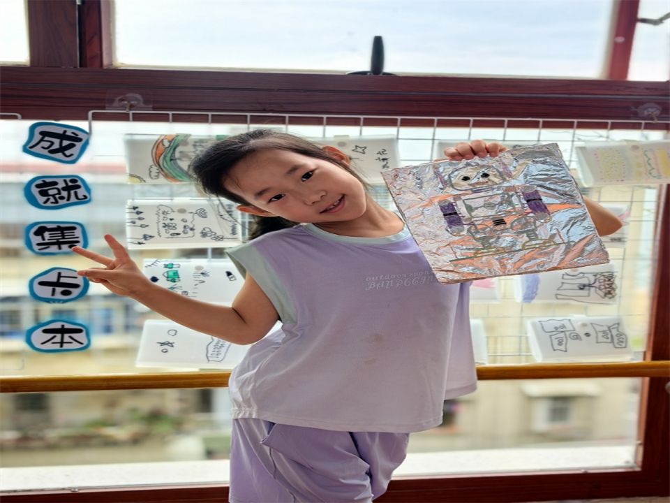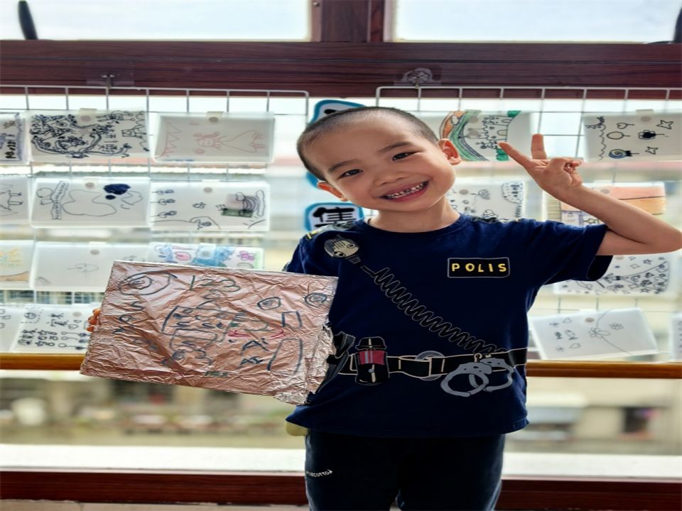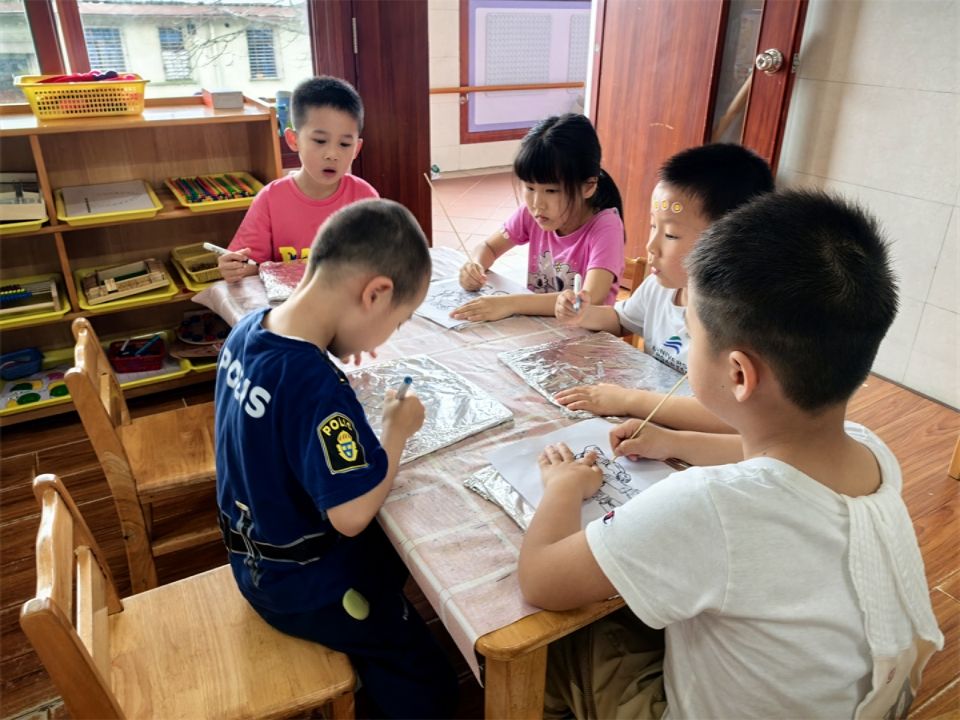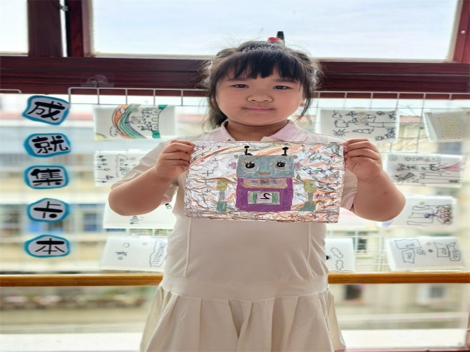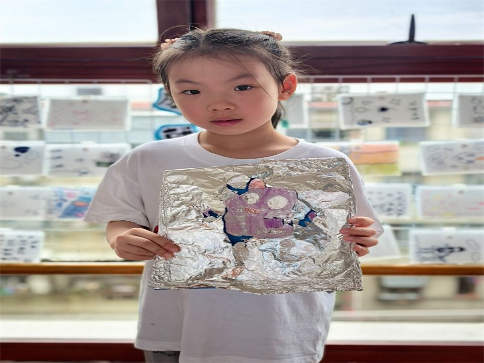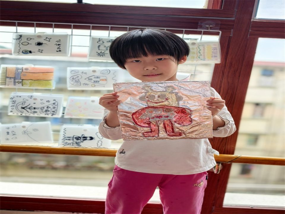 见到了这么多特别的“新朋友”,宝贝们也跃跃欲试想将自己想设计的AI人工智能画下来,于是我们在充满科技感的锡箔纸上画下了自己设计的AI人工智能。