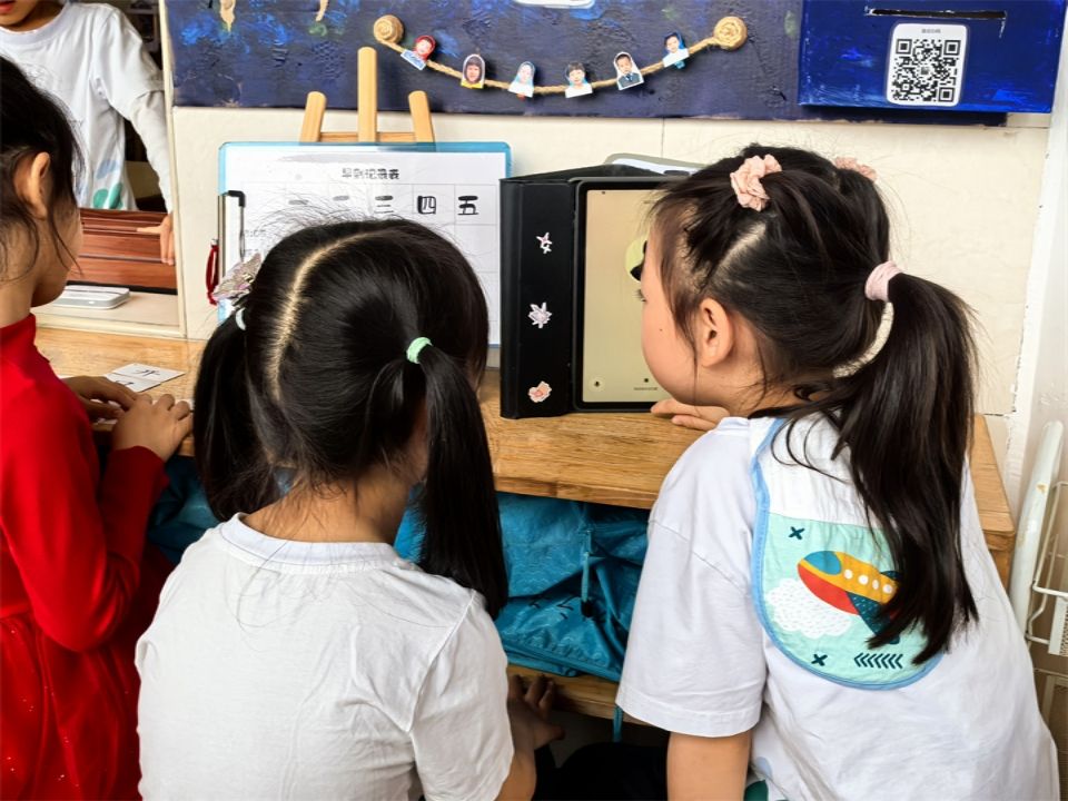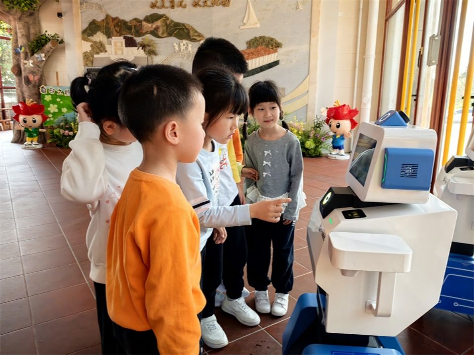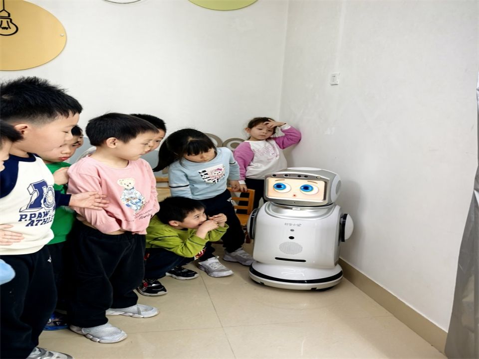 带着兴奋的心情,宝贝们又来到科学发现室。一进门,就看见角落里的互动学习AI。它不仅会跟着音乐跳舞、投影播放有趣的动画、拍摄照片还会像个小跟班跟着宝贝们到处走呢。