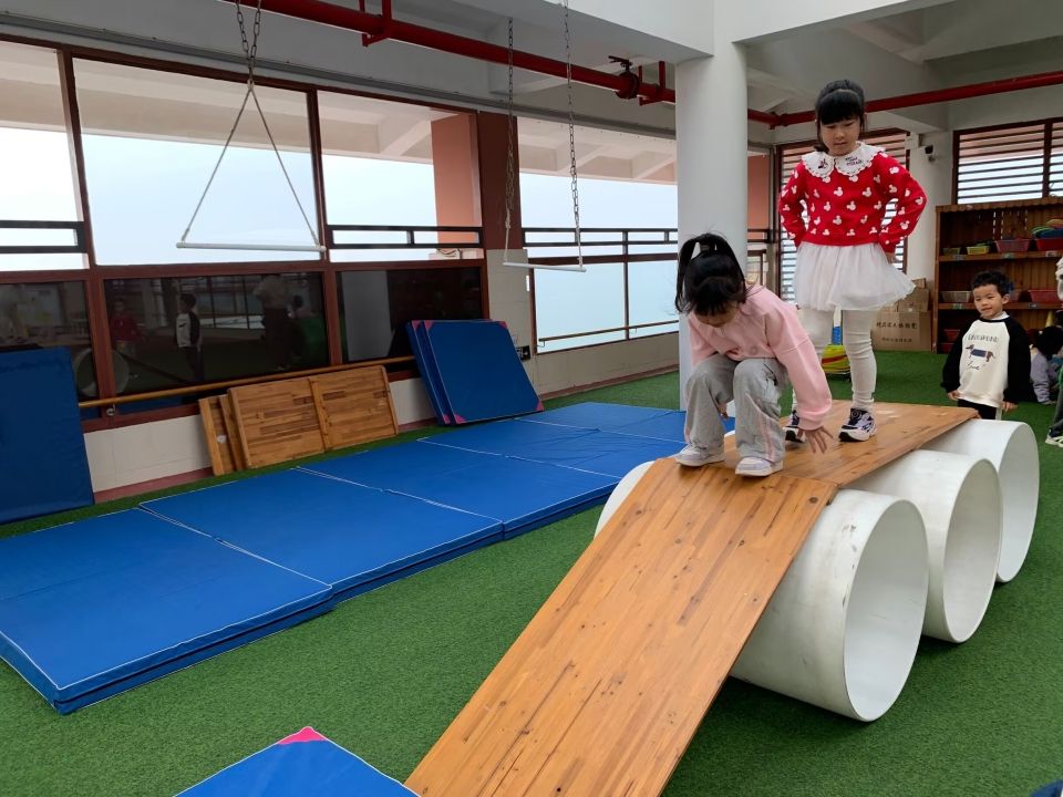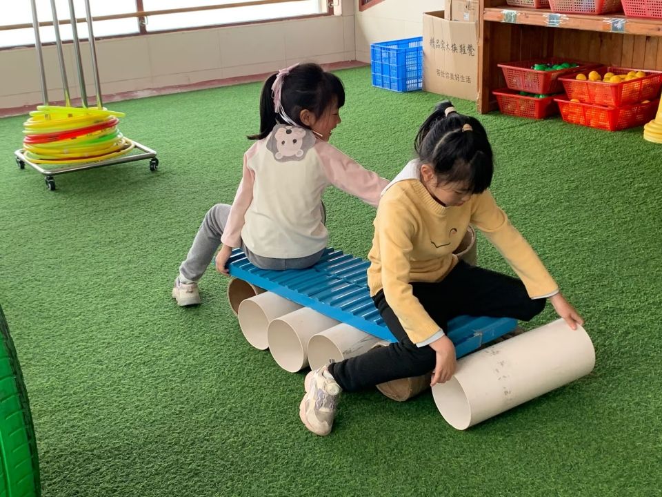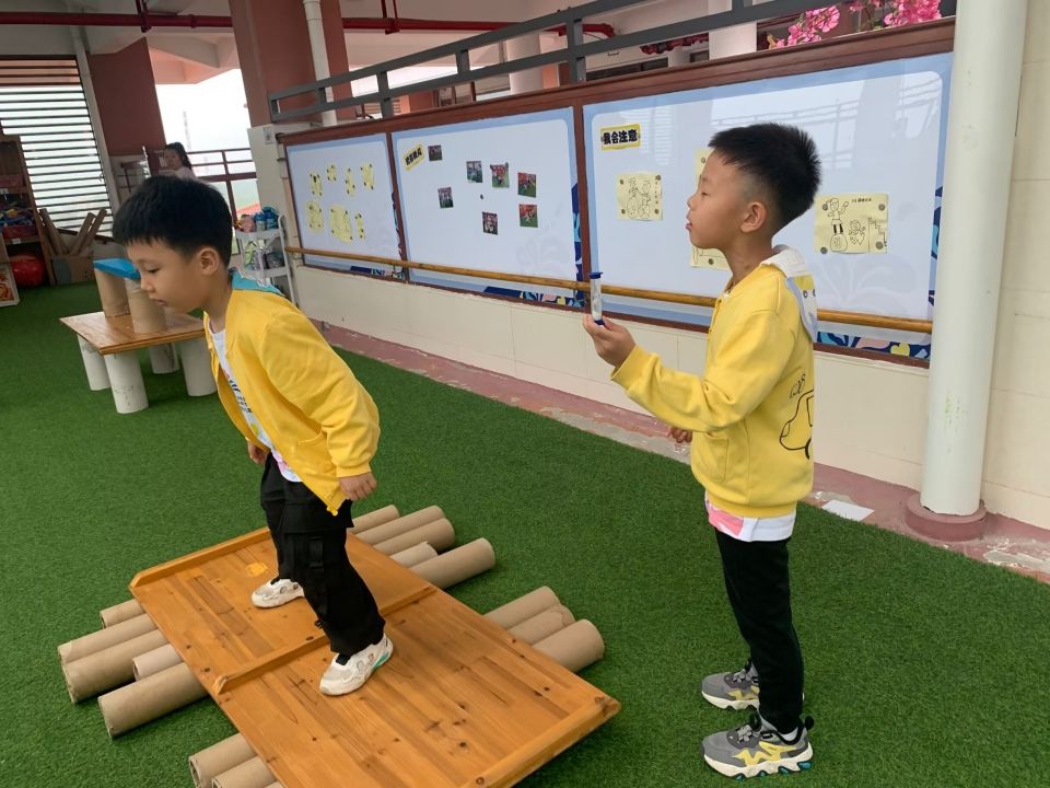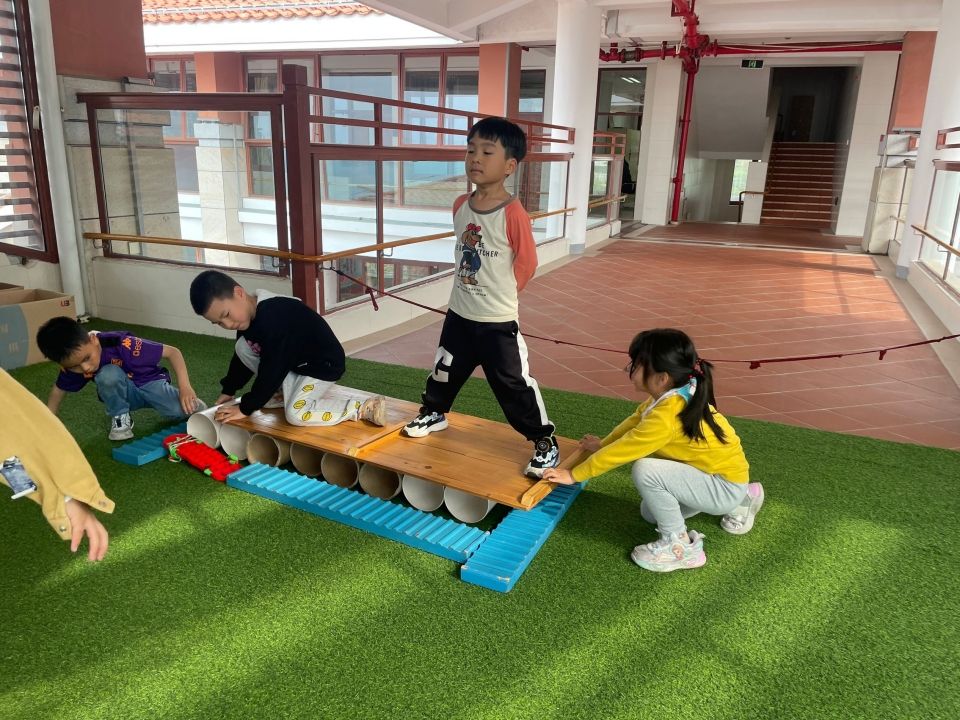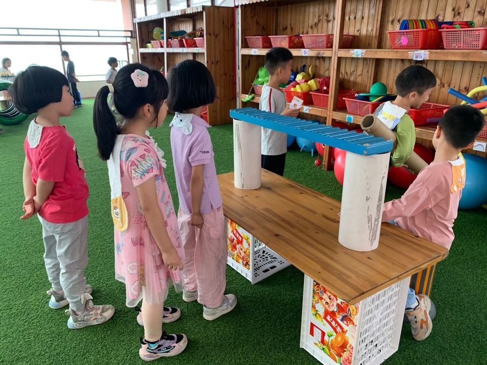 同时,滚筒区也是孩子们发挥建筑才能的小天地。他们巧妙地将滚筒与木板组合,搭建出类似普拉提床的装置。两个孩子站在上面轻轻晃动,感受平衡的乐趣,拉动装置时,还能探索力学的奥秘,好奇的种子在心中生根发芽。