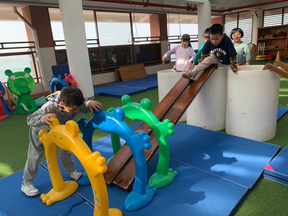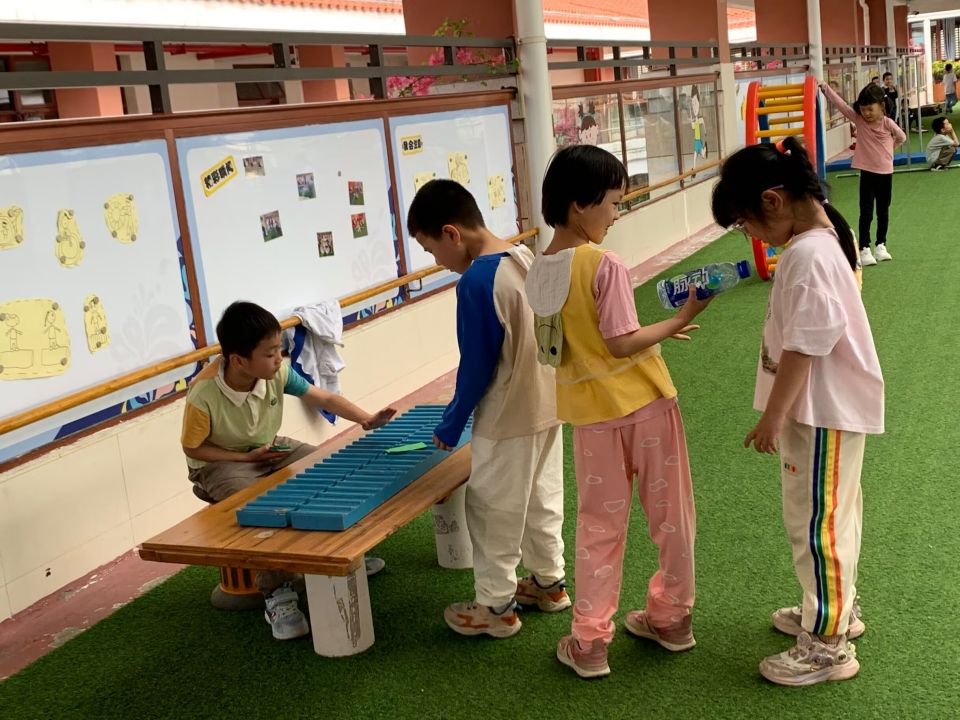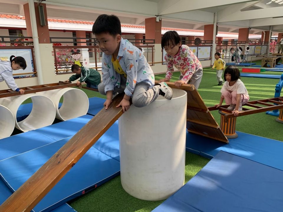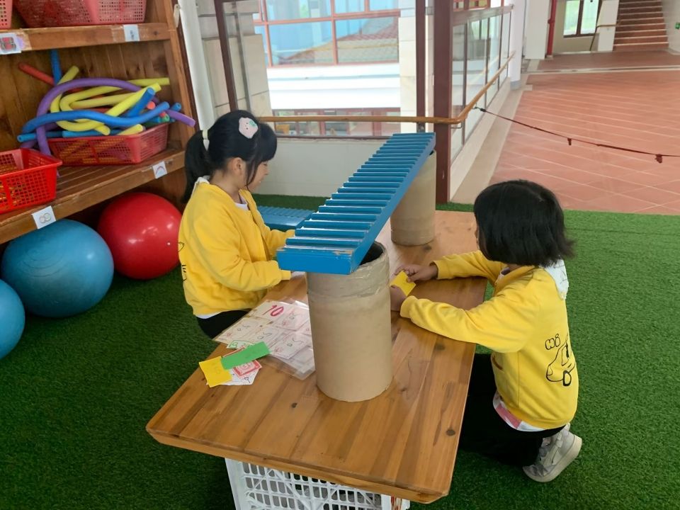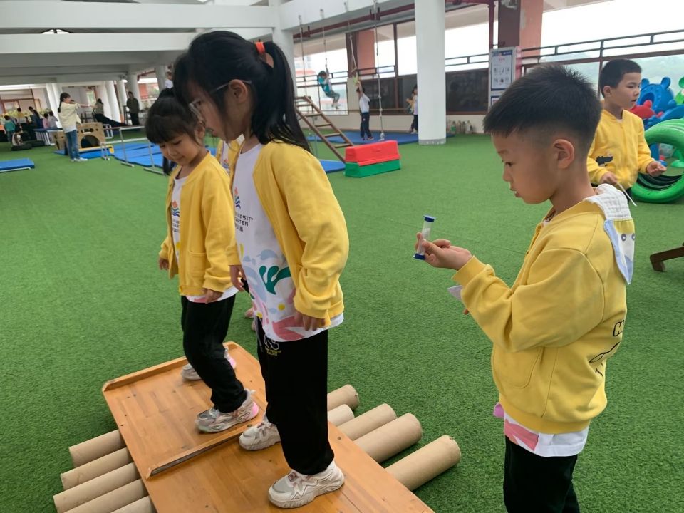 同时,滚筒区也是孩子们发挥建筑才能的小天地。他们巧妙地将滚筒与木板组合,搭建出类似普拉提床的装置。两个孩子站在上面轻轻晃动,感受平衡的乐趣,拉动装置时,还能探索力学的奥秘,好奇的种子在心中生根发芽。