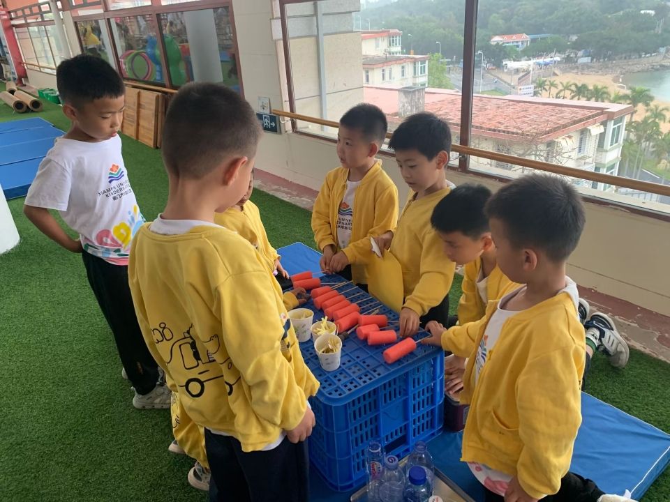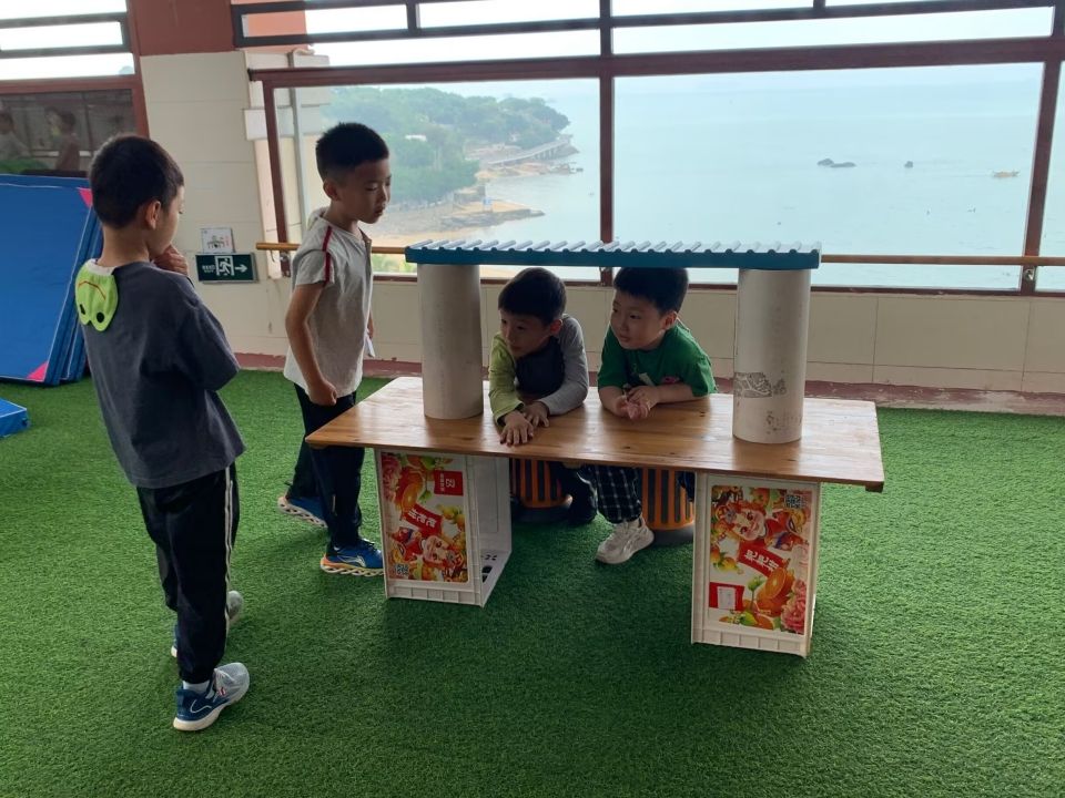 更有趣的是,滚筒区融入了角色游戏元素。孩子们一起动手搭建出游乐场中的甜品屋,走进屋内,手工制作的“冰淇淋”“热狗”“饮料”等“美食” 应有尽有。他们时而扮演热情的店员,大声招揽“顾客”;时而扮成挑嘴的食客,精心挑选“美味”。搭建与游戏完美融合,孩子们的动手能力与创造力在欢声笑语中不断提升。