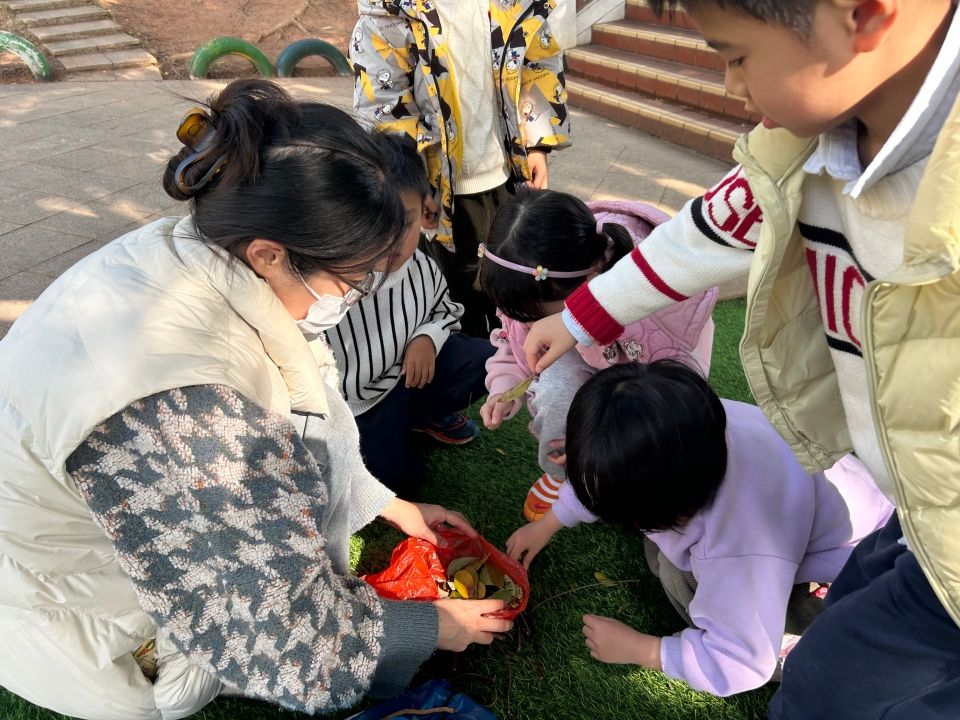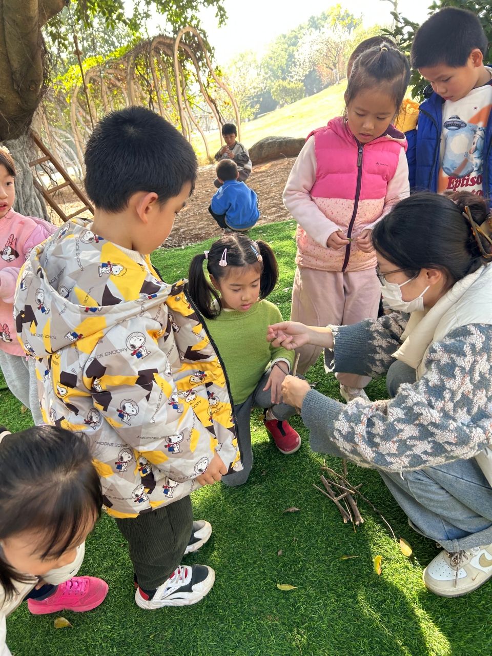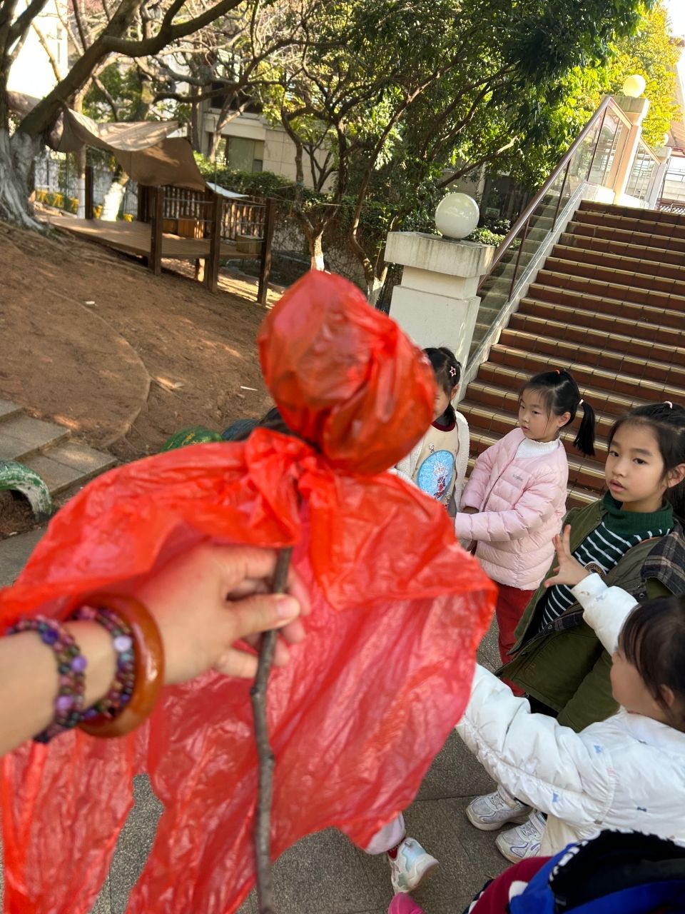 说干就干,唐老师准备两个红色塑料袋,小朋友们在山坡草地上捡来形状各异的树叶。大家围坐在一起,七手八脚地忙活起来。有的用树枝做稻草人骨架,有的给它穿上装满树叶的红色塑料袋“衣服”。不一会儿,两个神气的稻草人就诞生了,红色的“衣裳”在微风中轻轻飘动,仿佛在向大家招手。