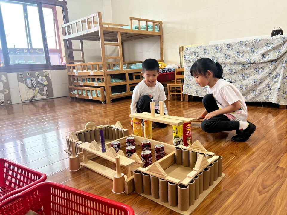 建构游戏时,孩子们化身“小小建筑师”。他们商量设计、分工合作,用积木搭建出教学楼、操场和教室。当壮观的“小学”模型落成,孩子们脸上洋溢着自豪,仿佛真的踏入了小学世界。