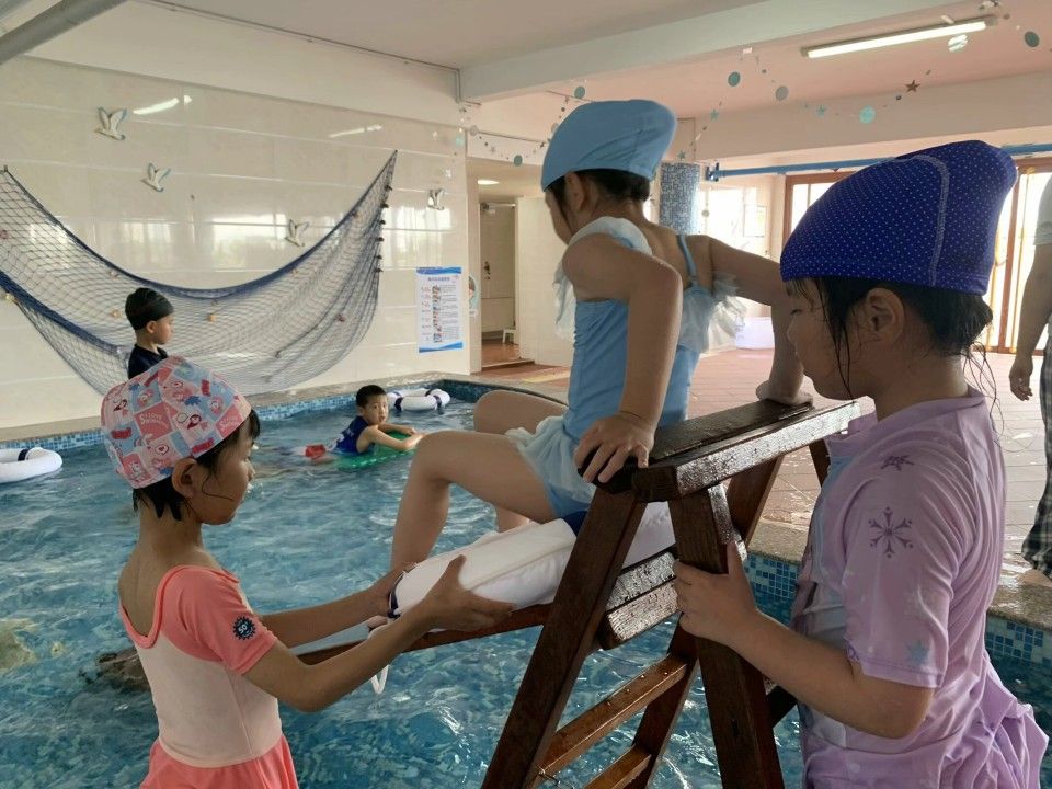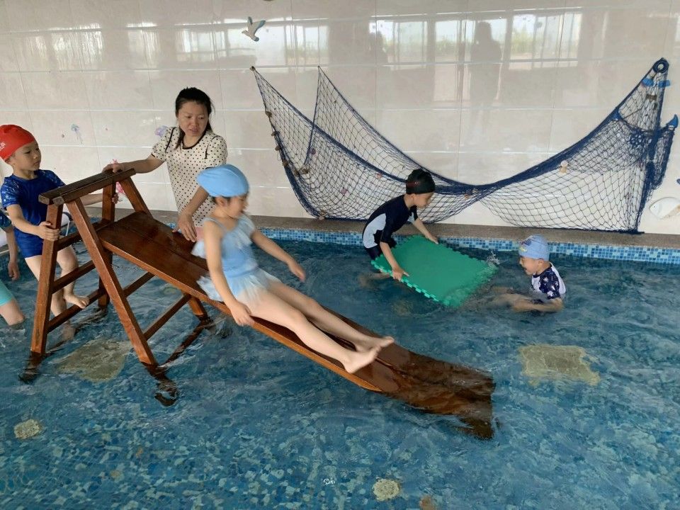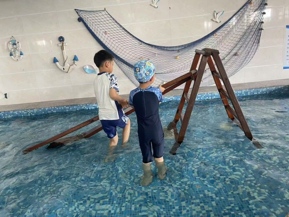 更令人惊喜的是,孩子们竟然利用木板和人字梯搭建出了水上滑滑梯,一个接一个地从上面滑入水中,溅起大片水花,整个水池都成了欢乐的海洋。