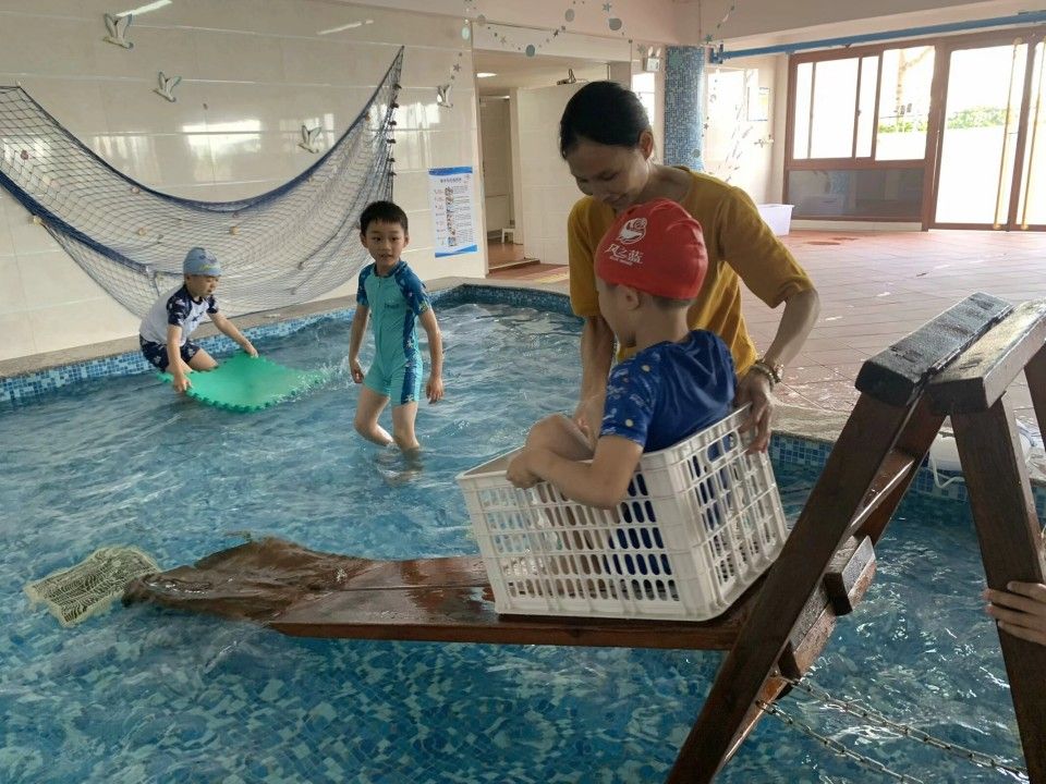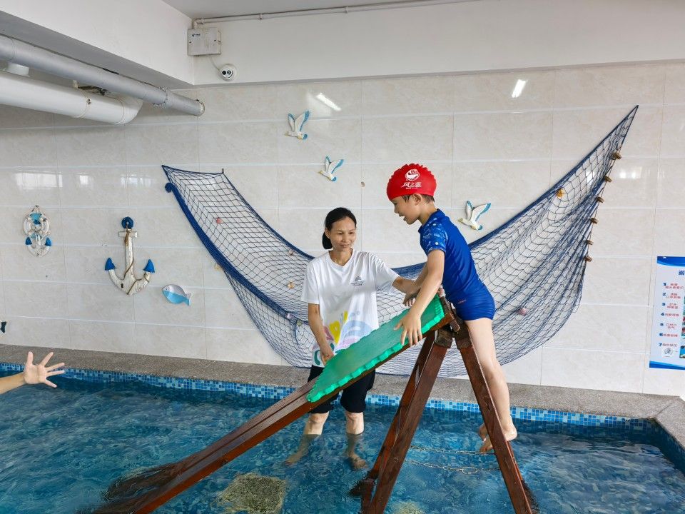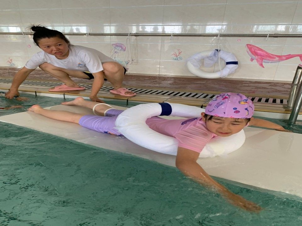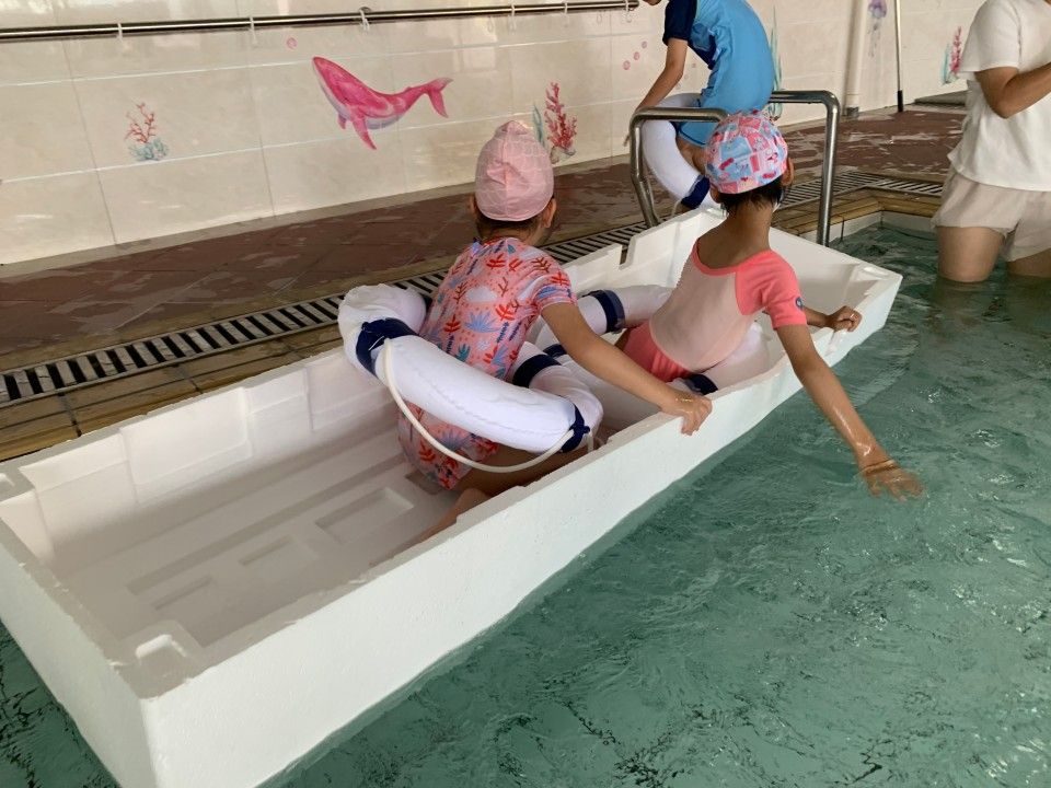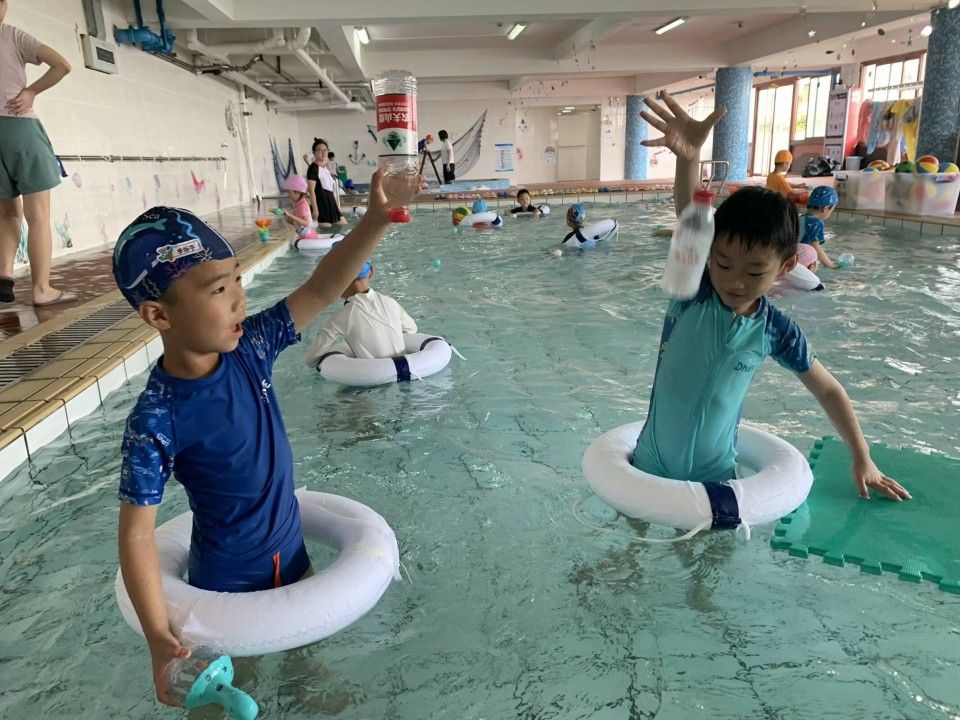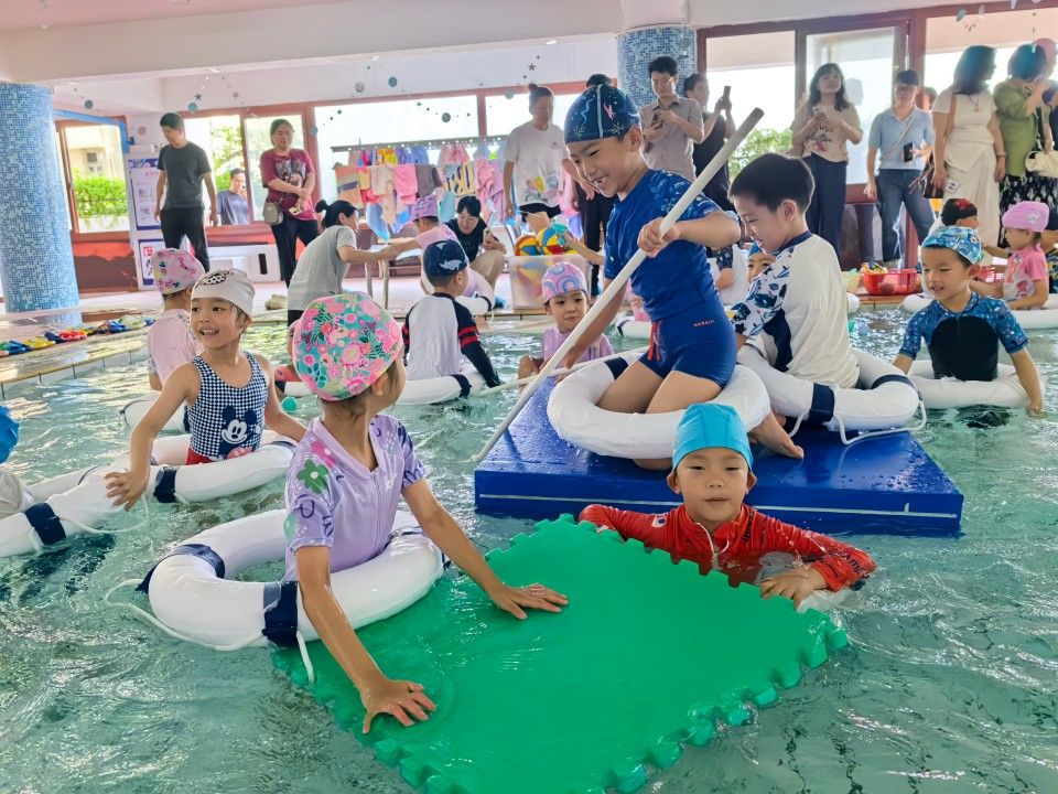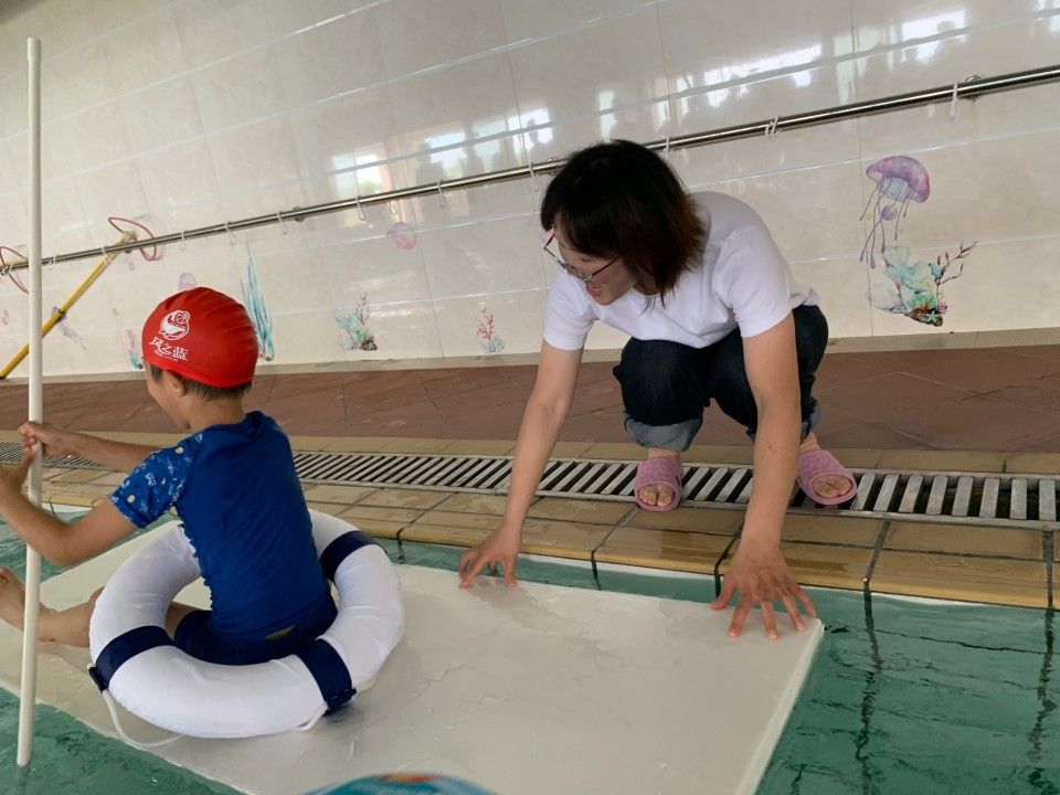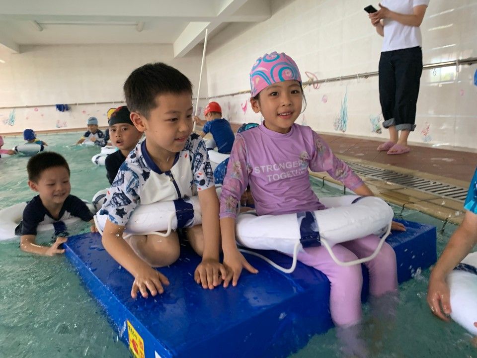 有的孩子趴在挤塑板上,卯足了劲用脚踩水,带动挤塑板缓缓前行,脸上洋溢着自豪与兴奋。四五个孩子结伴坐在浮板上,享受着悠闲时光,而水中的两个“小水手” 则齐心协力推着浮板,不时传来阵阵欢笑声。