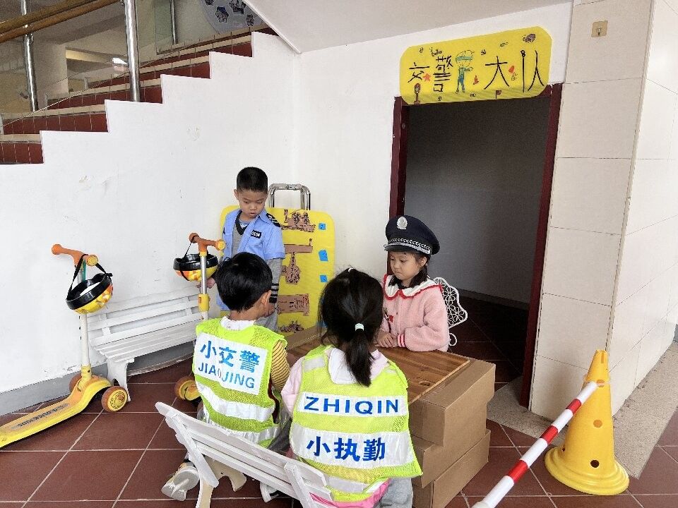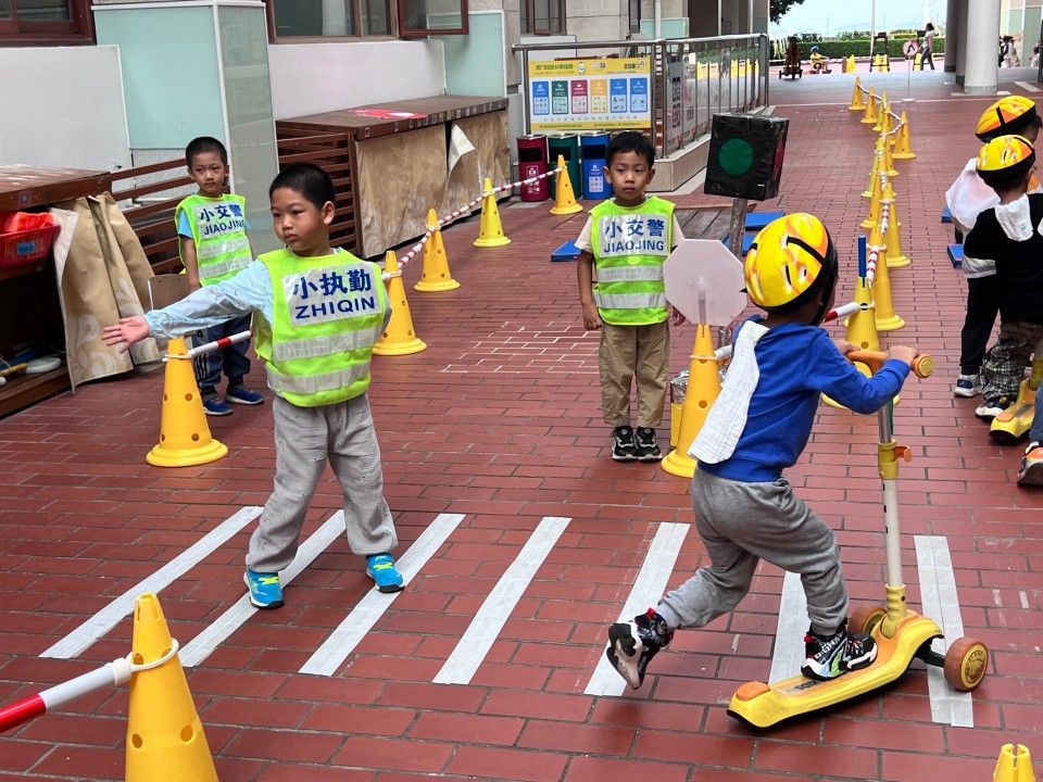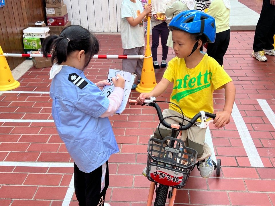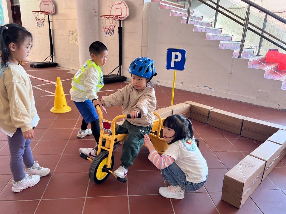 场地建成啦!大家迫不急待的带上帽子,骑上小汽车出发咯。我们穿上交警服,有的负责指挥交通,引导着来往的车辆;有的在道路旁巡逻,看到违规的小朋友立刻开出罚单;还有的则帮助“抛锚”车开出泥坑……你们瞧,大一班的小交警是不是超级厉害呀。