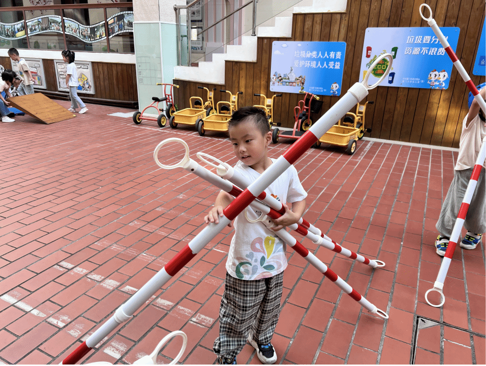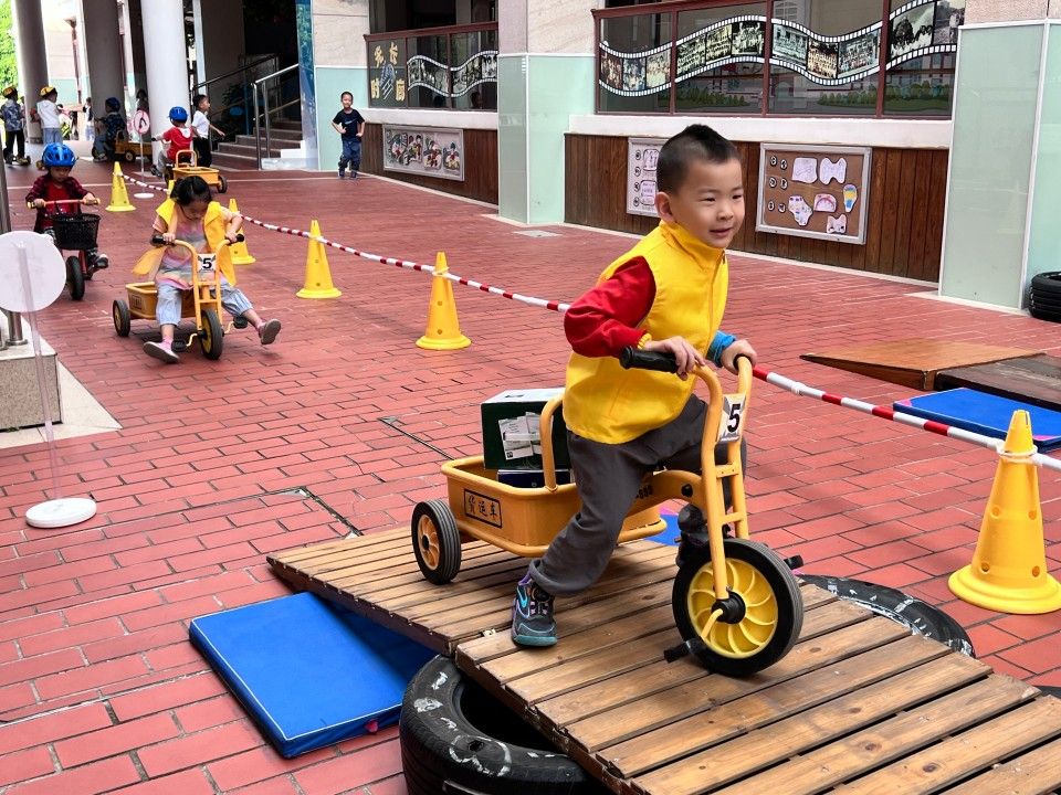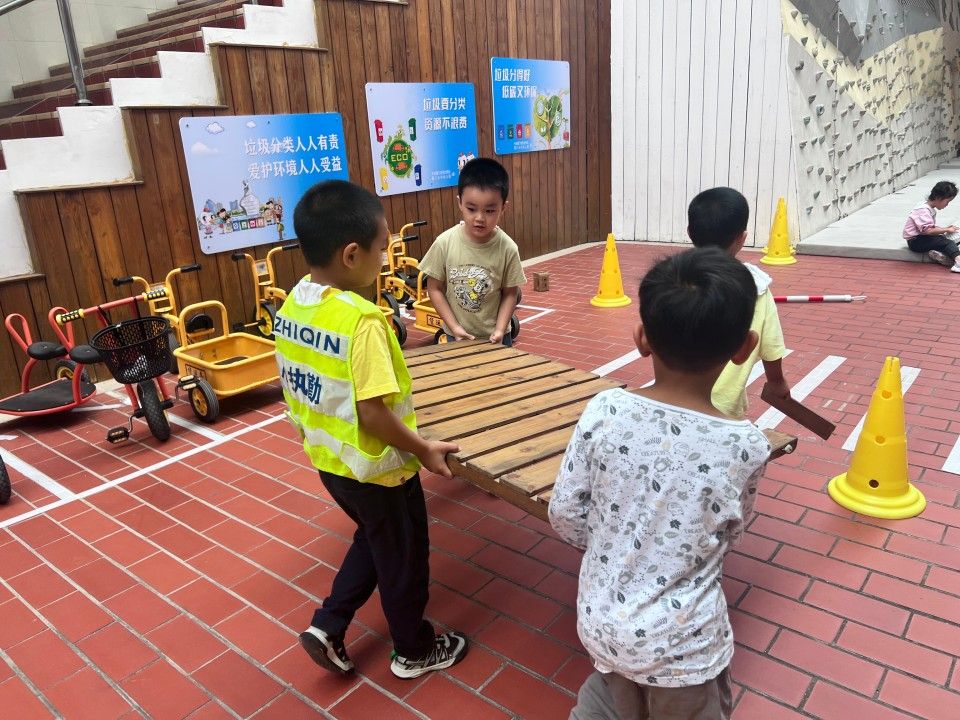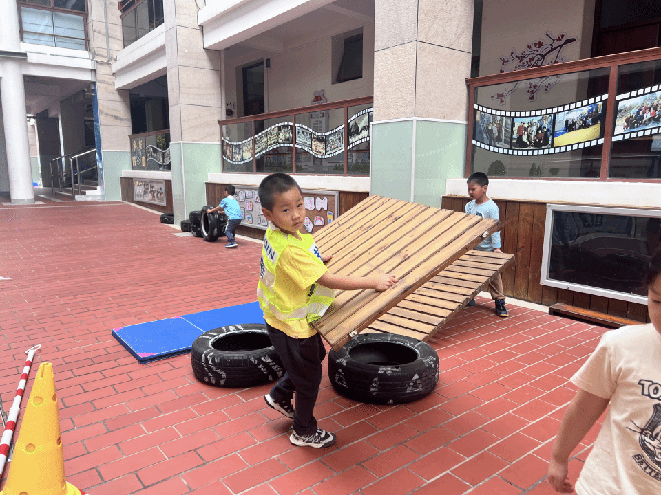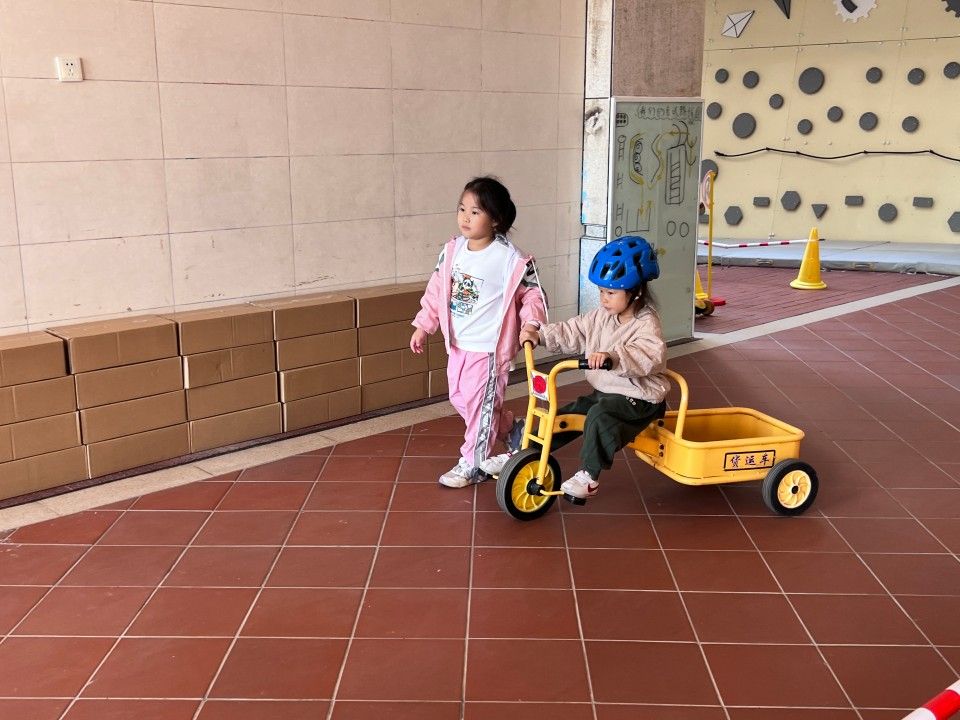 我们终于来到了期盼已久的骑行区,看到骑行区停满了滑板车、自行车、小货车充满了好奇心,纷纷主动帮忙搬运材料,有的拿障碍杆和障碍桶,搭起了车道;有的扮演大力士,搬运和搭建坡道……