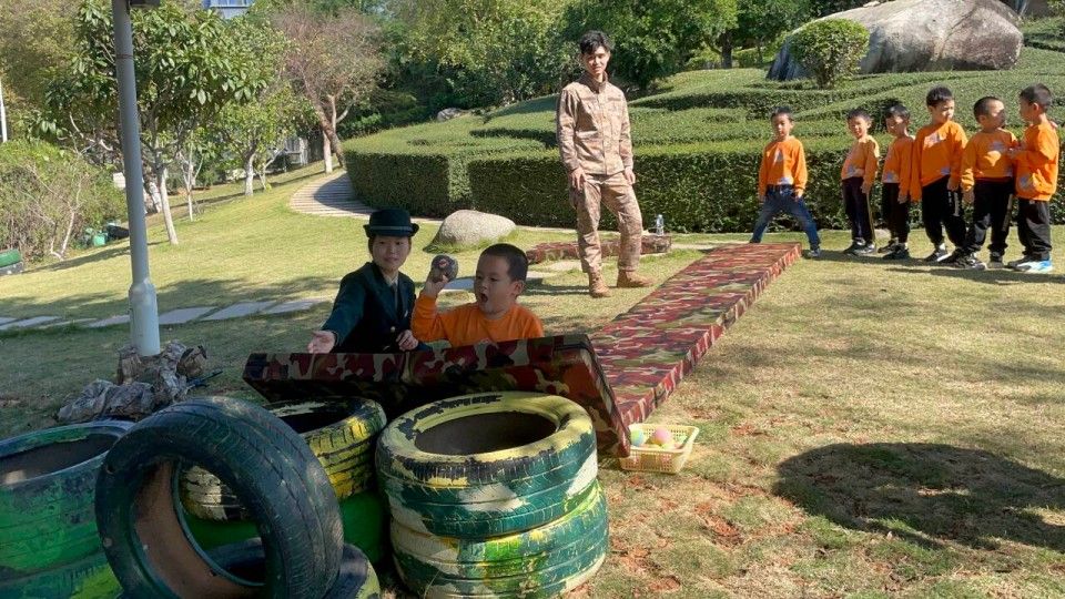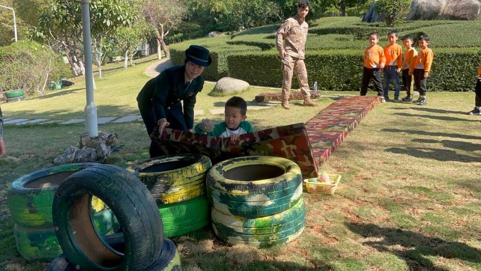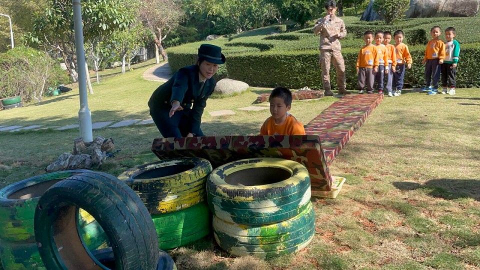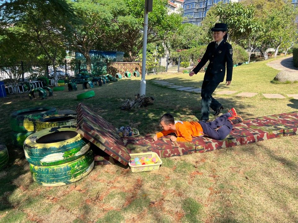 最有趣的是哥哥姐姐们带来的小小兵闯关游戏。第一关是匍匐过地垫;第二关是过山洞;第三关丢炸弹,小小兵们钻完山洞出来之后,将炸弹丢进爆破洞(轮胎)里为胜。孩子们稚嫩的动作,洪亮的喊声、强劲有力的转身,俨然就是一个个军中小小兵。