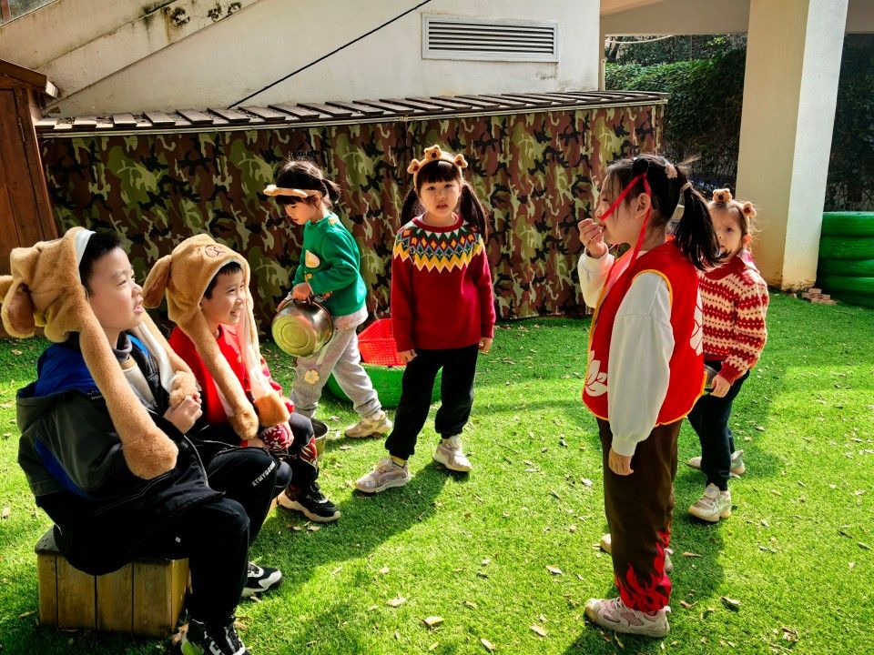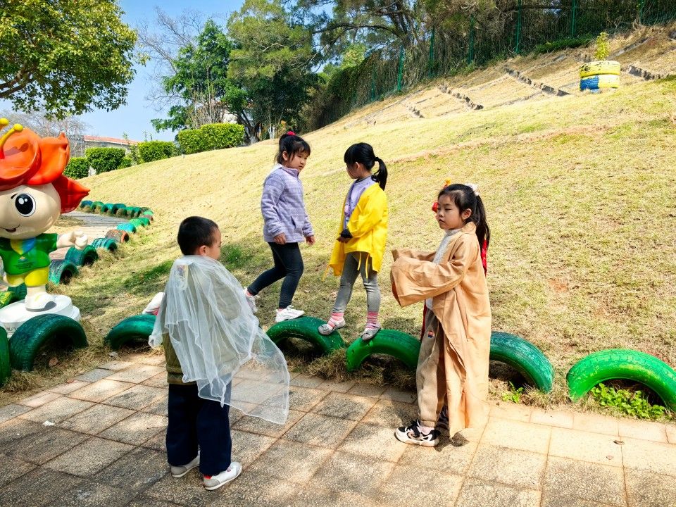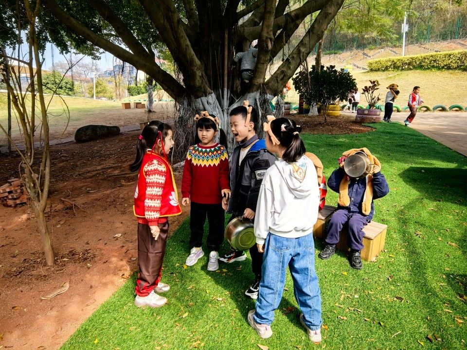 走进热闹非凡的表演时光,正沉浸在精彩的表演游戏中,欢乐四溢。瞧,“哪吒”对着“土拨鼠大王”大声喊:“我乃哪吒三太子,能降妖来会作诗!”一招一式有模有样,那股子天不怕地不怕的劲儿被展现得淋漓尽 。不远处,“唐僧师徒四人”踏上了“西天取经”之路;“白雪公主”穿着漂亮的公主裙,与“七个小矮人”开心地唱歌跳舞。孩子们完全沉浸在角色里,一张张红扑扑的小脸上洋溢着灿烂笑容。