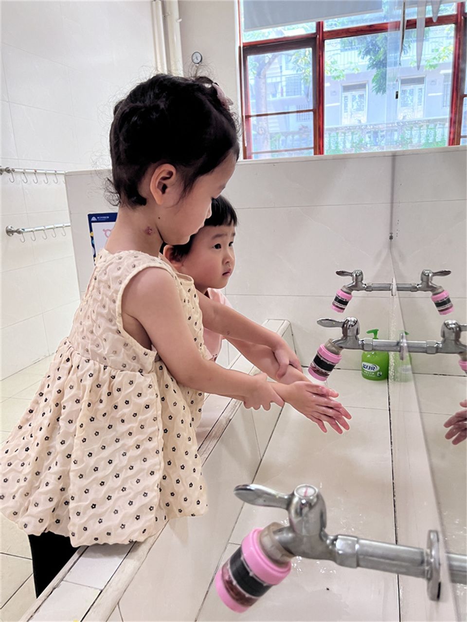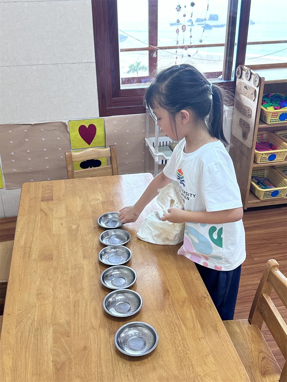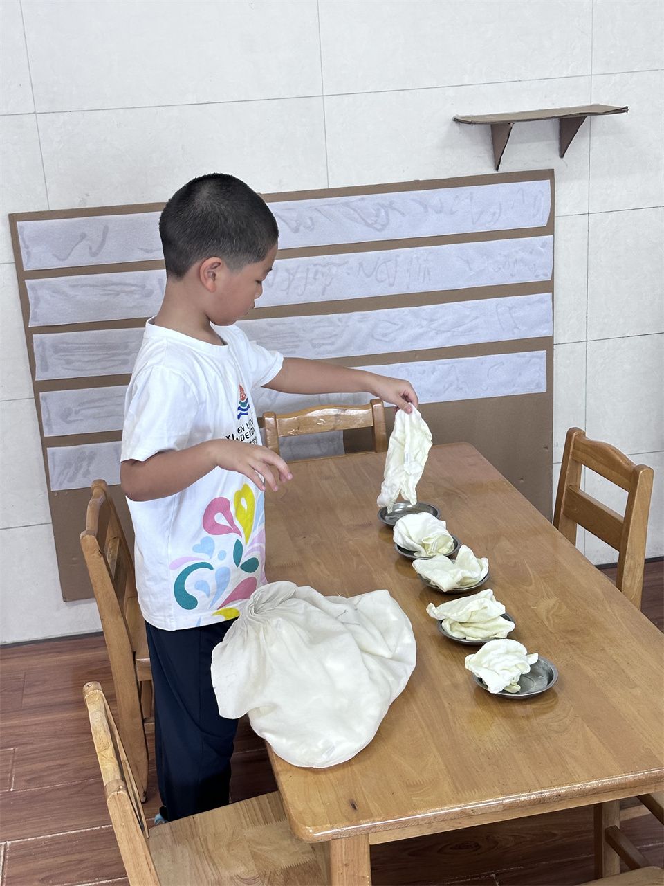 值日生工作中我们认真摆放好毛巾盘,当好老师的小帮手;