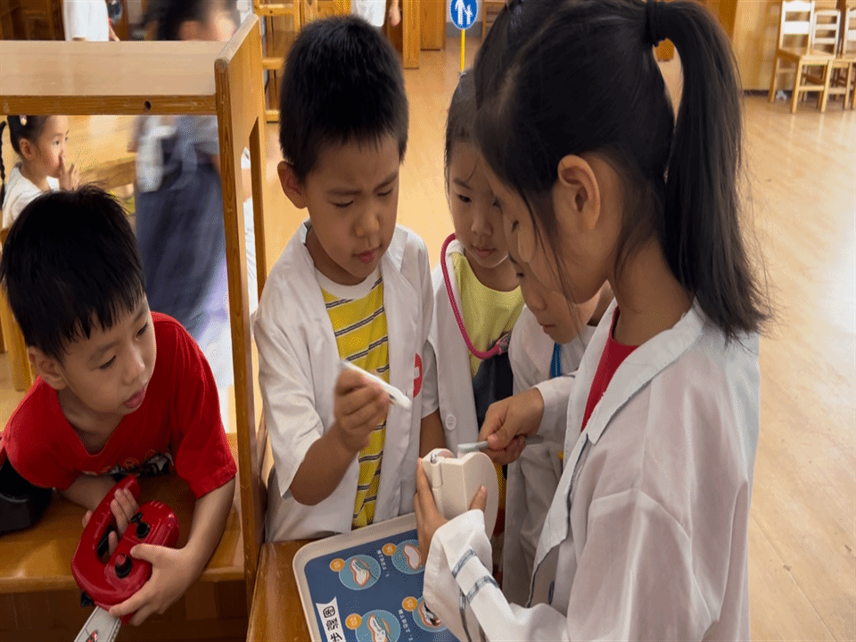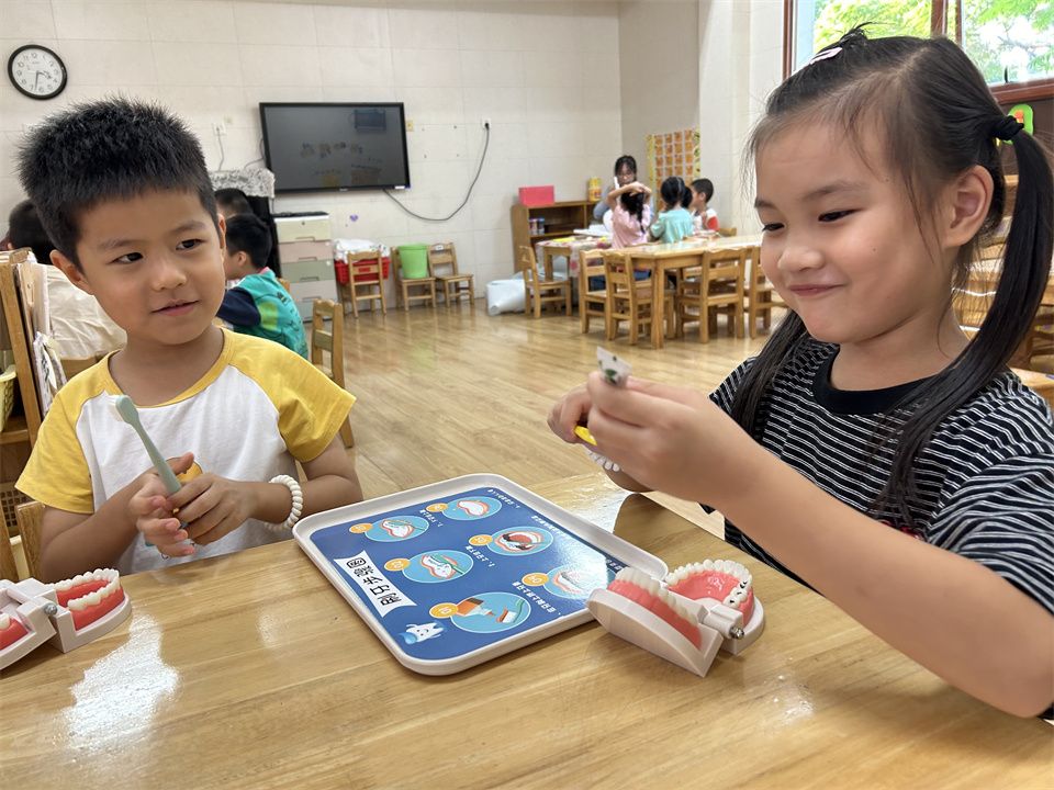 角色游戏“大带小”,孩子们把模具带到场地,口腔医院的季医生向弟弟妹妹介绍刷牙小知识。