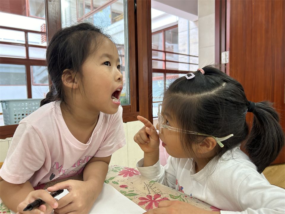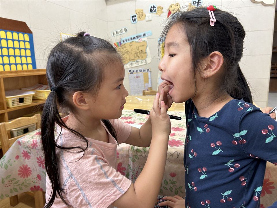 两个好朋友互相进行《我的牙齿统计表》的记录填写。嘴巴张大,让我来数一数。