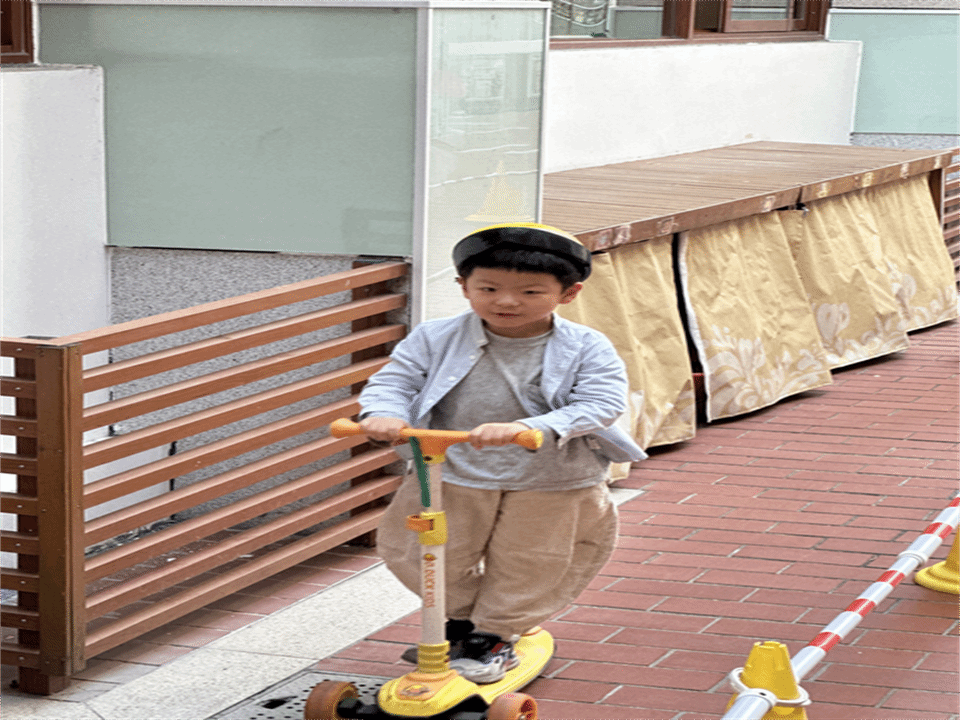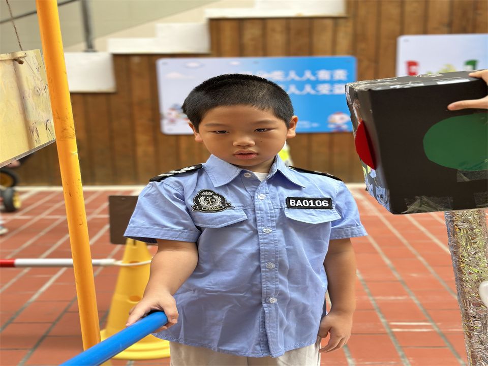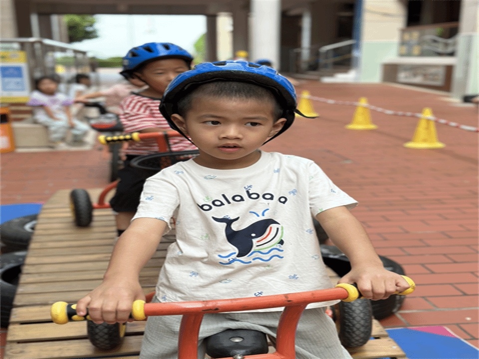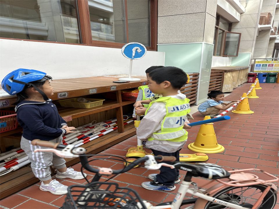 宝贝们推着自己心爱的小滑板车、小三轮车,来到骑行区,跨上车子,小脚用力一蹬,就像勇敢的小骑士踏上了征程。有的小朋友扮演小警察指挥交通,有的小朋友扮演快递员送快递,就像在进行一场欢乐的骑行排队。