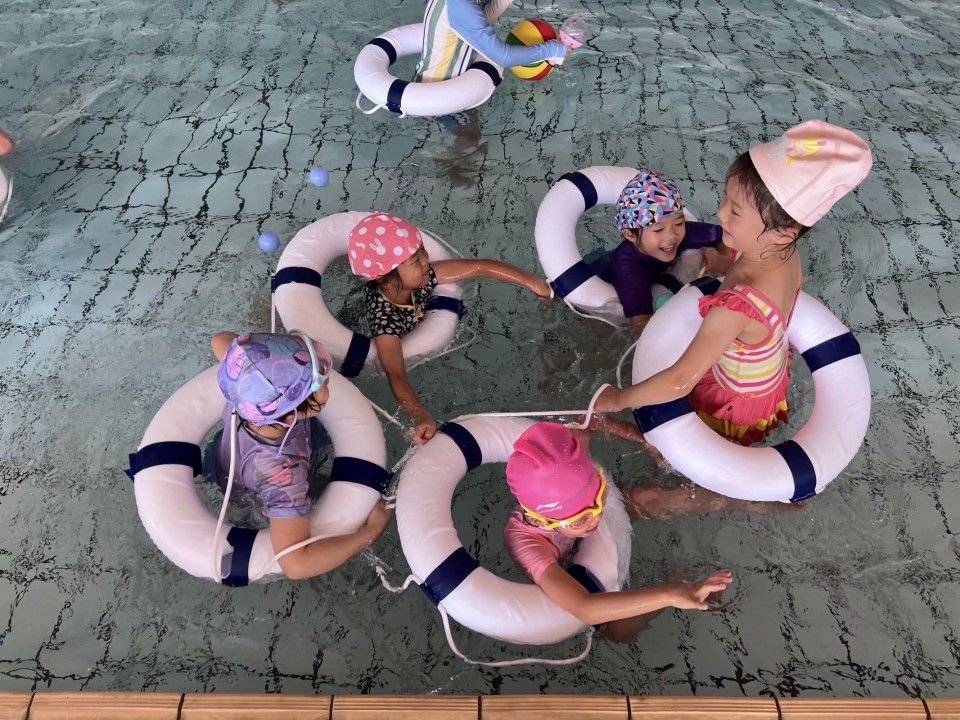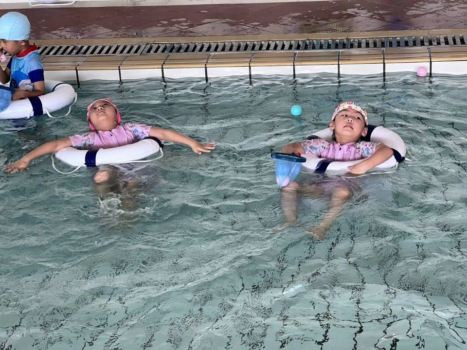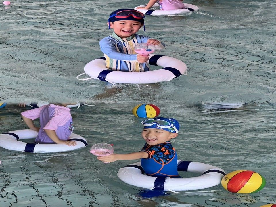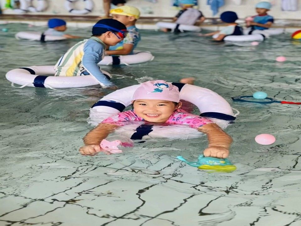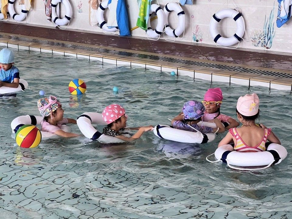 我们有时躺在水面上,享受着被水抚弄的惬意;有时一起开着水上小火车,嘴里还不停地发出“呜呜”的声音;有时在水上表演水上芭蕾,像一朵朵盛开的花朵。