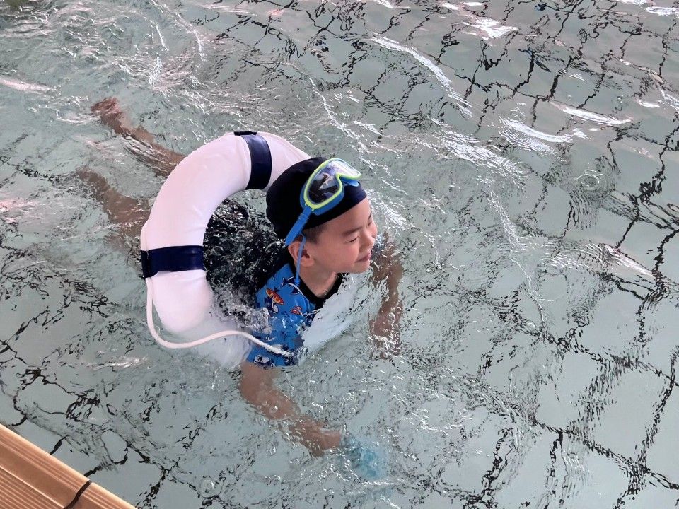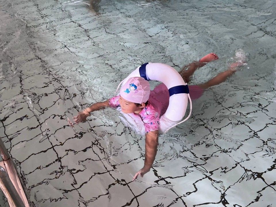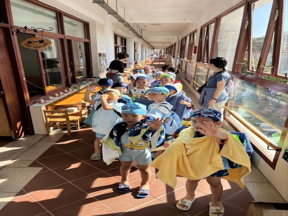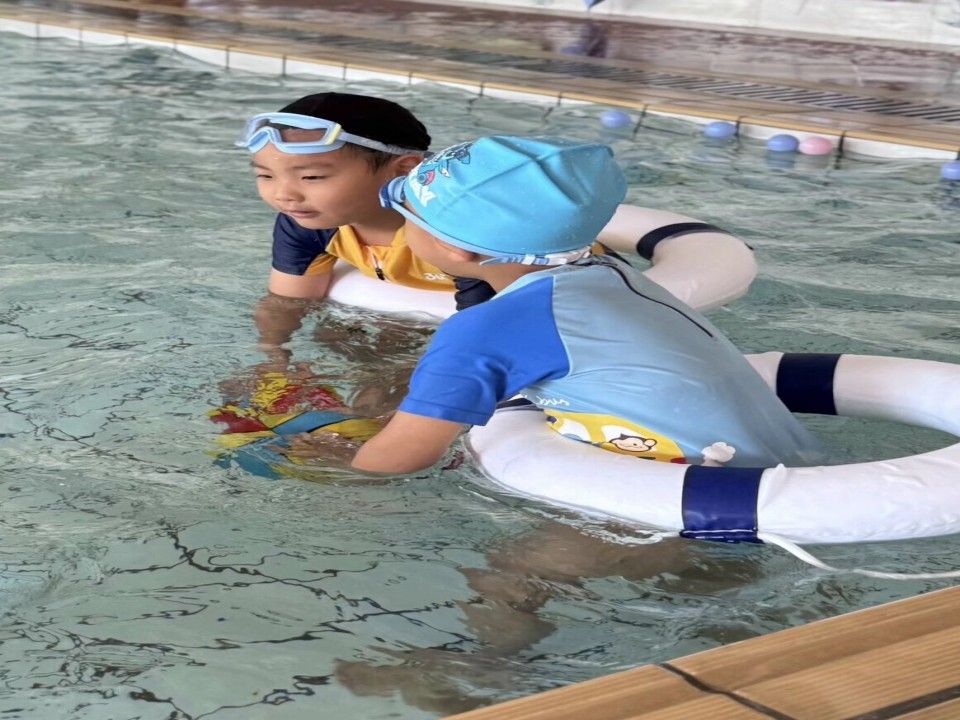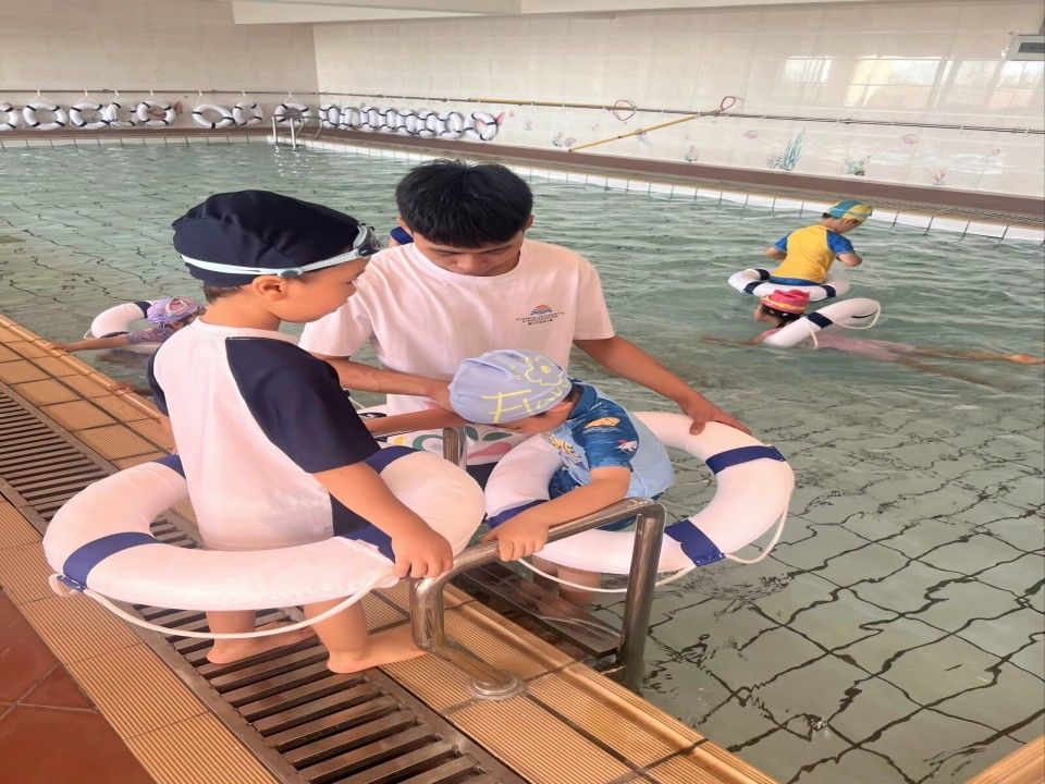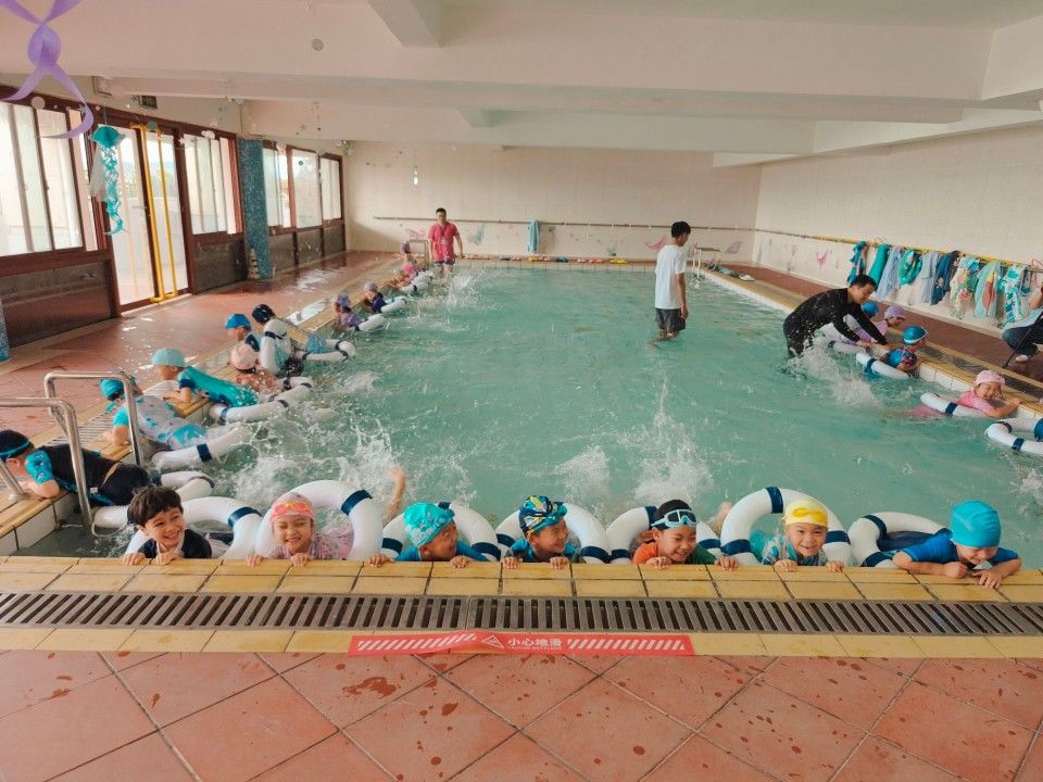 到达嬉水馆后,需要跟着老师先做热身运动才不会在游泳时抽筋呦,接着在“志愿者”爸爸妈妈和老师的帮助我们化身为小小水精灵套着游泳圈慢慢下水了。