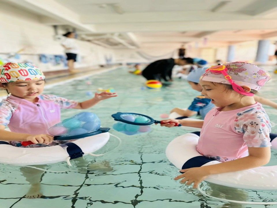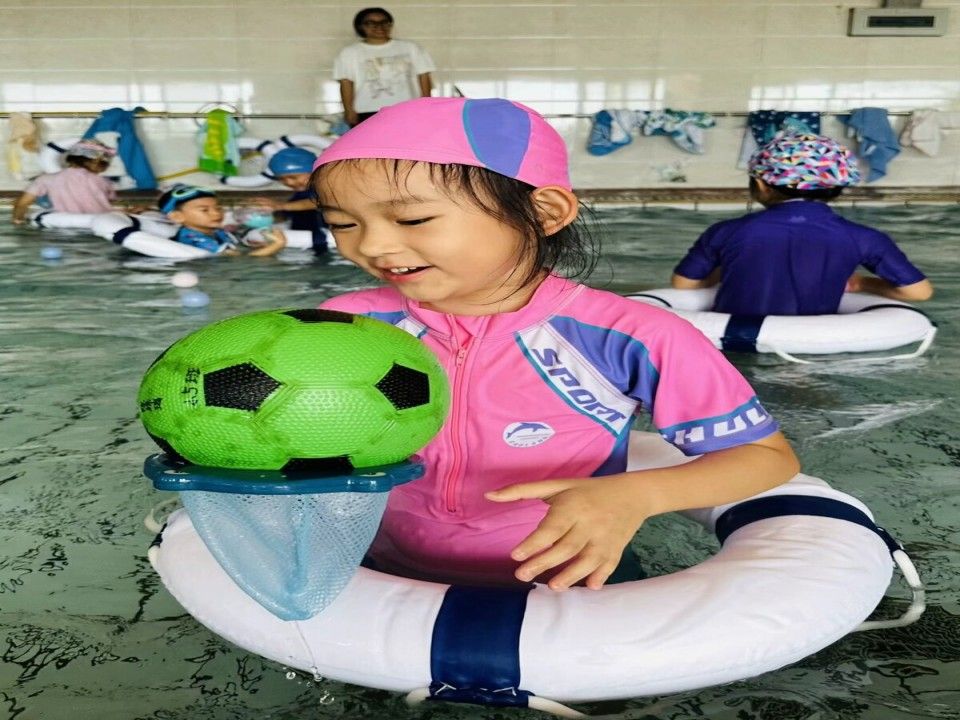 我在水中可以保持平衡,让球乖乖停住;要怎么样才能给水枪装水进行喷射呢?海洋球也会浮在水面上,比比谁抓住的球更多;我游起来哪个玩具装到的水更多;皮球为什么在水里压下去会弹起来呢?真是太神奇太有趣啦!……许多玩具陪着我们一起嬉水,我们可以尽情在泳池里探索。喊声、笑声、打闹声包围着整个游泳池,荡漾着欢乐。