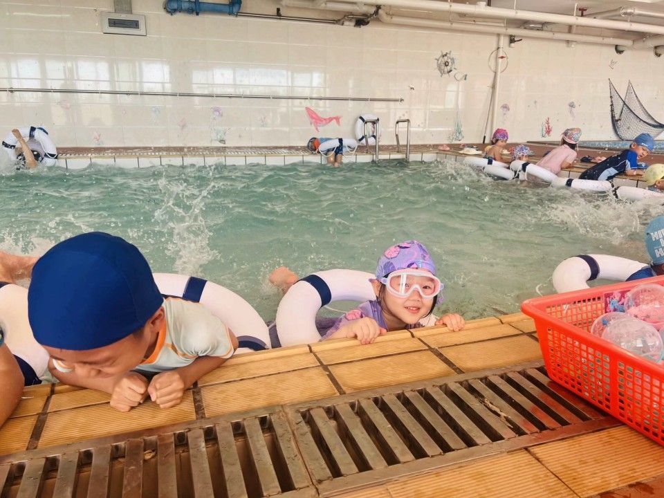 刚下水真是又兴奋又害怕呀,不过没关系,一起跟着老师的音乐扶在岸边扑通扑通小脚丫:“看谁的水花打得更高,打得更大吧!”