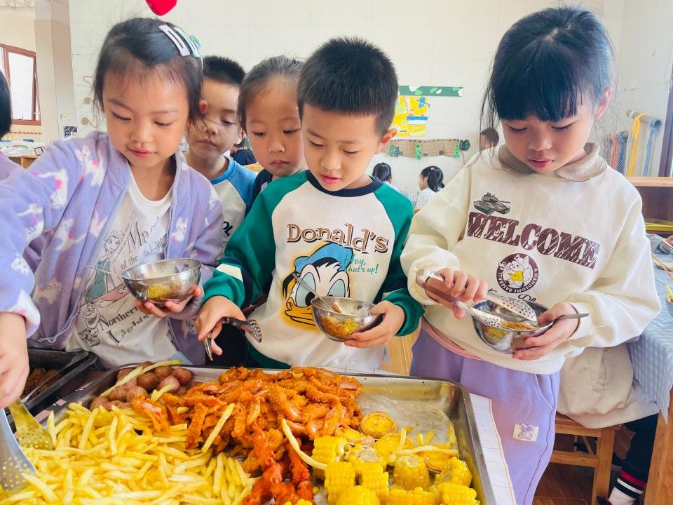 自助餐开始啦!面对满满一桌子的美食,孩子们满心欢喜,拿起餐具,有序地自主选择喜欢的食物,快乐地往返于食物和餐桌之间,尽情享受着自助餐的乐趣。
