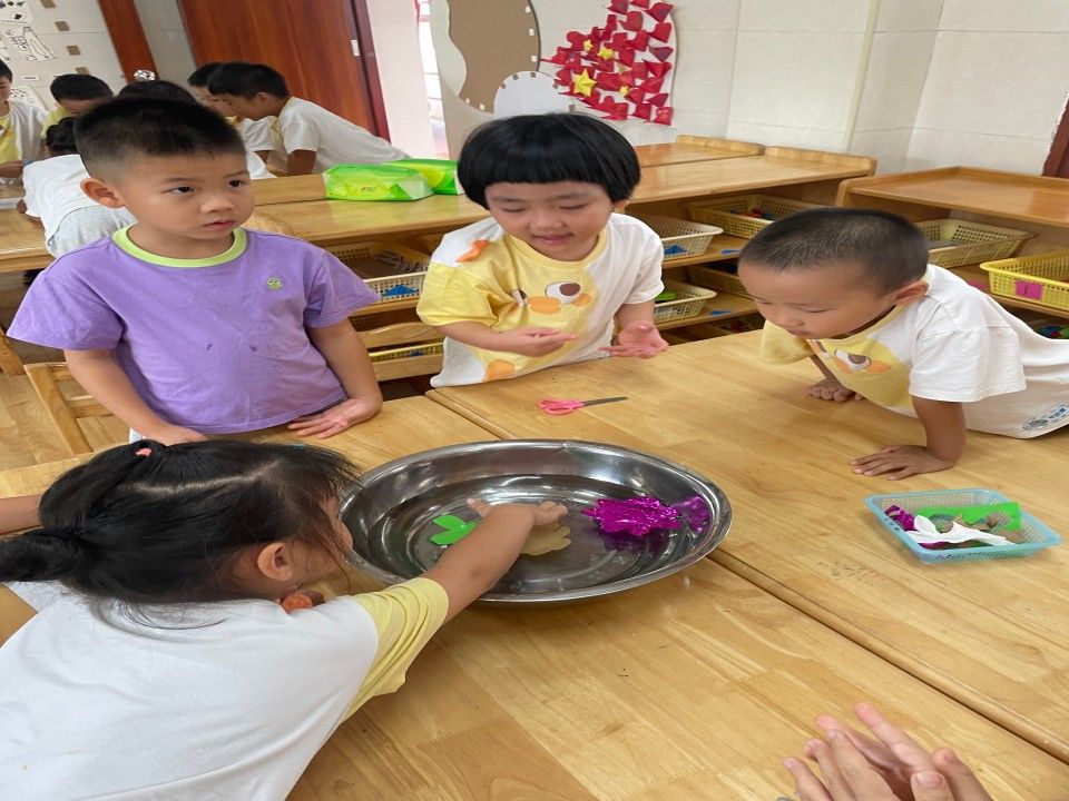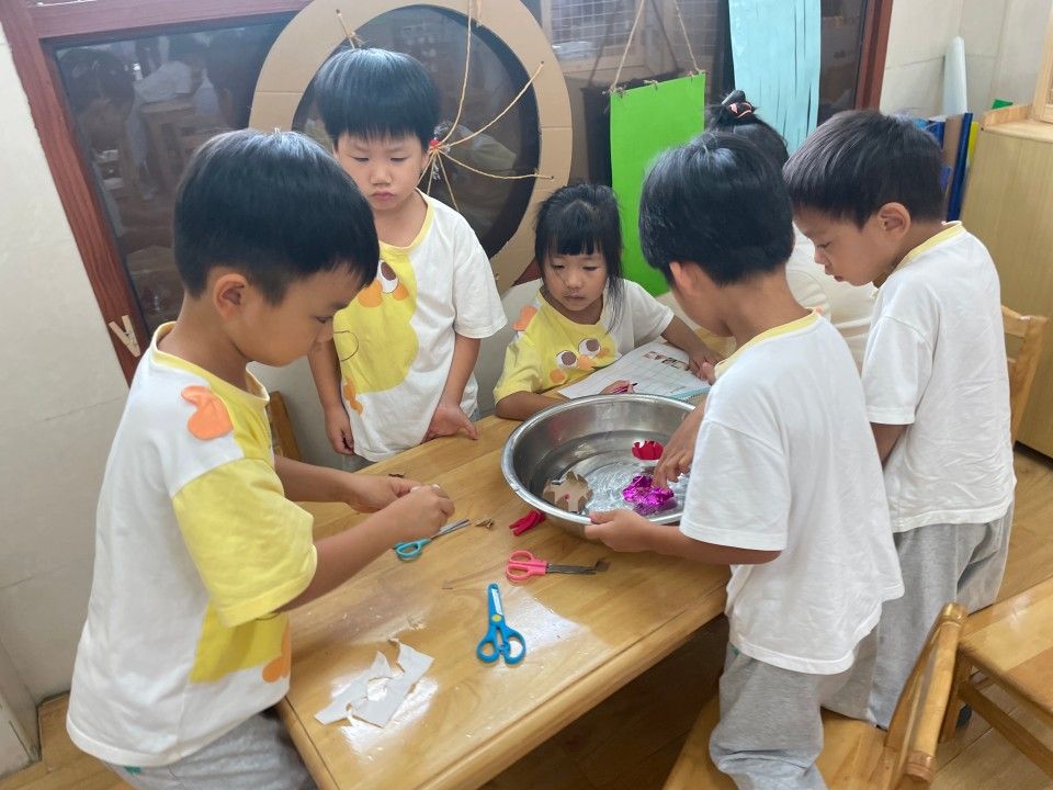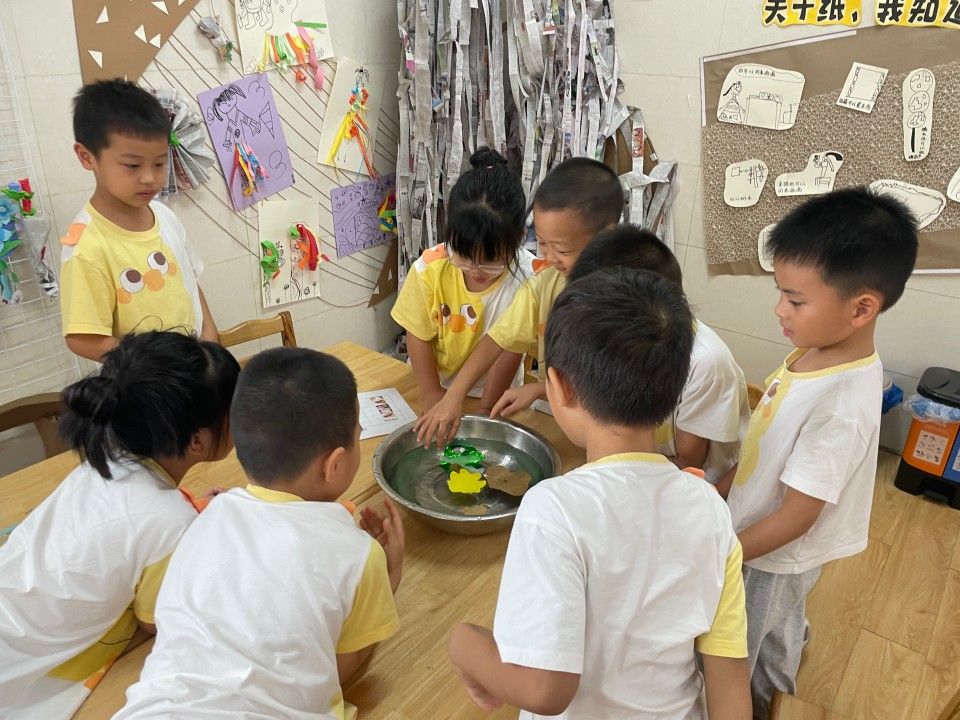 看!孩子们正进行着一场别开生面的科学探究活动。他们围在桌旁,他们的面都摆放着一个装满水的脸盘。孩子们手里拿着不同种类的纸张,有的是吸水性强的吸墨纸,有的则是普通的打印纸。他们小心翼翼地将纸张浸入水中,观察着纸张吸水后的变化。有的纸张迅速吸水膨胀,有的则只是表面湿润。孩子们你一言我一语,讨论着纸张吸水性的不同,脸上洋溢着对知识的渴望和探索的喜悦。