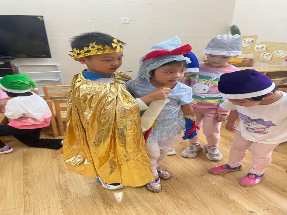 在表演游戏中,孩子们更是展现出了无限的活力和创造力。他们身着色彩鲜艳的服装,分别扮演着《白雪公主》和《汪汪队立大功》中的角色。《白雪公主》中的孩子们,模仿着公主和七个小矮人的故事,通过对话和动作,将这个经典童话生动地呈现在大家面前。而《汪汪队》的小演员们,则通过一系列的救援行动,传递出勇敢和团队合作的精神。