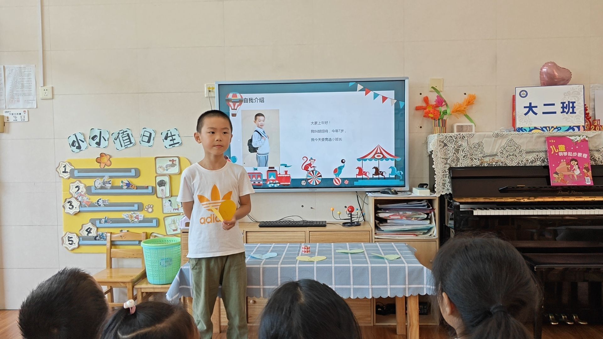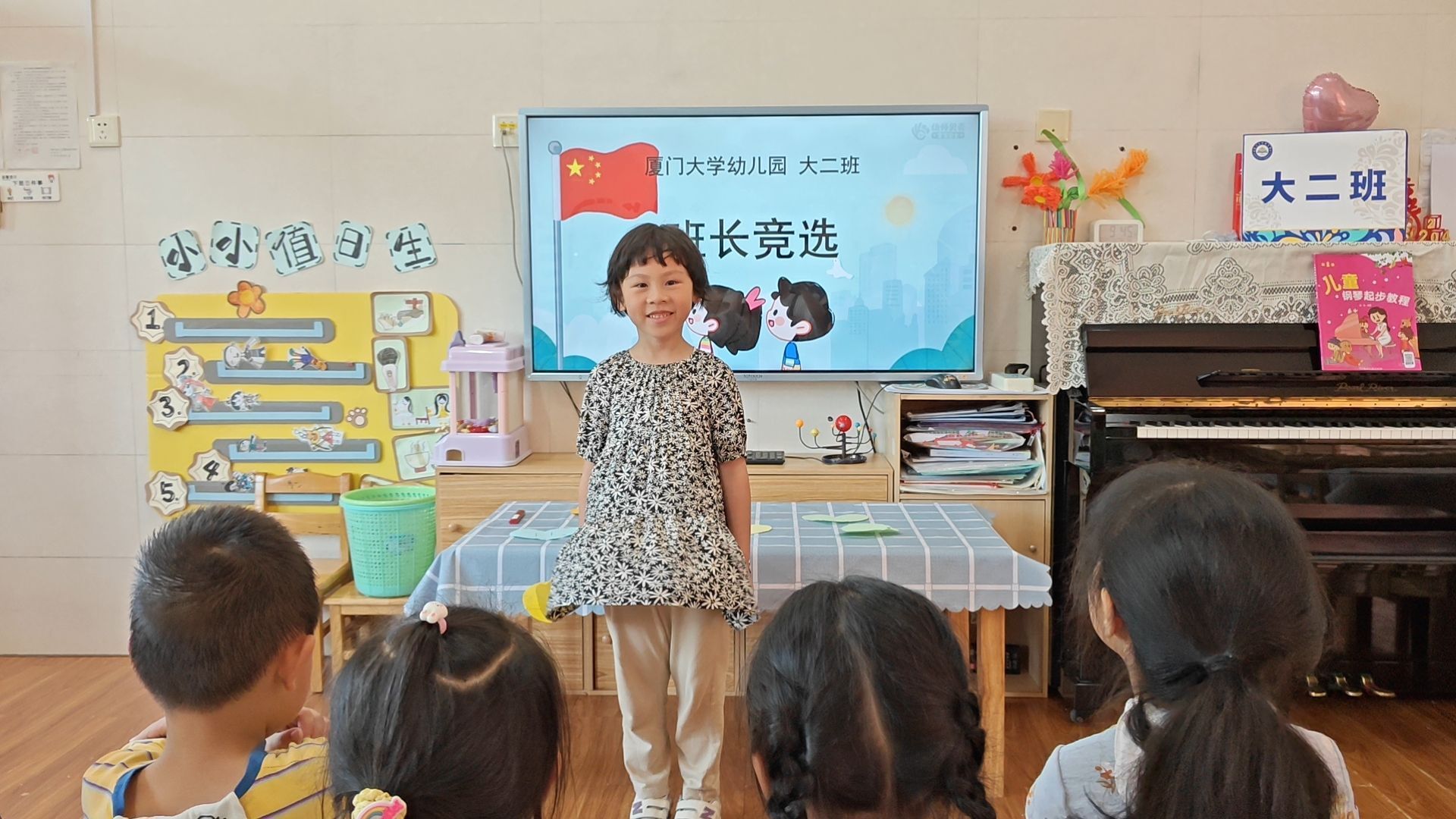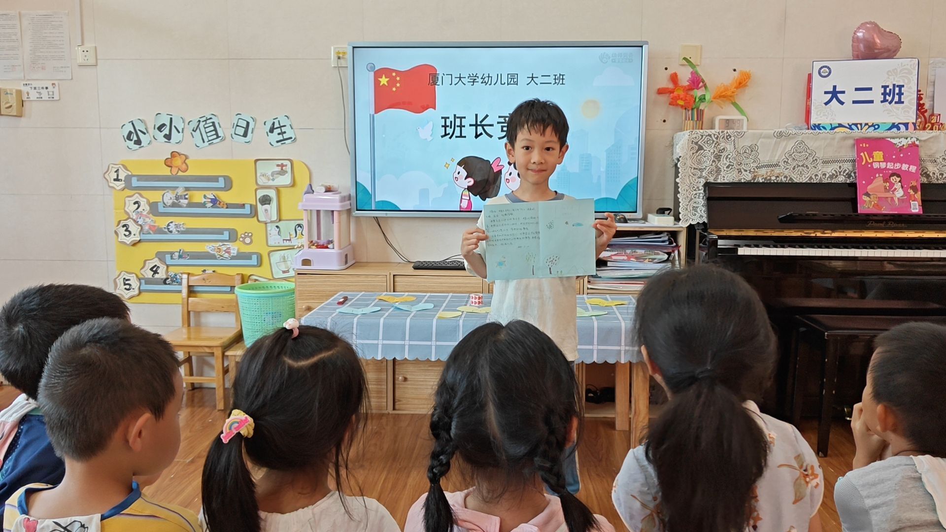 “呦,呦,我来当小班长,带头树榜样。服务大二班,数我最能干……”