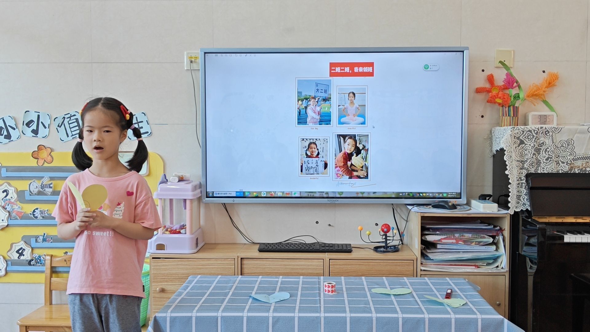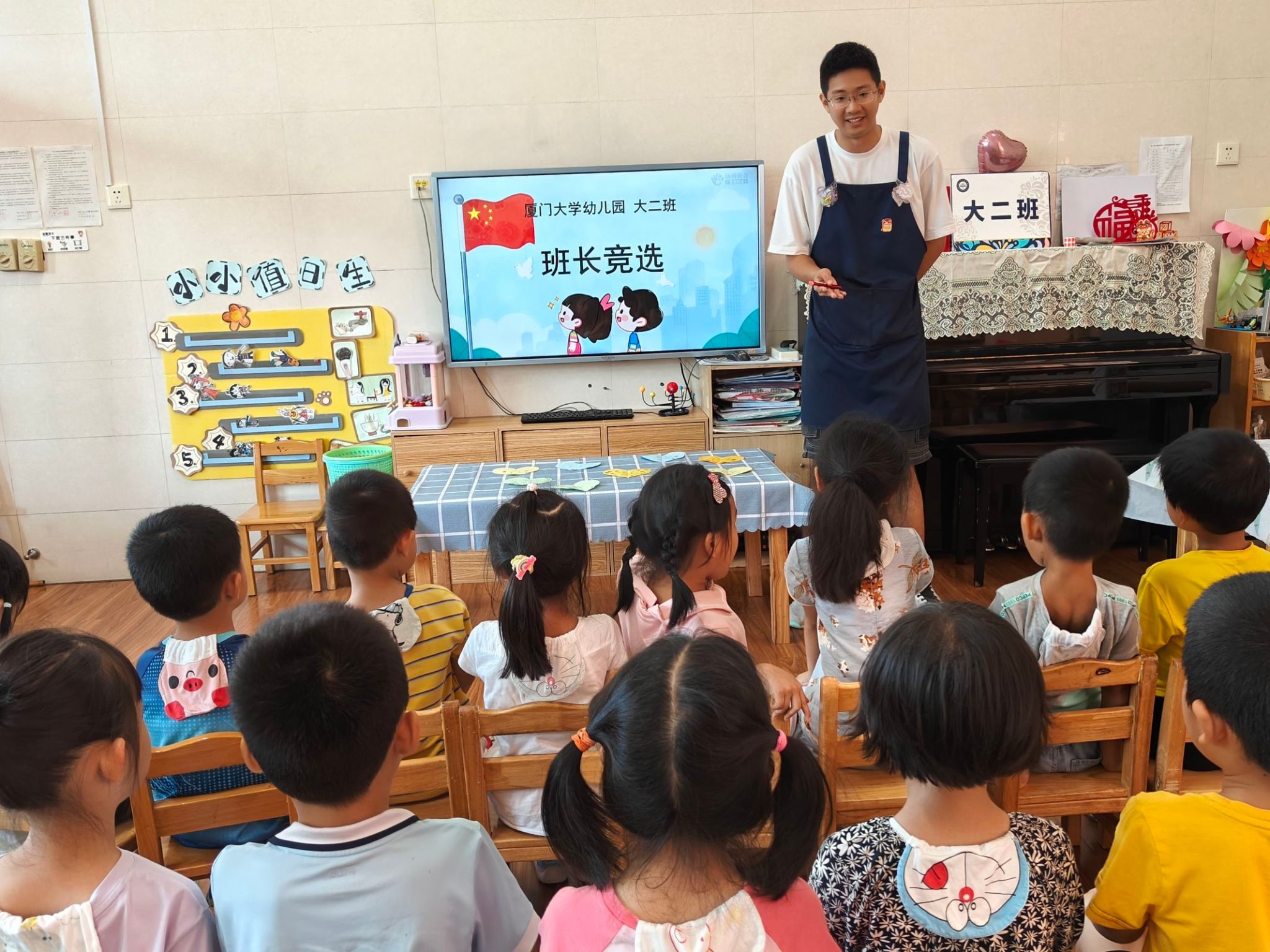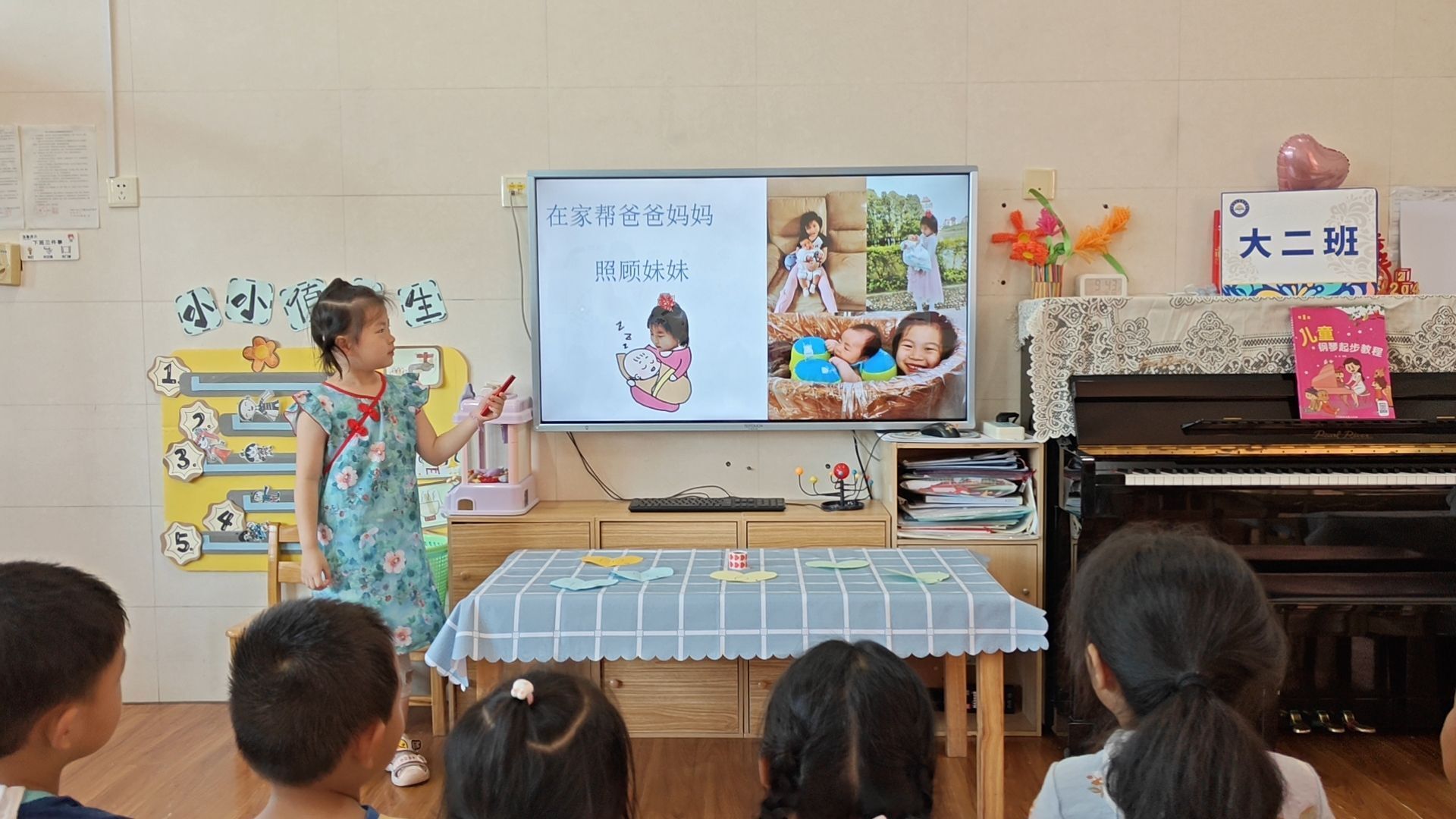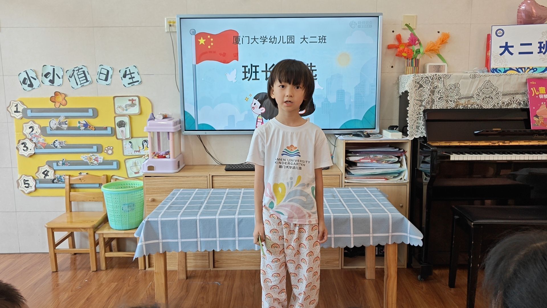 “呦,呦,我来当小班长,带头树榜样。服务大二班,数我最能干……”