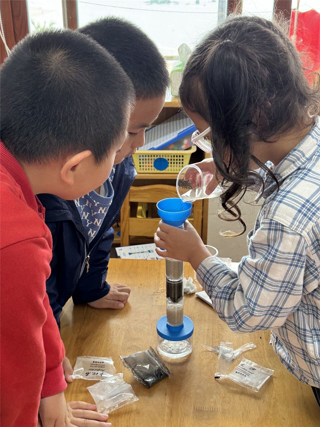 大学生助教们给宝贝们出示了污水、过滤试管、塑料管、塑料杯、花岗岩石子、瓷砂、活性炭、石英砂、海绵、滤纸等。经过讨论,大家一致决定制作过滤器,将污水过滤成干净的清水,我们一起来看看污水发生的神奇变化吧!