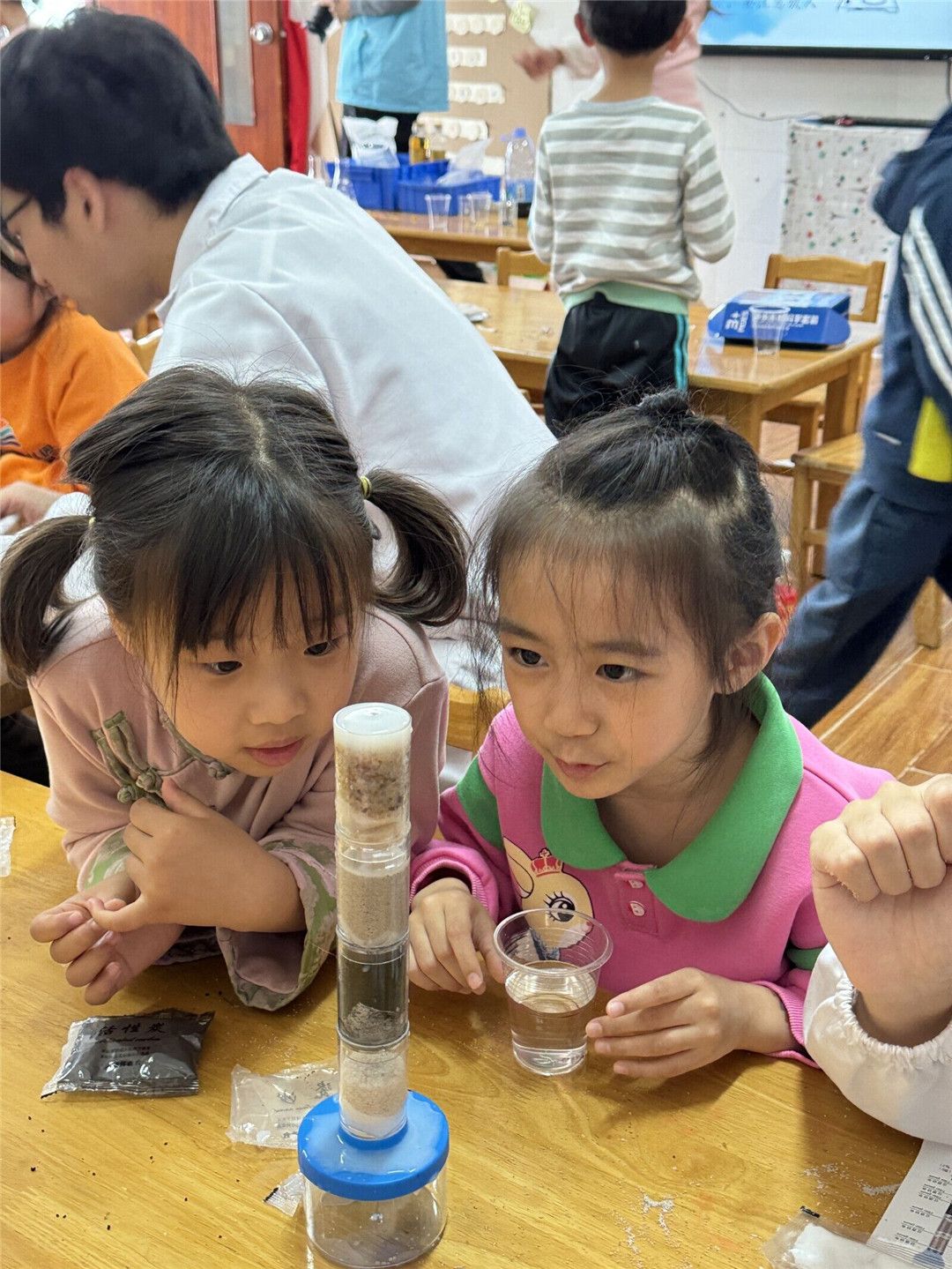 了解完关于水的小知识,大学生助教们告诉了宝贝们一个能把水变干净的好办法!“它和水龙头里流出来的水一样吗?”“怎么把水变干净?”宝贝们带着问题开始探索把水变干净的方法啦!