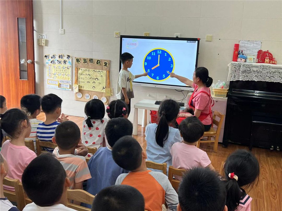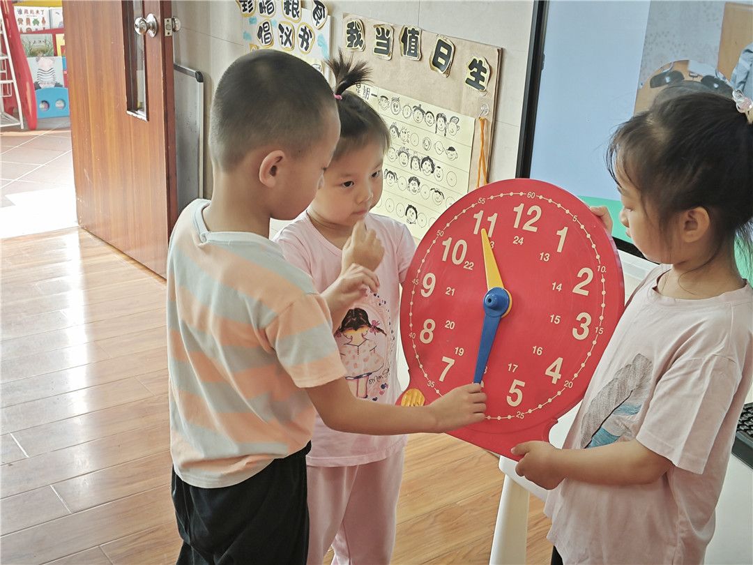 大三班的孩子们感知时间的秘密,想成为时间的“小主人”,第一件事当然是认识时钟啦!通过活动的开展,孩子们了解了时针和分针的关系、认识了整点和半点。