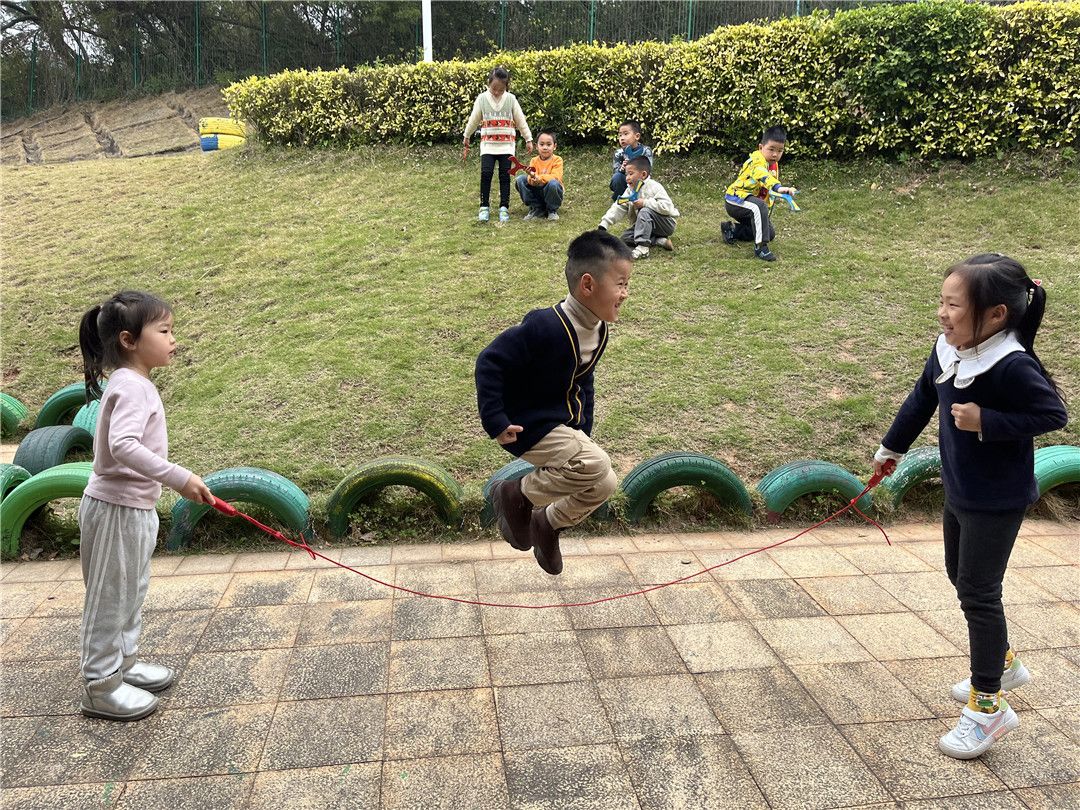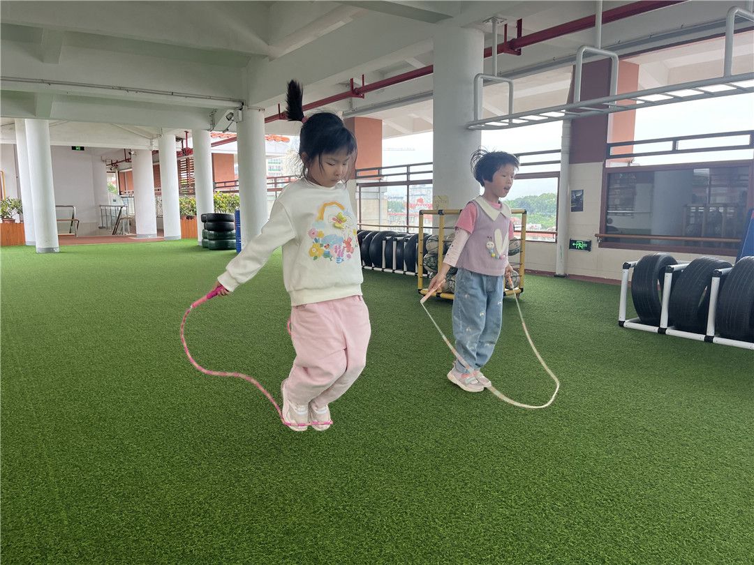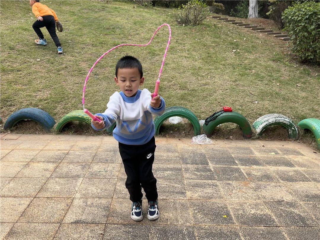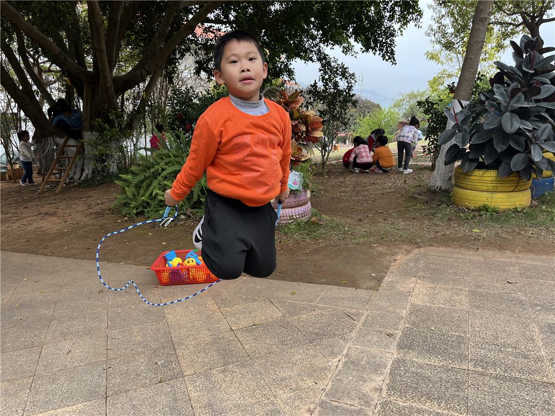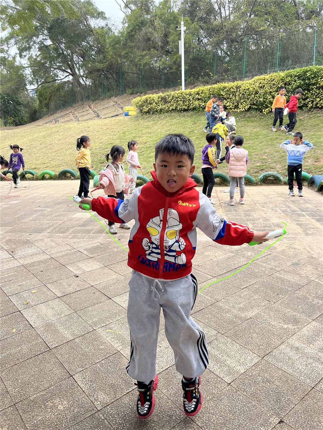 一开始宝贝们对跳绳的标准姿势、动作还不太熟悉,在活动中老师先介绍和讲解了动作的要领,户外活动的充分的时间就交给宝贝们来大胆尝试……