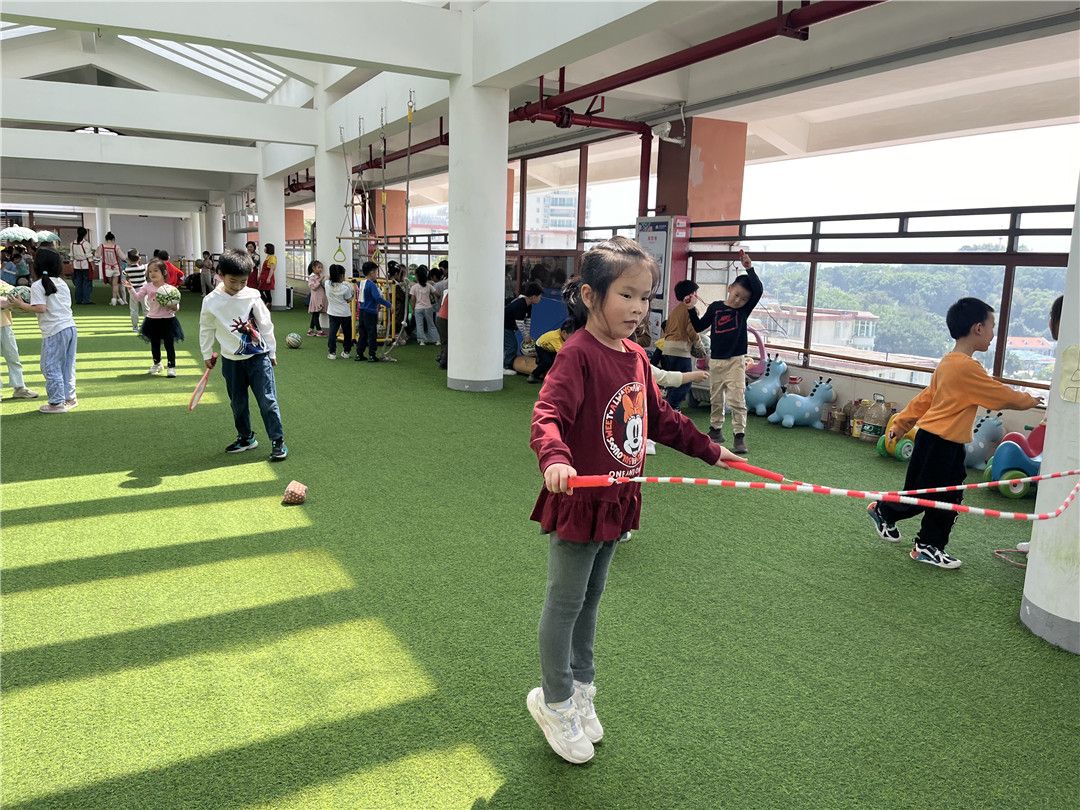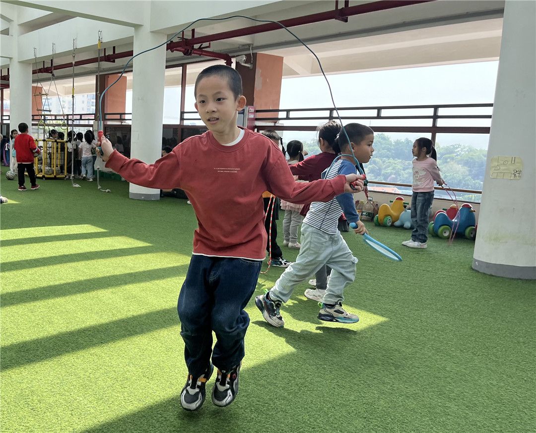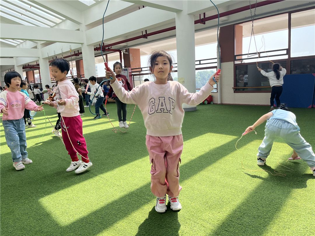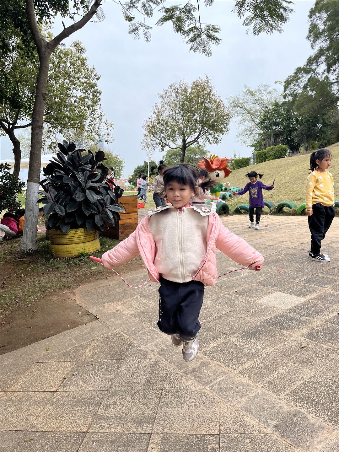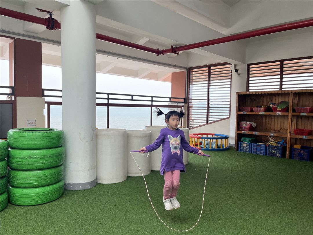 一开始宝贝们对跳绳的标准姿势、动作还不太熟悉,在活动中老师先介绍和讲解了动作的要领,户外活动的充分的时间就交给宝贝们来大胆尝试……