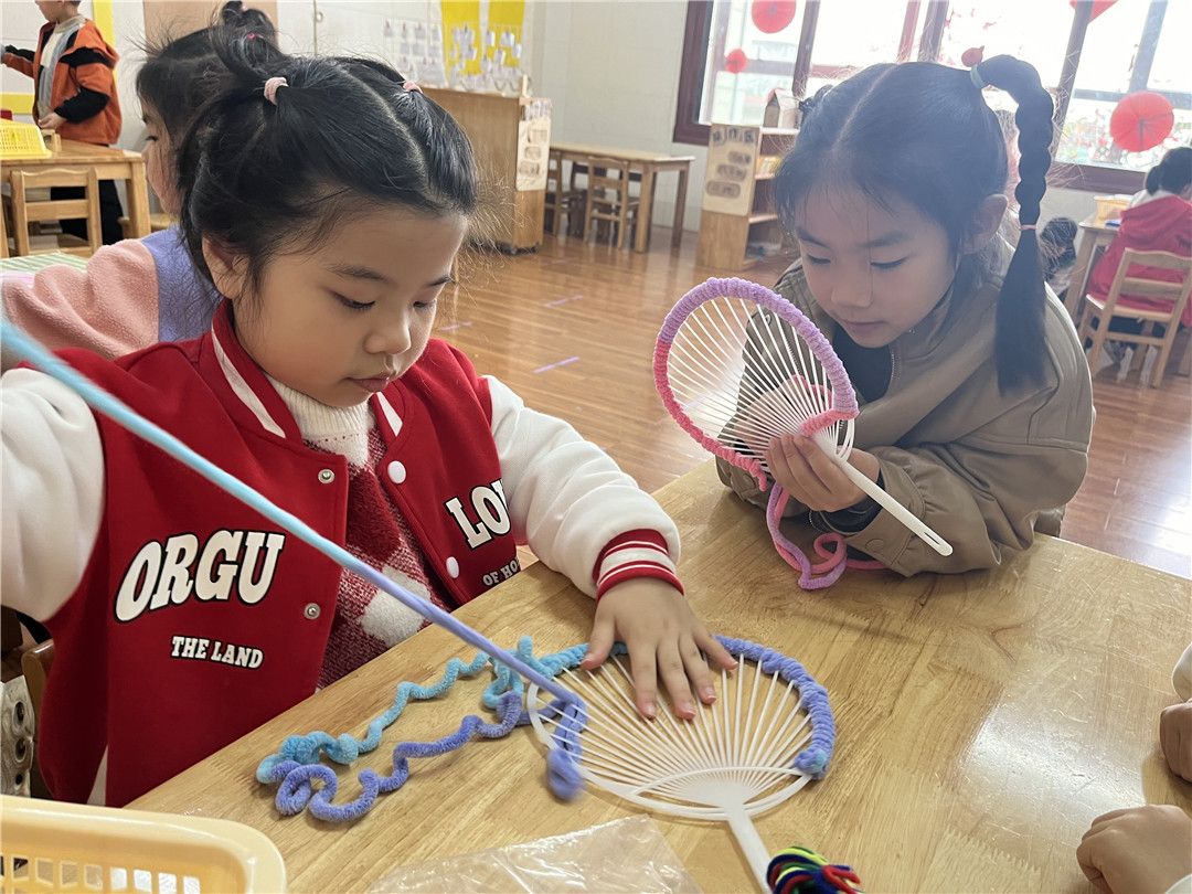 “诶你看!这里有扇子的骨架我们可以把毛线编上去!”