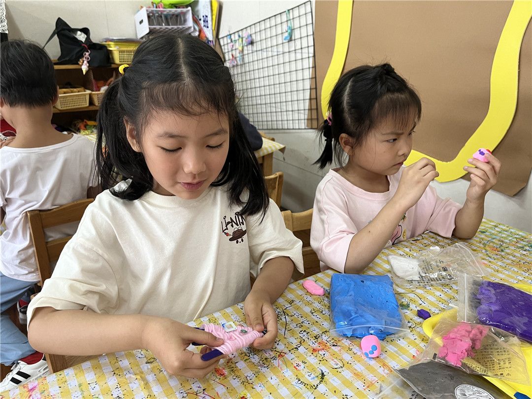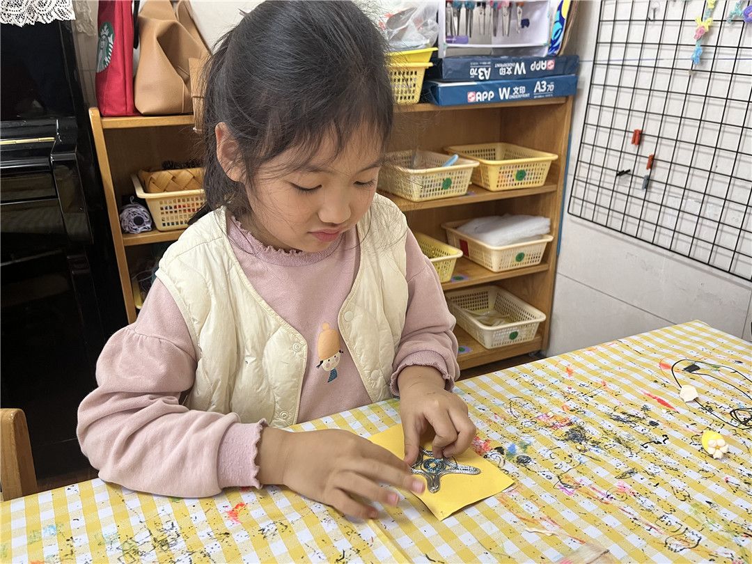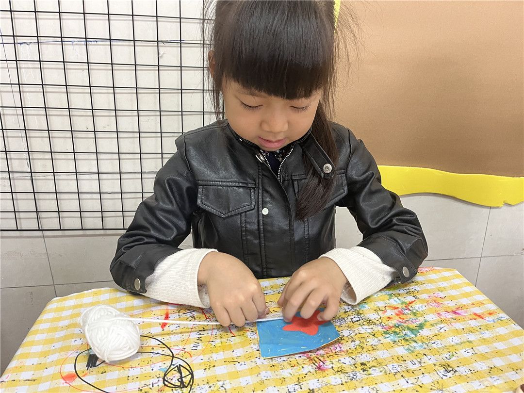 “还有这样三根雪糕棍搭在一起,再把毛钱绕上去,一只小鱼就出来了!”