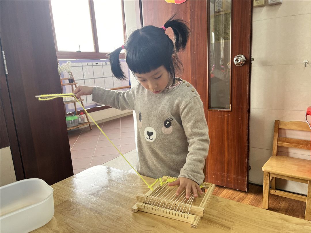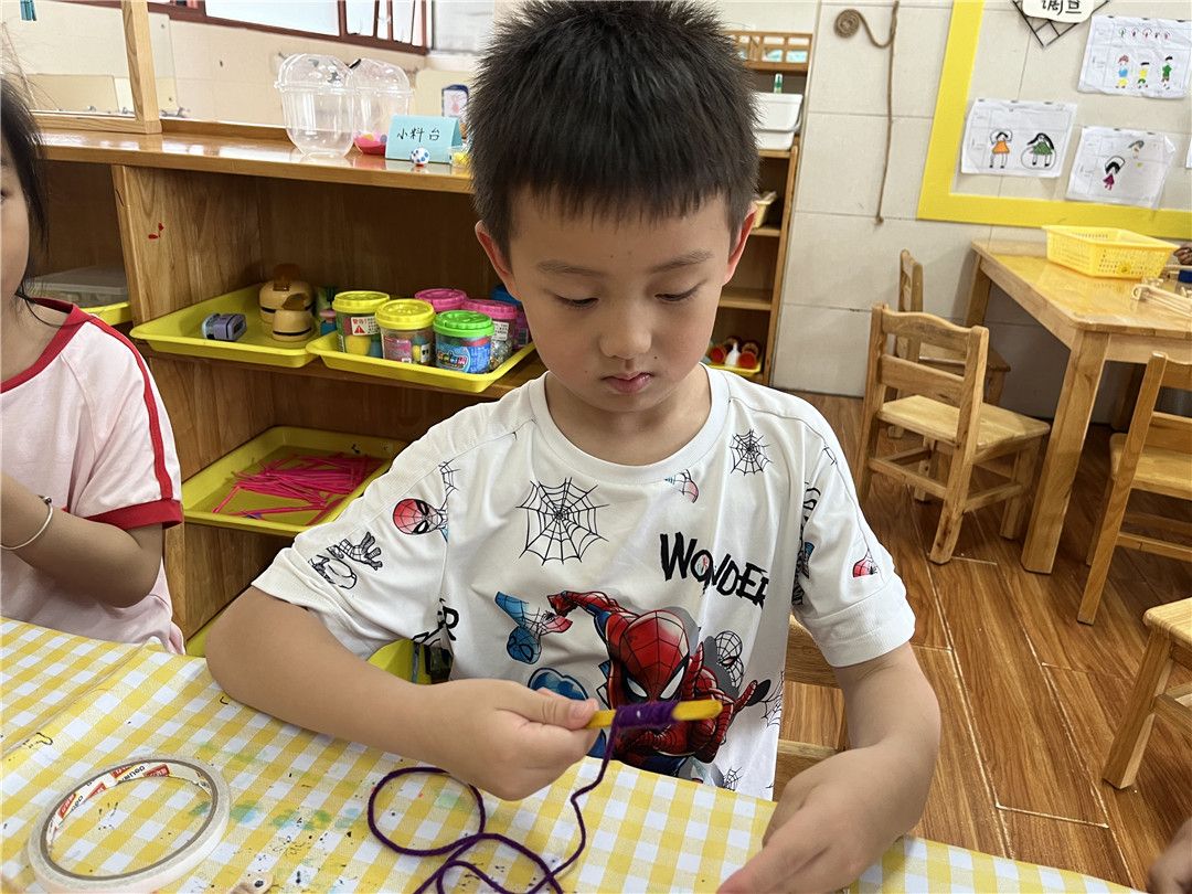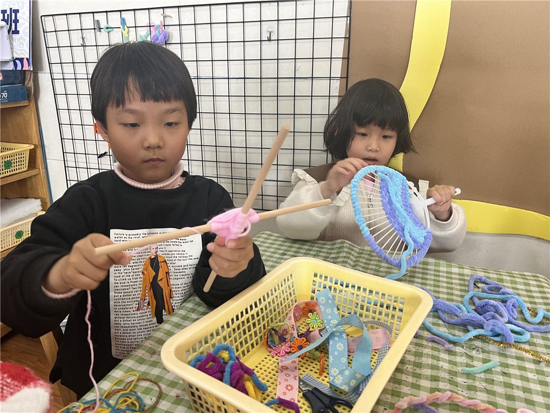 我们的区域中也新投放了各种各样的绳线,宝贝们开始讨论起来:“这些绳子我们可以怎么玩呢?”“毛线可以织毛衣,还可以编成各种好看的东西!”“这又是什么绳?我可以拿来做手工吗?”我们一起走进区角时间,看看这些新材料都能做出哪些作品……
